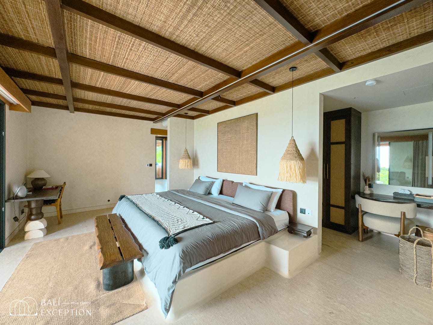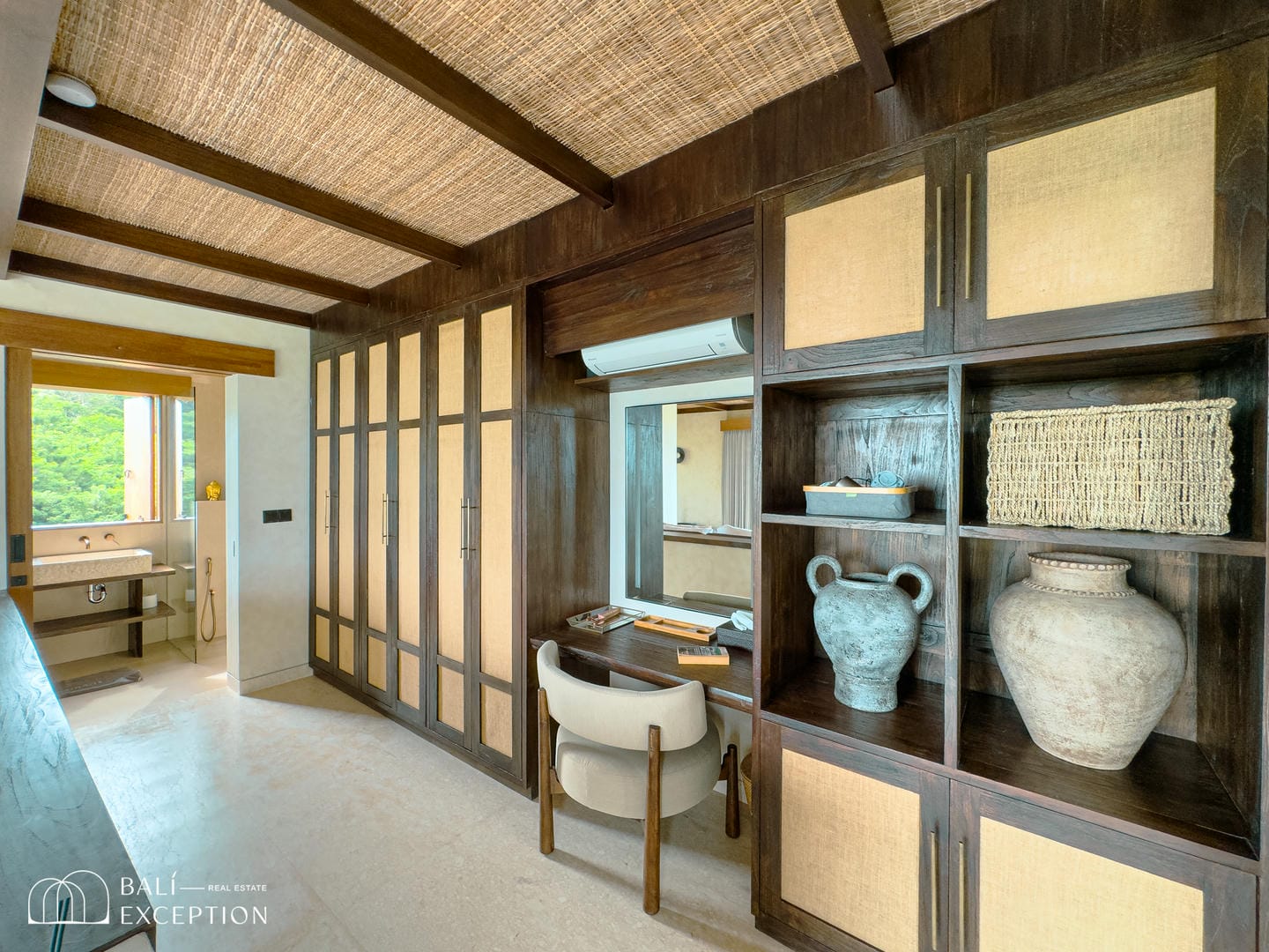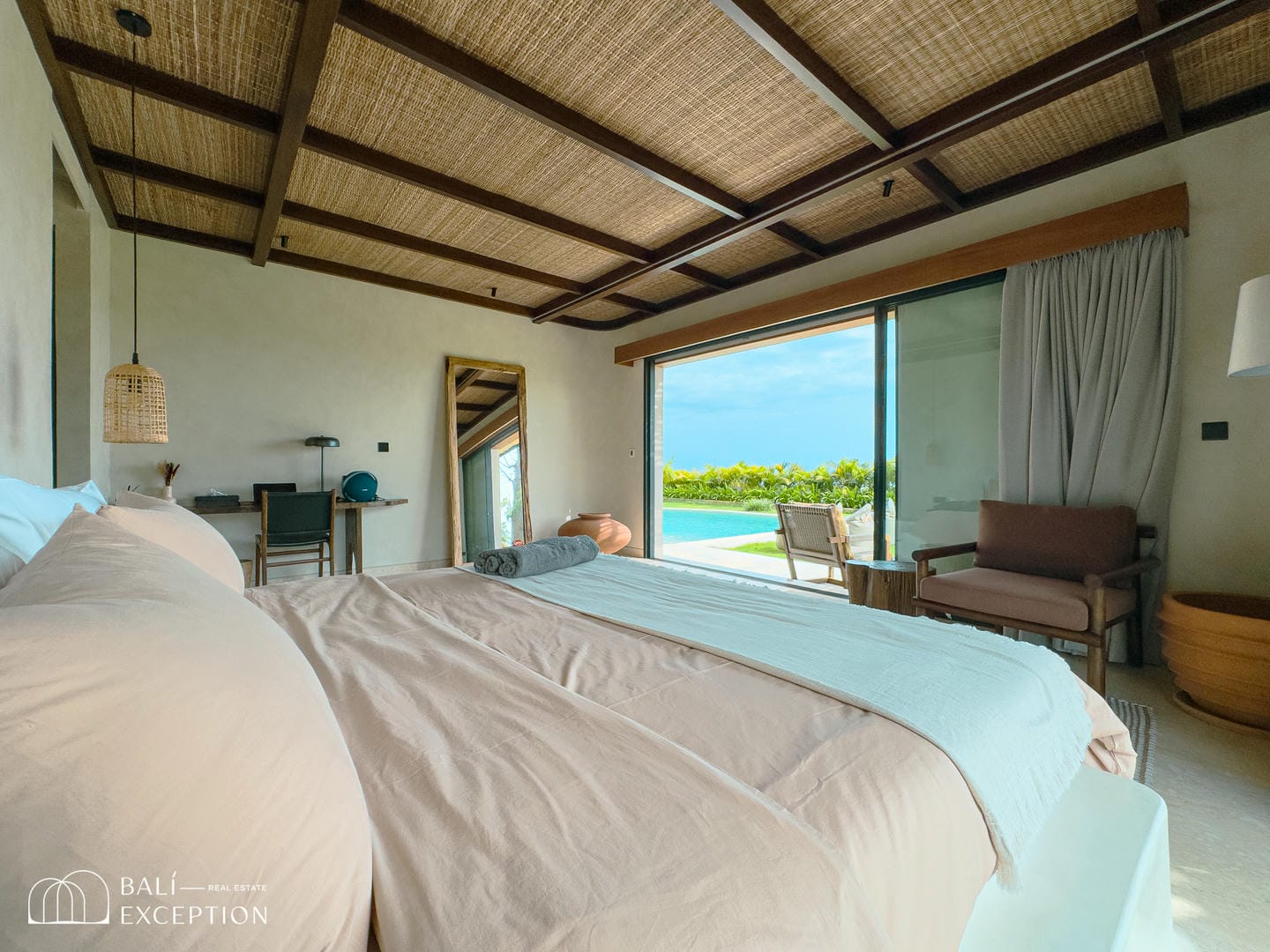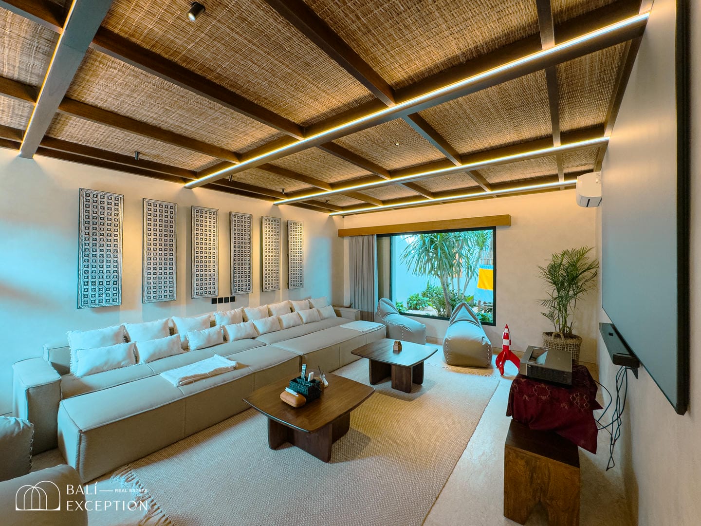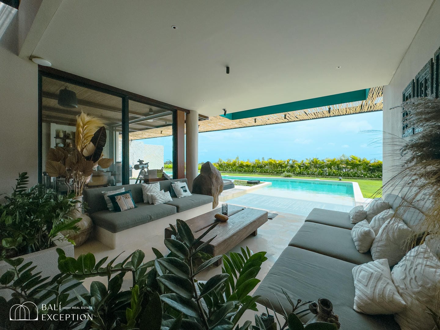 À l’intérieur, la villa présente un design tropical-moderne raffiné, mêlant textures naturelles, éléments en bois chaleureux et tons terreux. Les grands espaces ouverts, les finitions haut de gamme et la fluidité entre l’intérieur et l’extérieur créent une atmosphère luxueuse mais décontractée dans les pièces de vie et de repas.