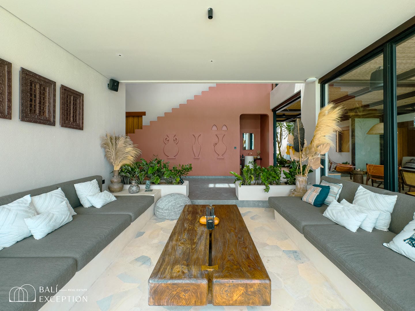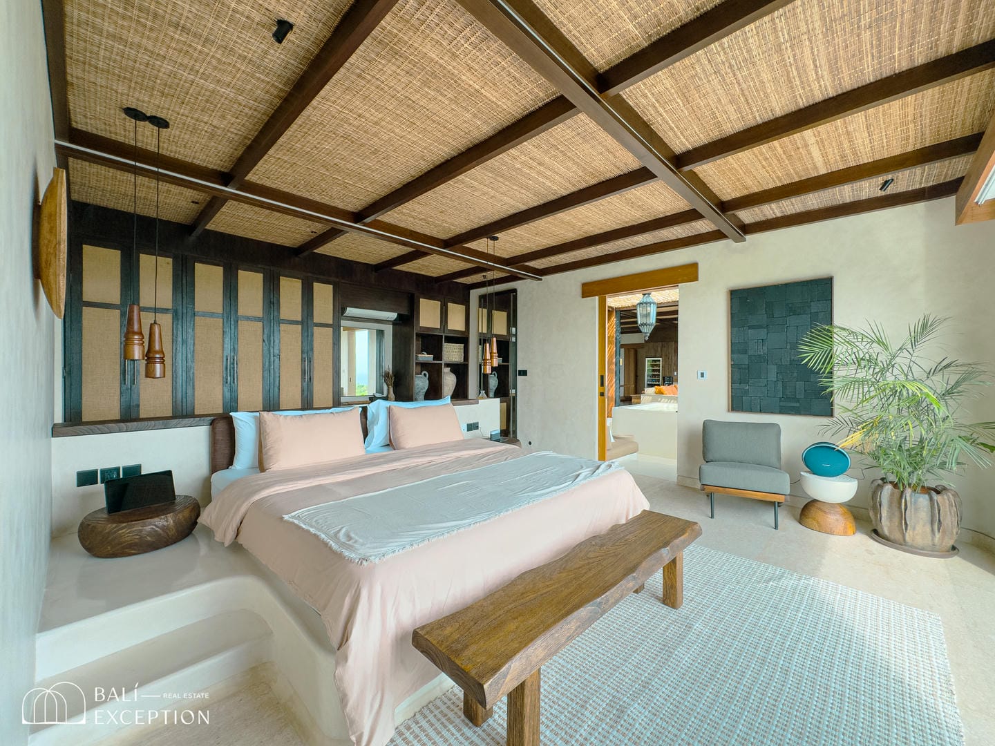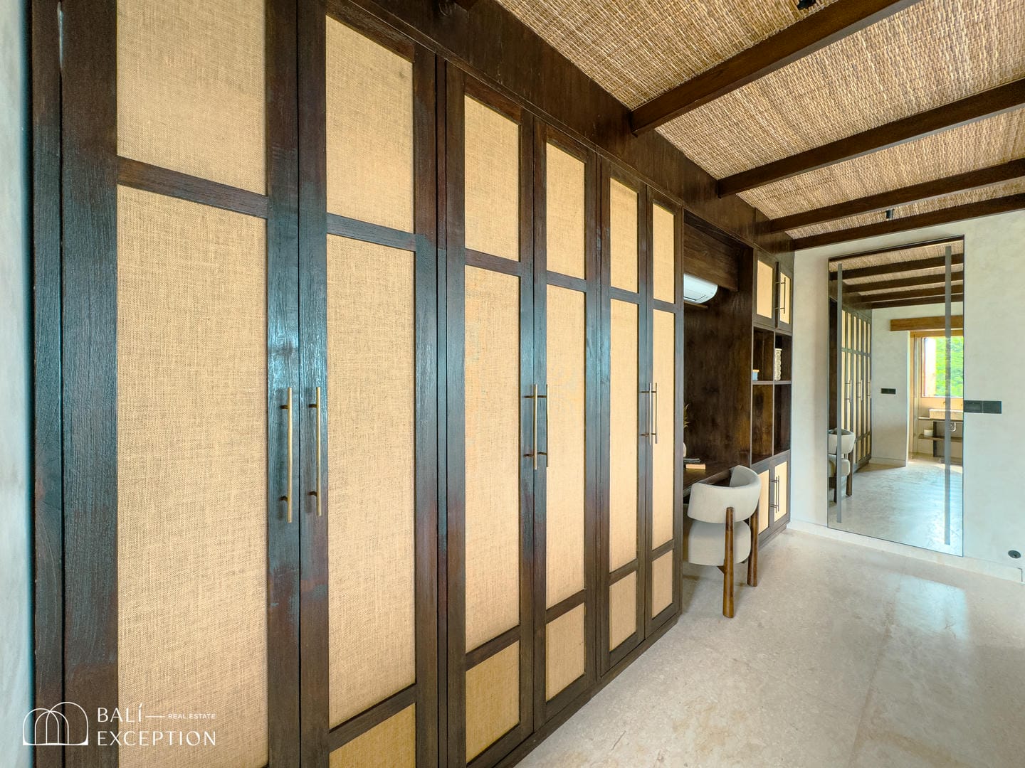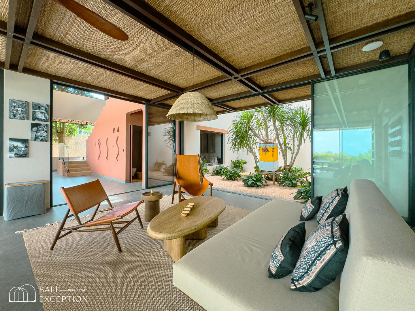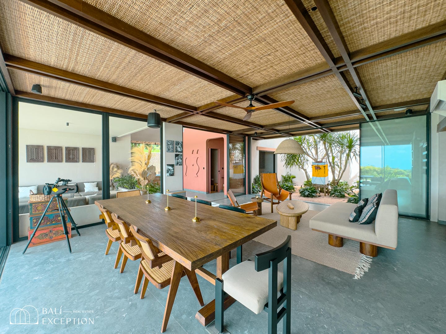 À l’intérieur, la villa présente un design tropical-moderne raffiné, mêlant textures naturelles, éléments en bois chaleureux et tons terreux. Les grands espaces ouverts, les finitions haut de gamme et la fluidité entre l’intérieur et l’extérieur créent une atmosphère luxueuse mais décontractée dans les pièces de vie et de repas.