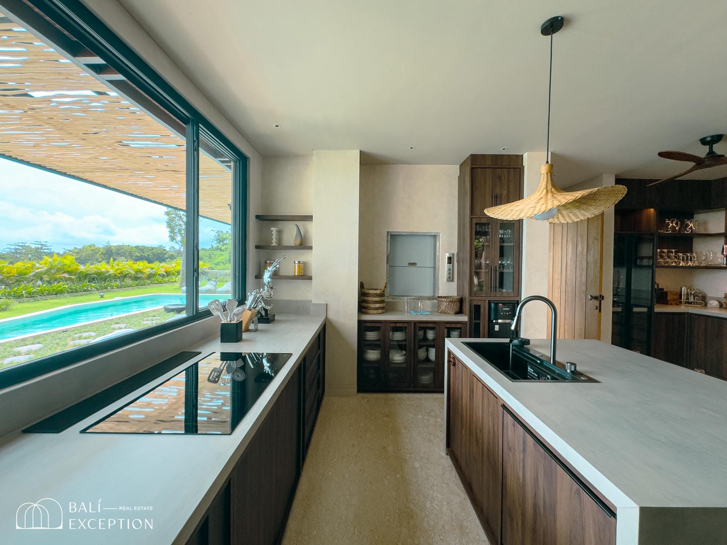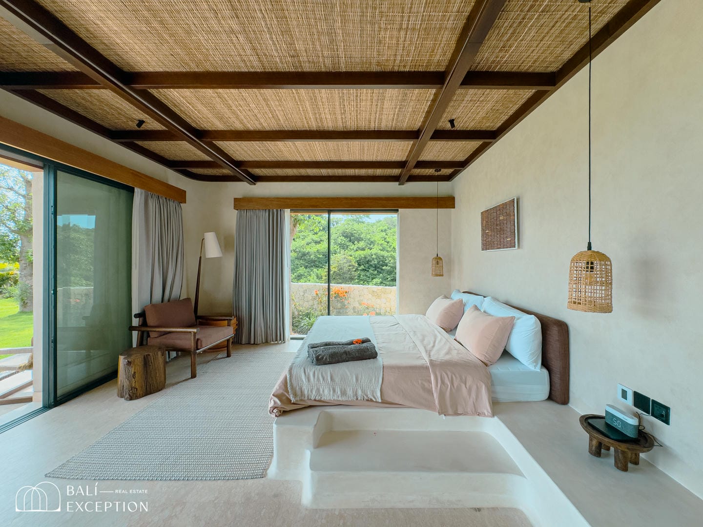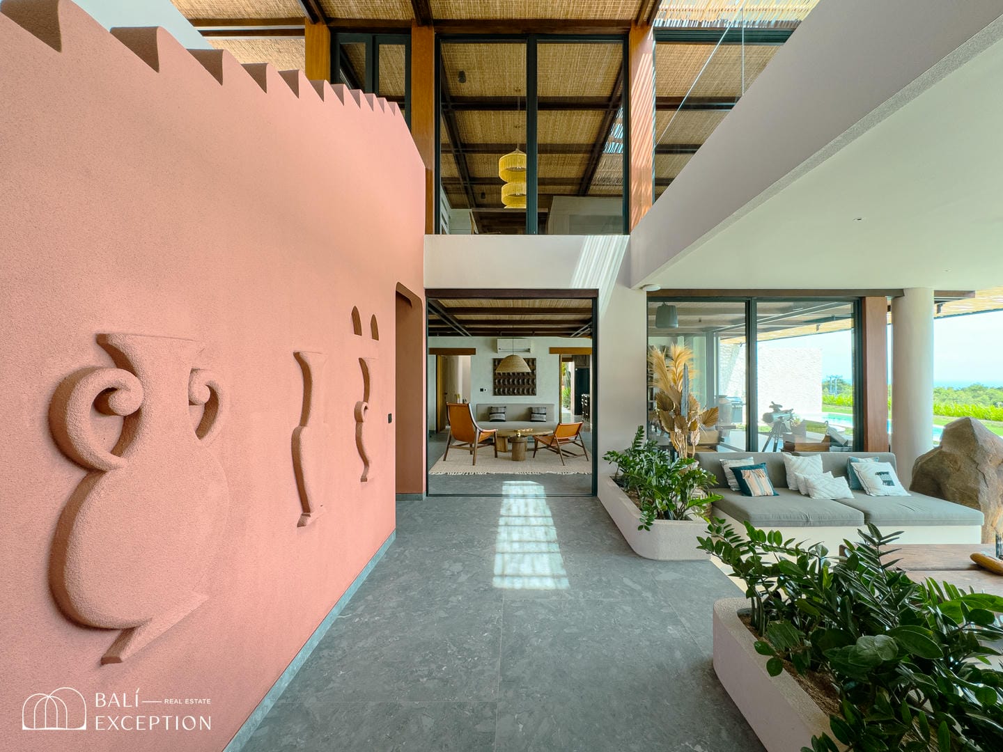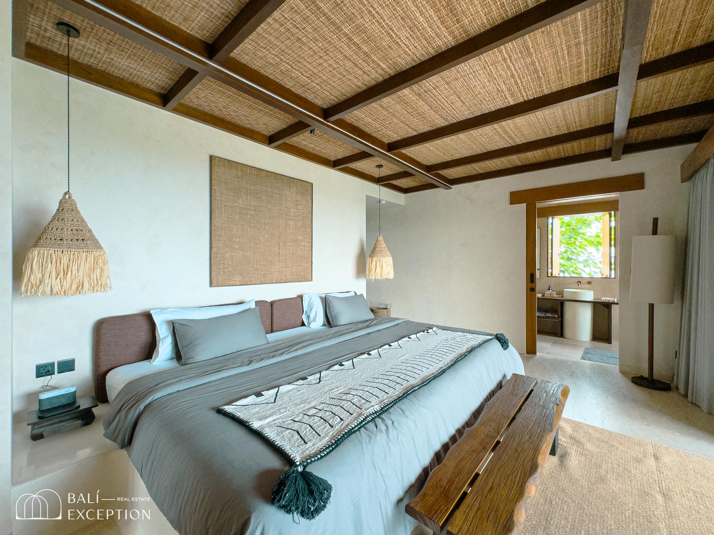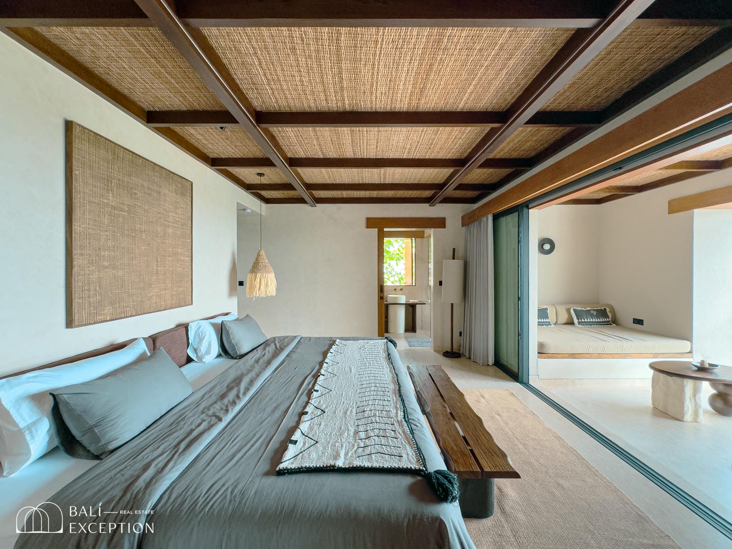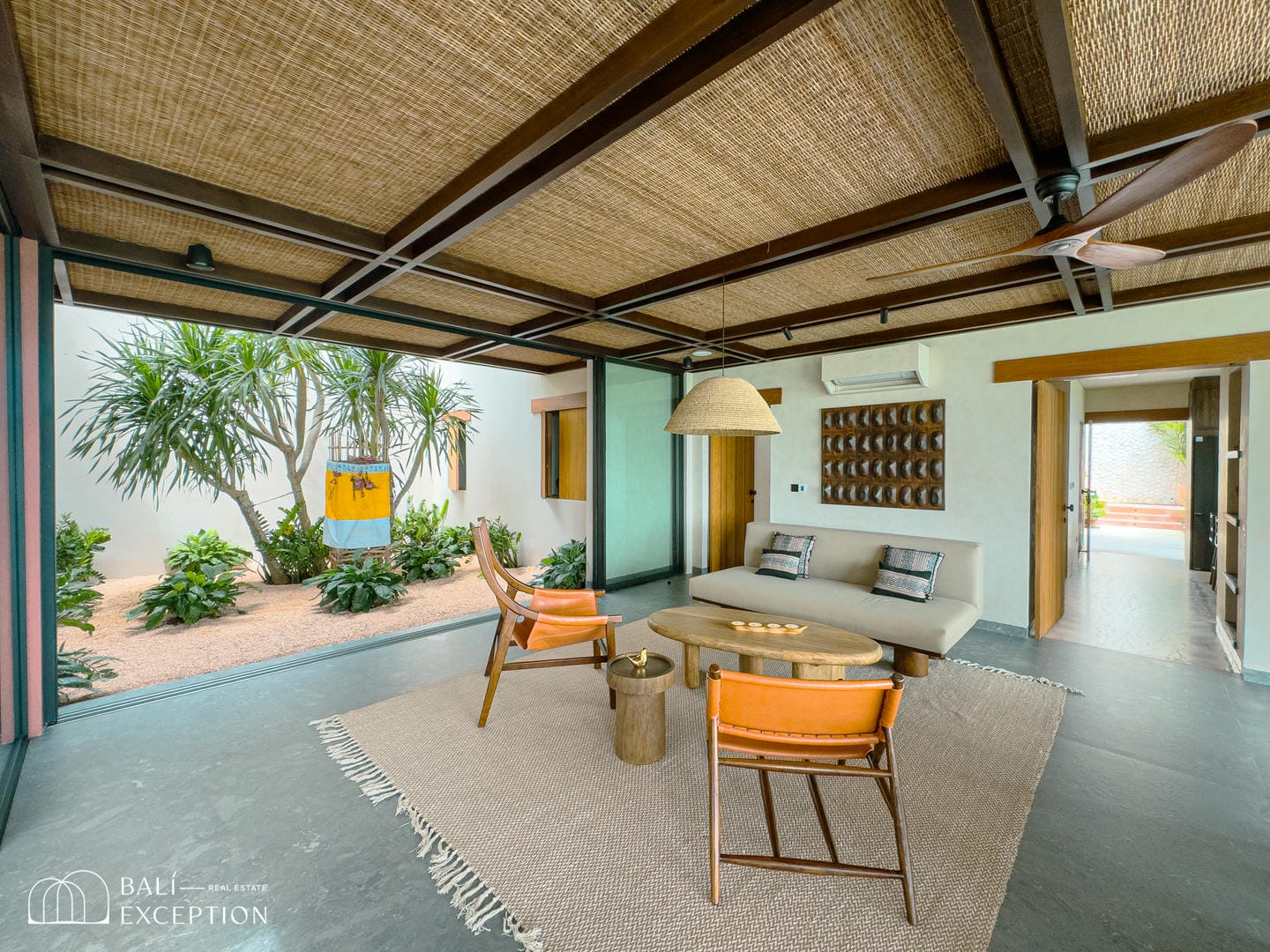 À l’intérieur, la villa présente un design tropical-moderne raffiné, mêlant textures naturelles, éléments en bois chaleureux et tons terreux. Les grands espaces ouverts, les finitions haut de gamme et la fluidité entre l’intérieur et l’extérieur créent une atmosphère luxueuse mais décontractée dans les pièces de vie et de repas.