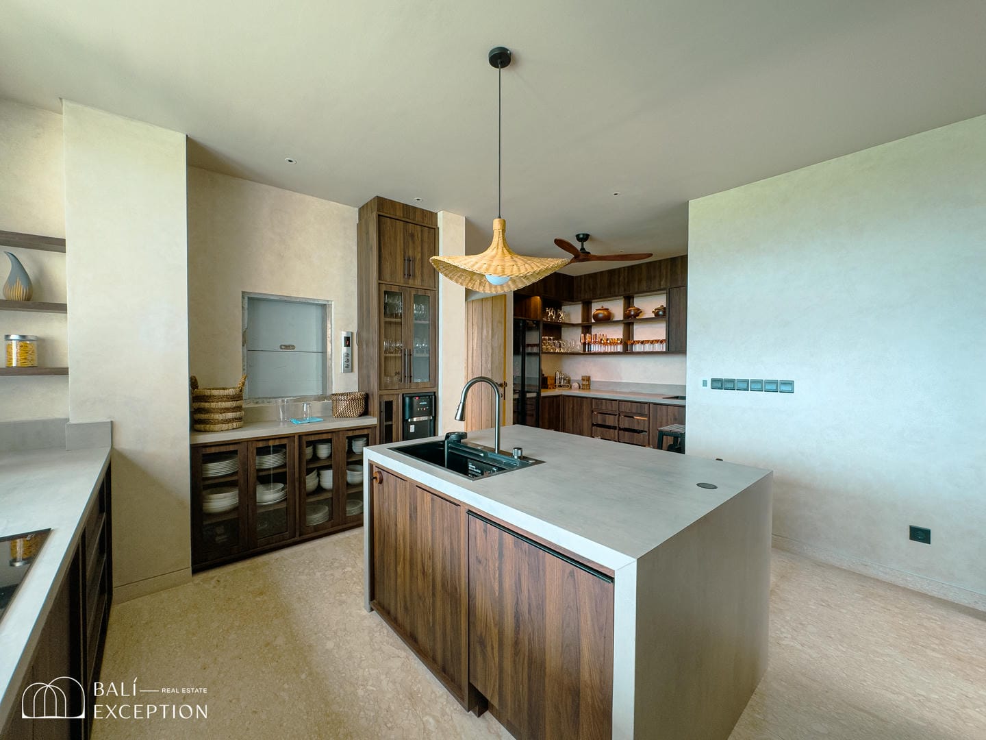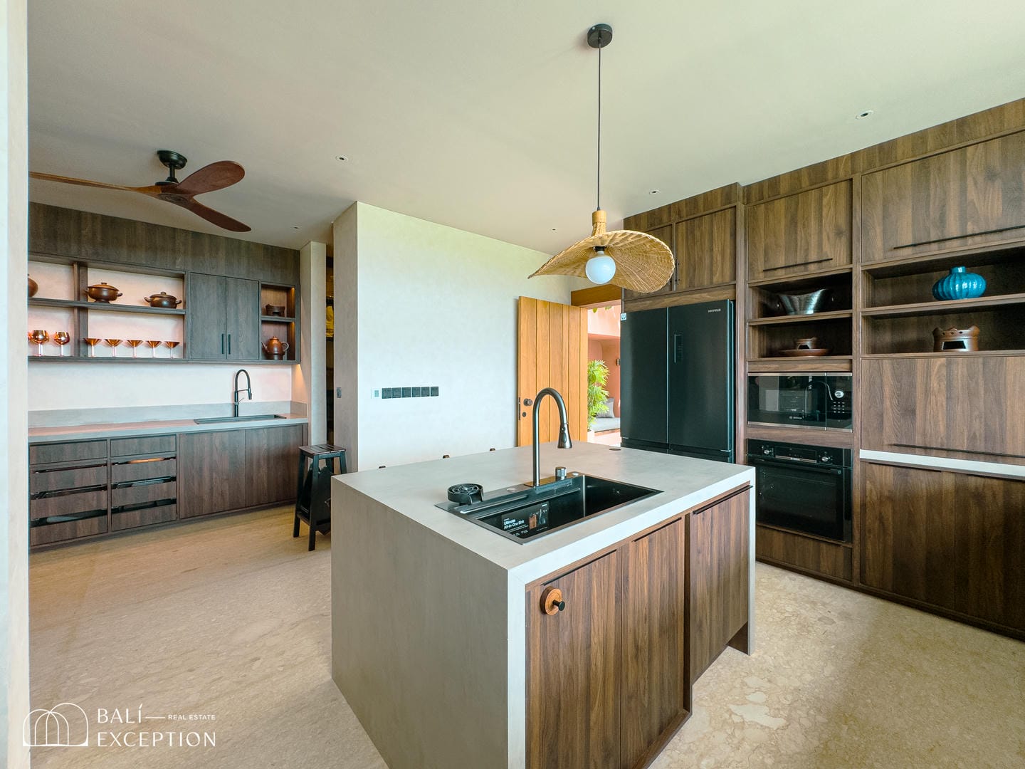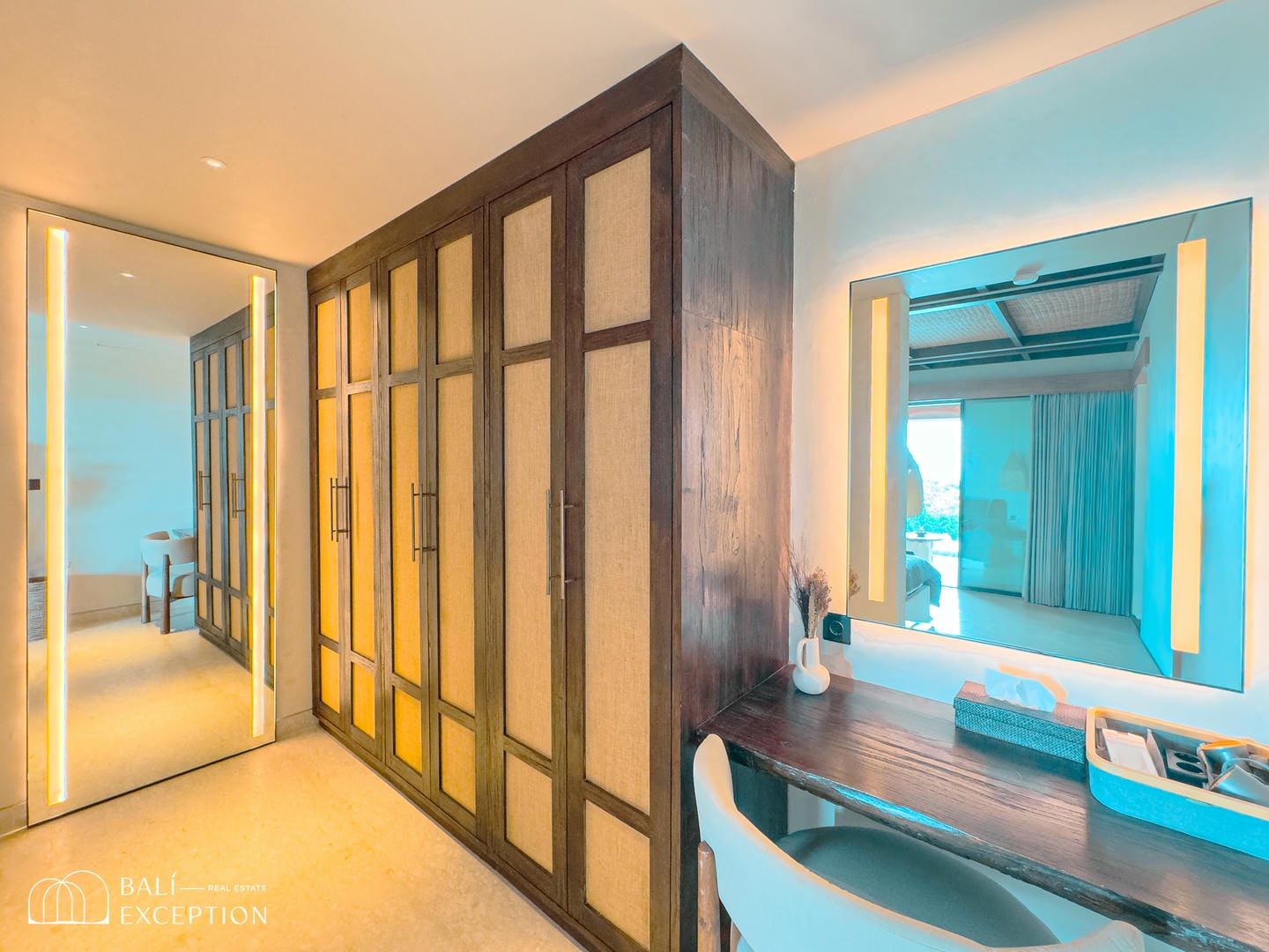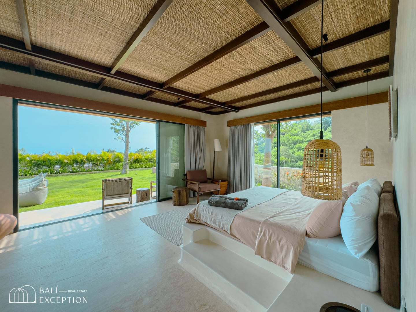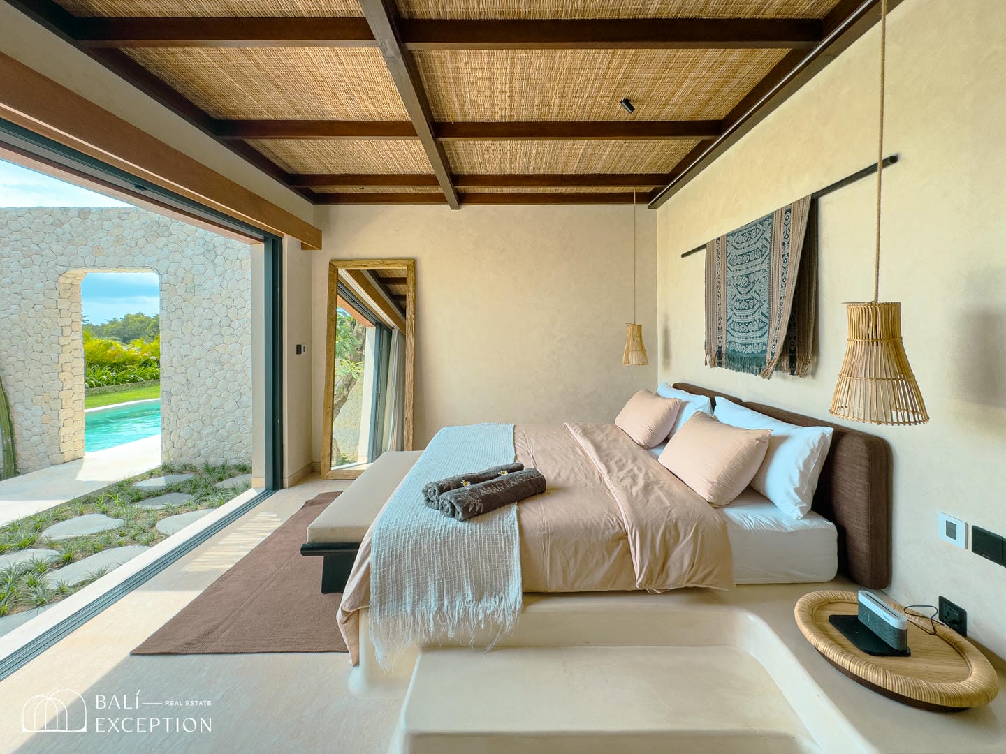 À l’intérieur, la villa présente un design tropical-moderne raffiné, mêlant textures naturelles, éléments en bois chaleureux et tons terreux. Les grands espaces ouverts, les finitions haut de gamme et la fluidité entre l’intérieur et l’extérieur créent une atmosphère luxueuse mais décontractée dans les pièces de vie et de repas.