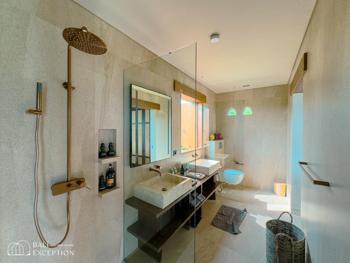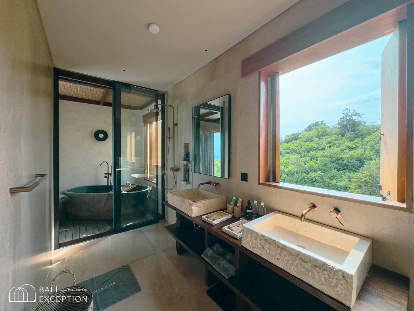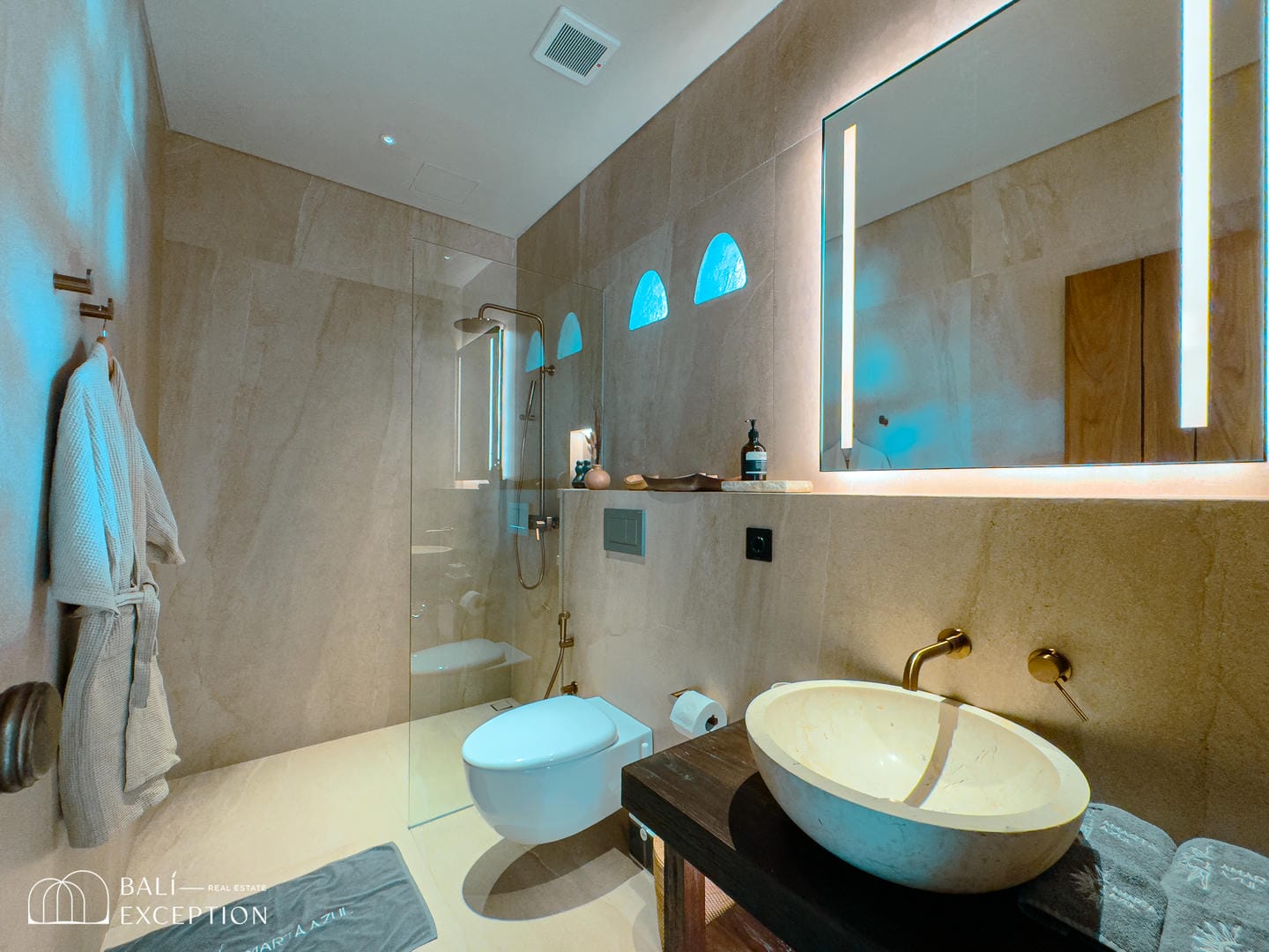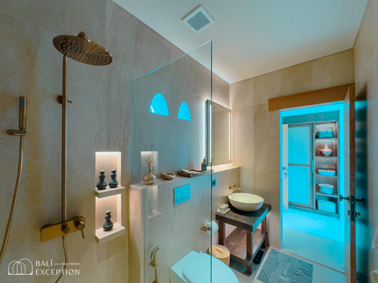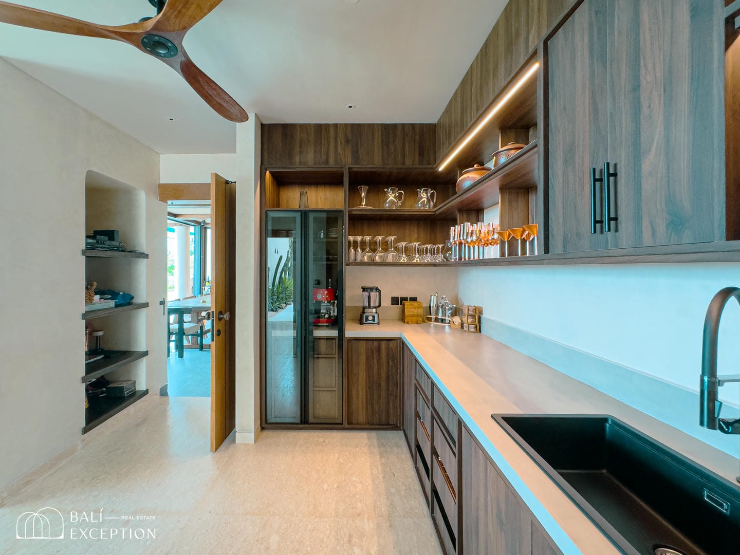 À l’intérieur, la villa présente un design tropical-moderne raffiné, mêlant textures naturelles, éléments en bois chaleureux et tons terreux. Les grands espaces ouverts, les finitions haut de gamme et la fluidité entre l’intérieur et l’extérieur créent une atmosphère luxueuse mais décontractée dans les pièces de vie et de repas.