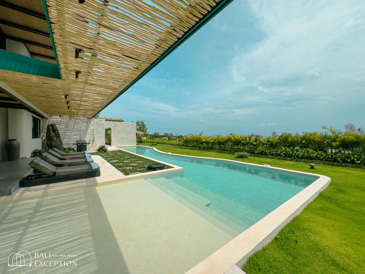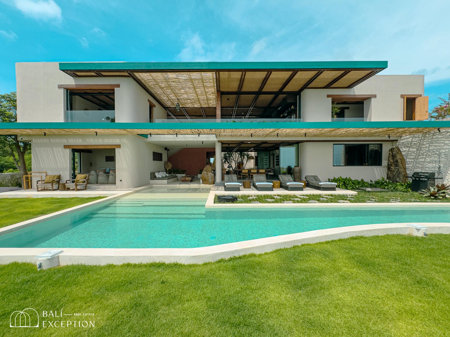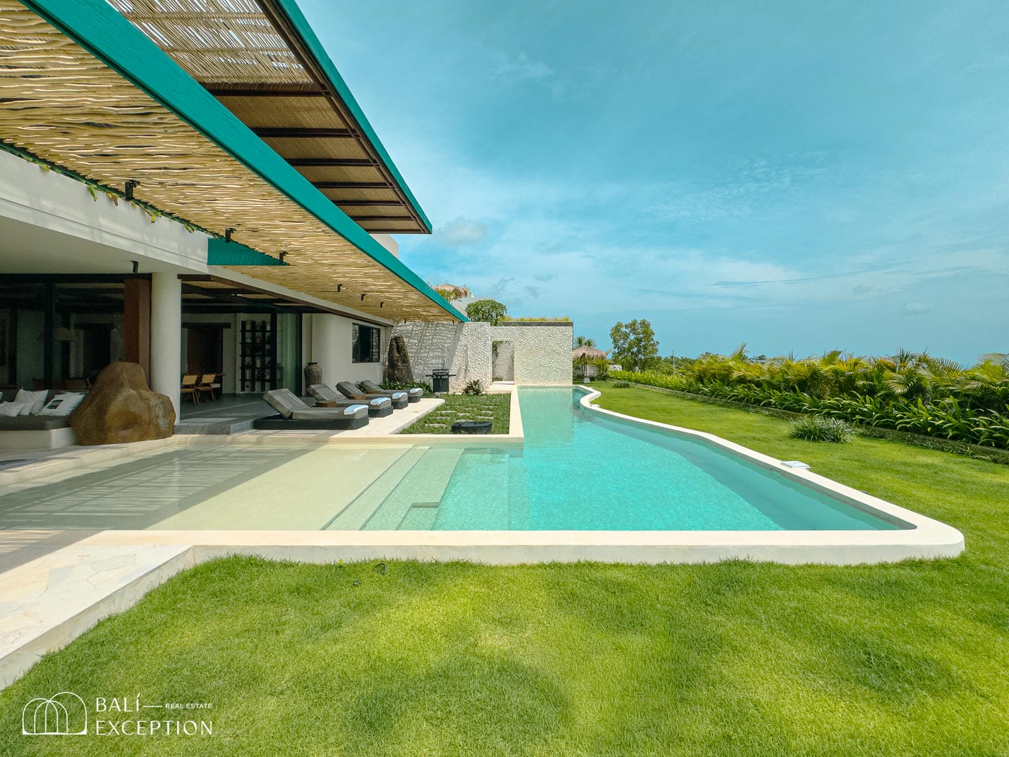 À l’extérieur, la villa dispose de vastes terrasses, d’un aménagement paysager luxuriant et d’une magnifique piscine courbée surplombant l’océan. Chaque espace principal, y compris les chambres, offre des vues panoramiques sur la mer, encadrées par une végétation abondante.
