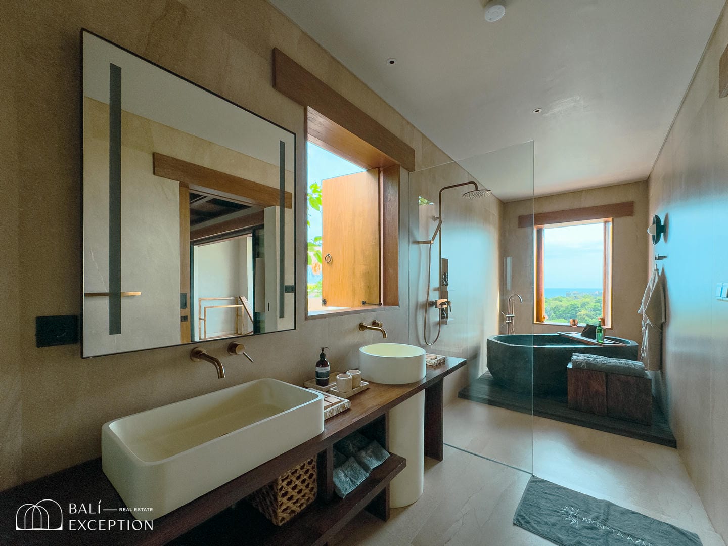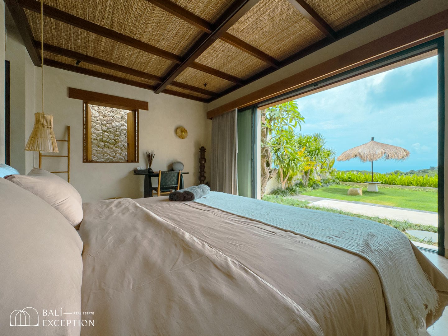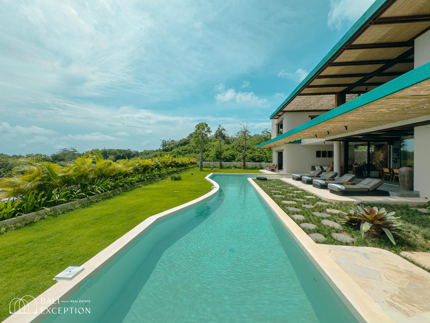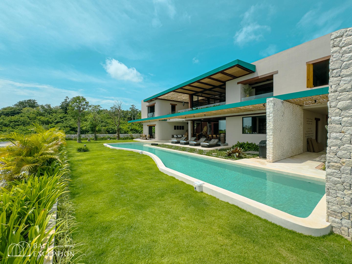 À l’extérieur, la villa dispose de vastes terrasses, d’un aménagement paysager luxuriant et d’une magnifique piscine courbée surplombant l’océan. Chaque espace principal, y compris les chambres, offre des vues panoramiques sur la mer, encadrées par une végétation abondante.