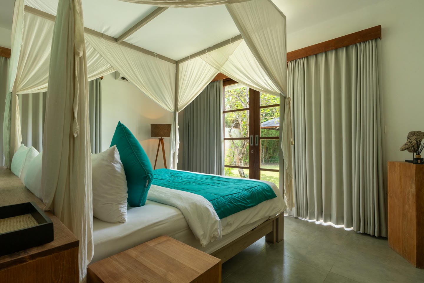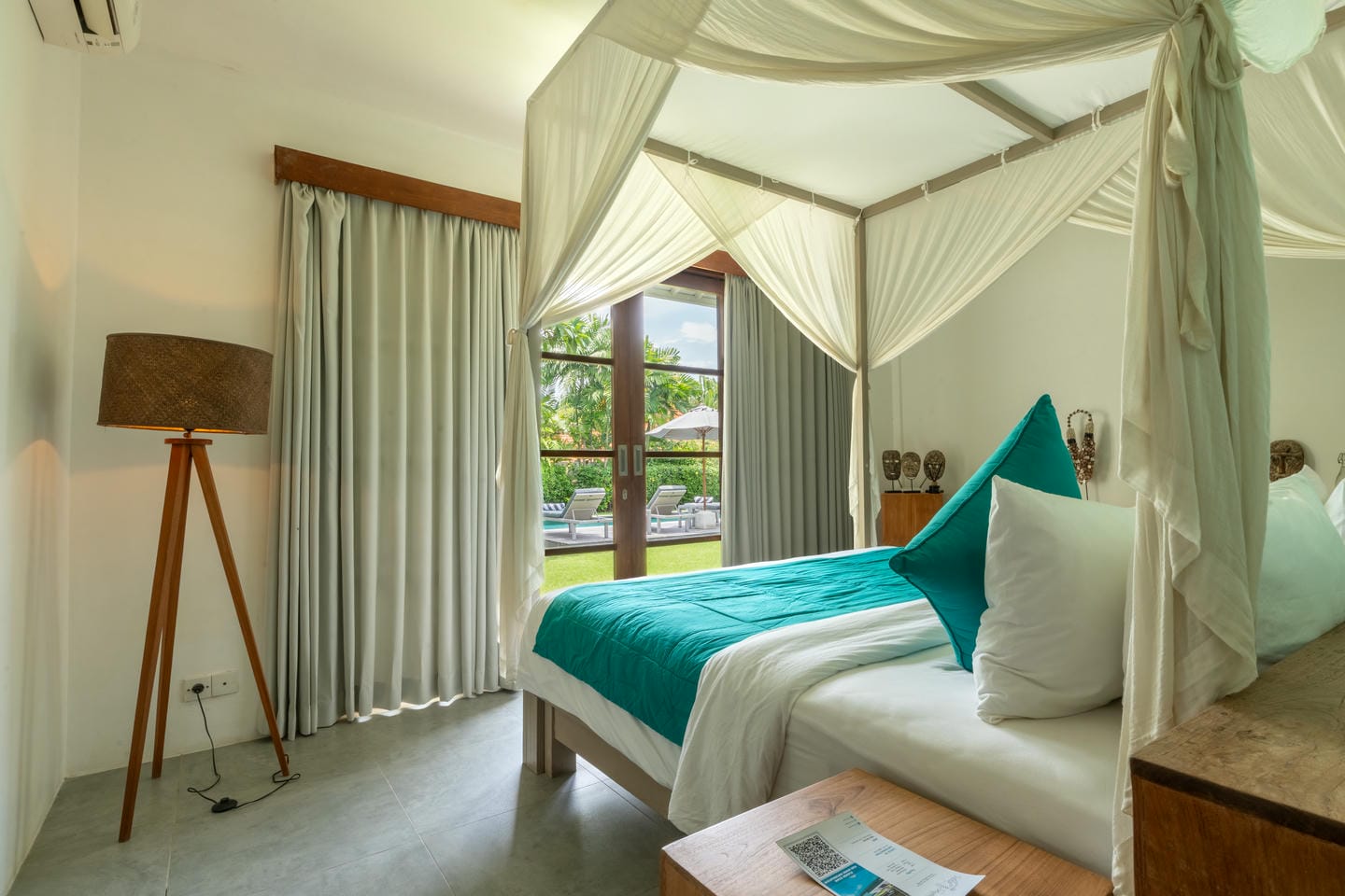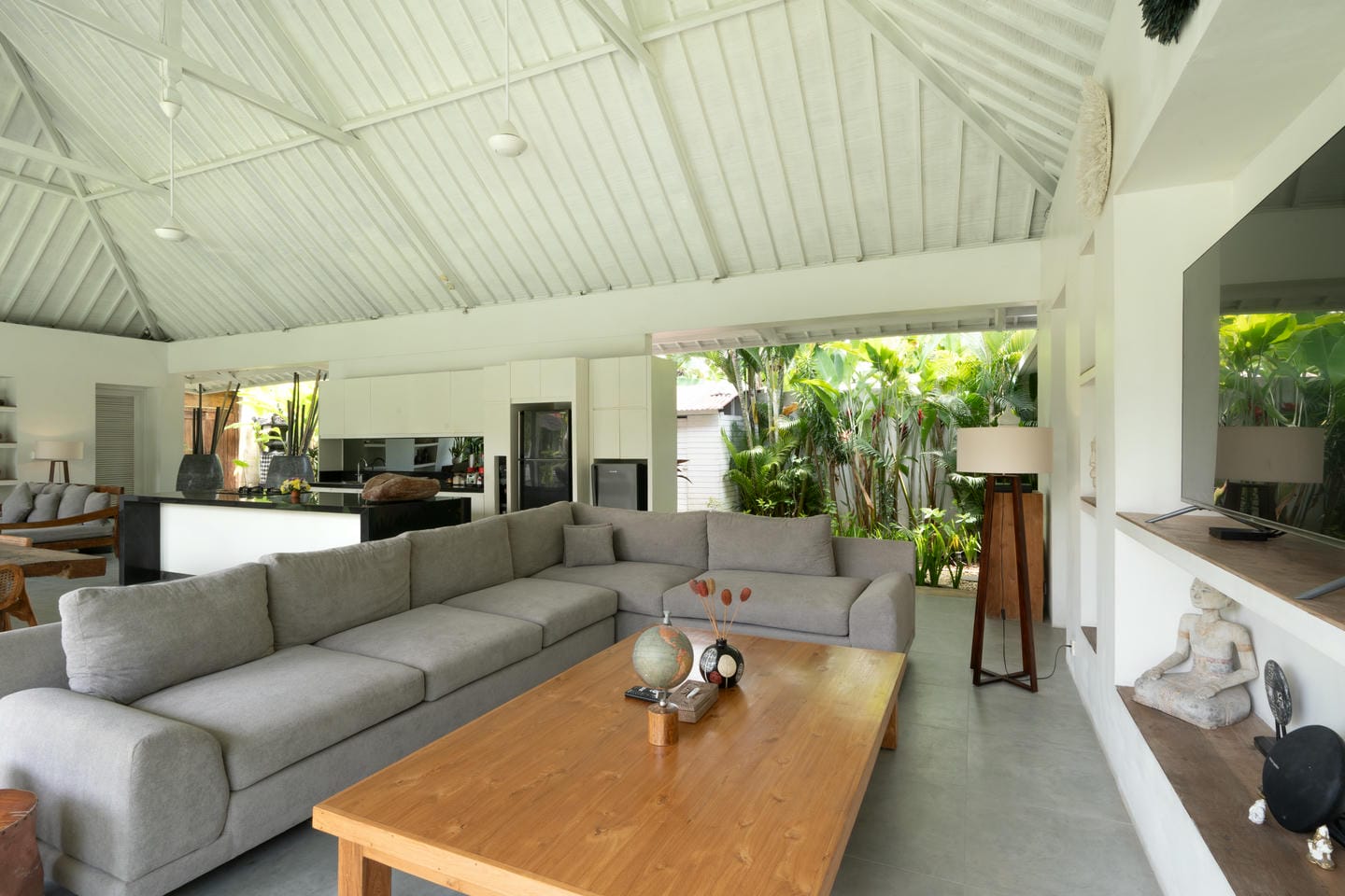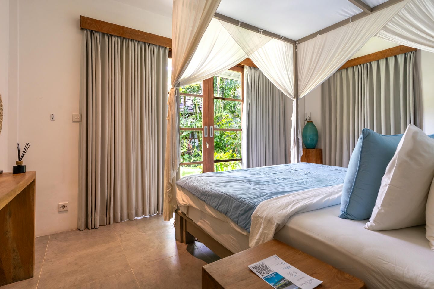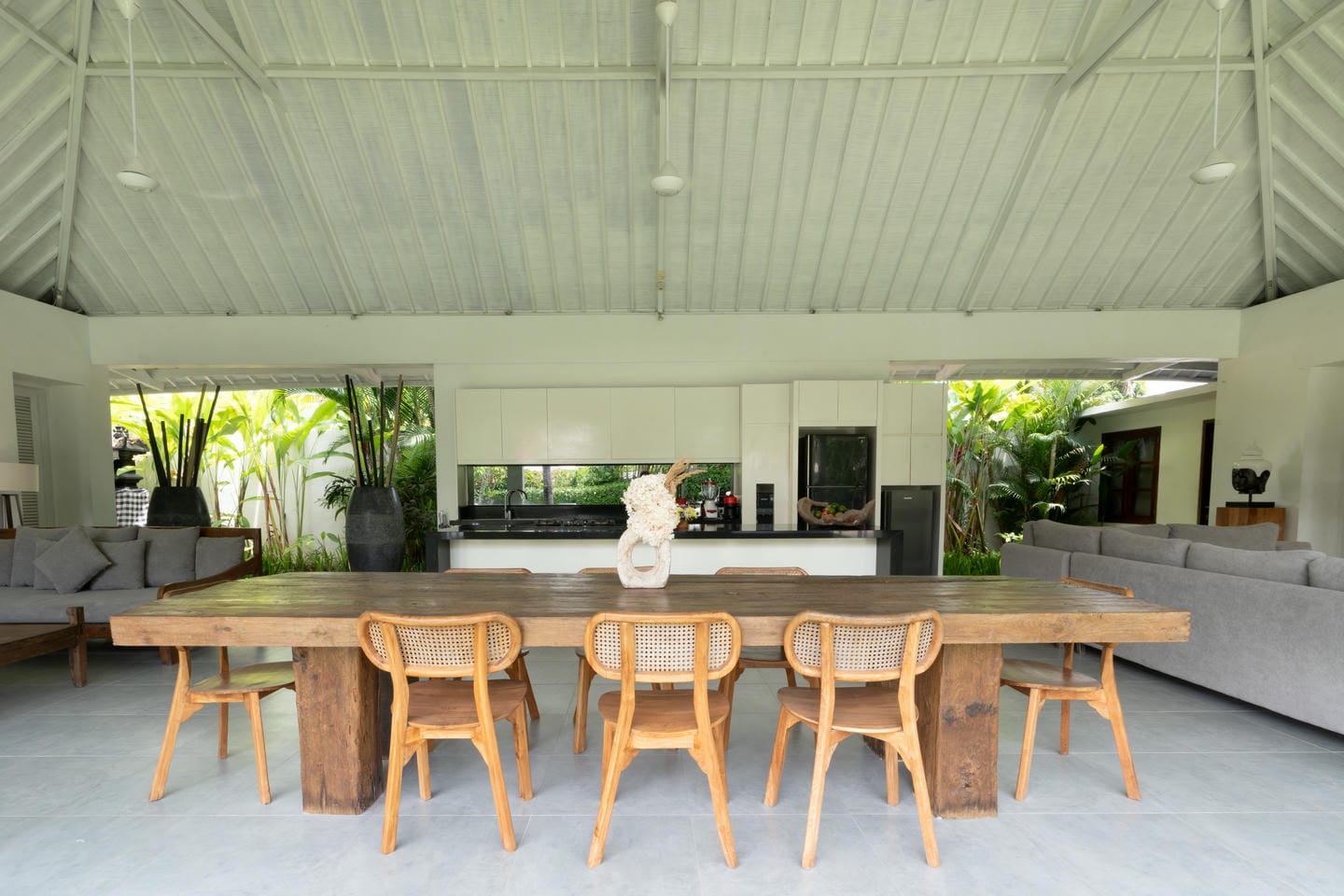 À l’intérieur, la villa offre de spacieux espaces de vie d’inspiration balinaise, avec une cuisine et une salle à manger ouvertes sur l’extérieur, entièrement équipées pour allier confort et praticité. Chaque chambre dispose d’un lit king-size, de la climatisation et de moustiquaires, avec une vue sur le jardin qui crée une ambiance sereine et proche de la nature. Le design allie ouverture et chaleur, pour une atmosphère détendue et conviviale.