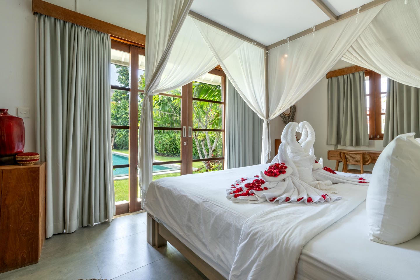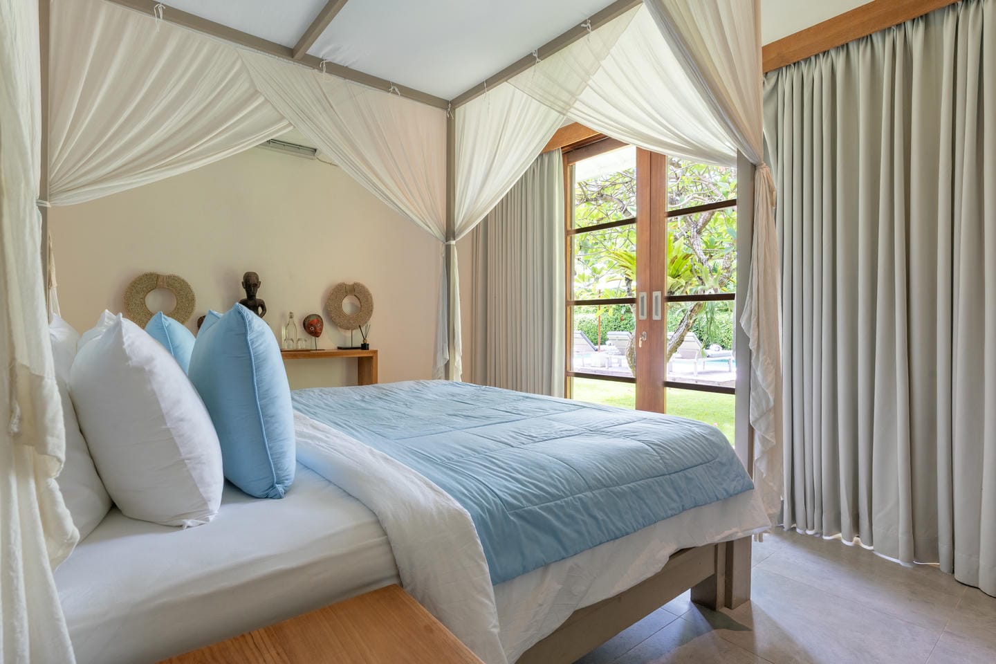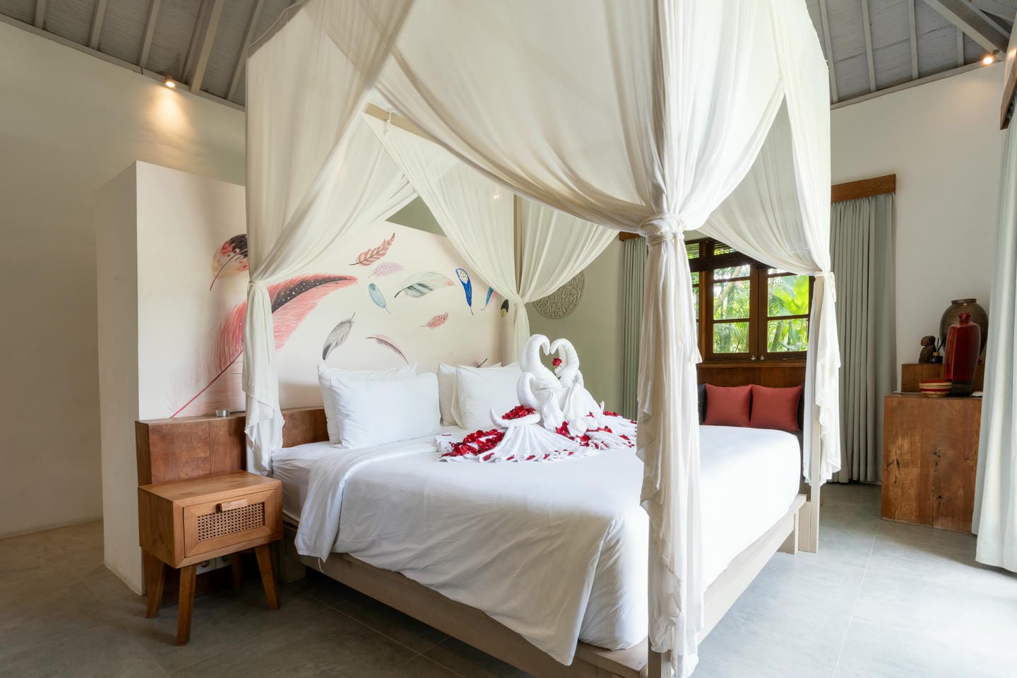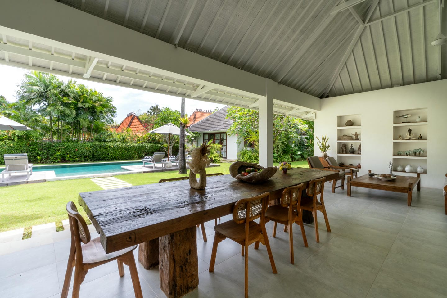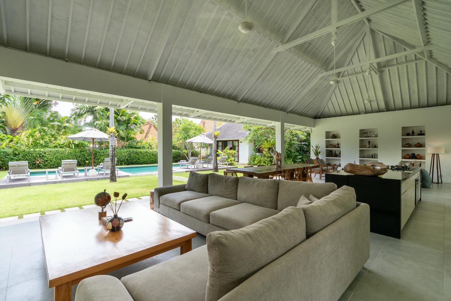 À l’intérieur, la villa offre de spacieux espaces de vie d’inspiration balinaise, avec une cuisine et une salle à manger ouvertes sur l’extérieur, entièrement équipées pour allier confort et praticité. Chaque chambre dispose d’un lit king-size, de la climatisation et de moustiquaires, avec une vue sur le jardin qui crée une ambiance sereine et proche de la nature. Le design allie ouverture et chaleur, pour une atmosphère détendue et conviviale.