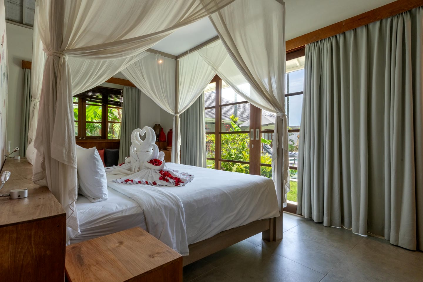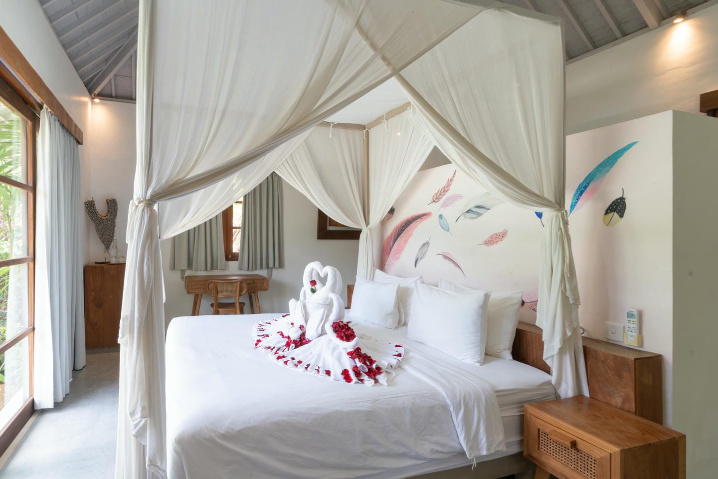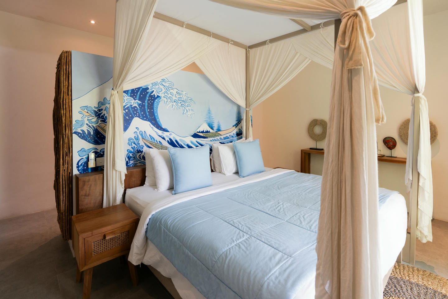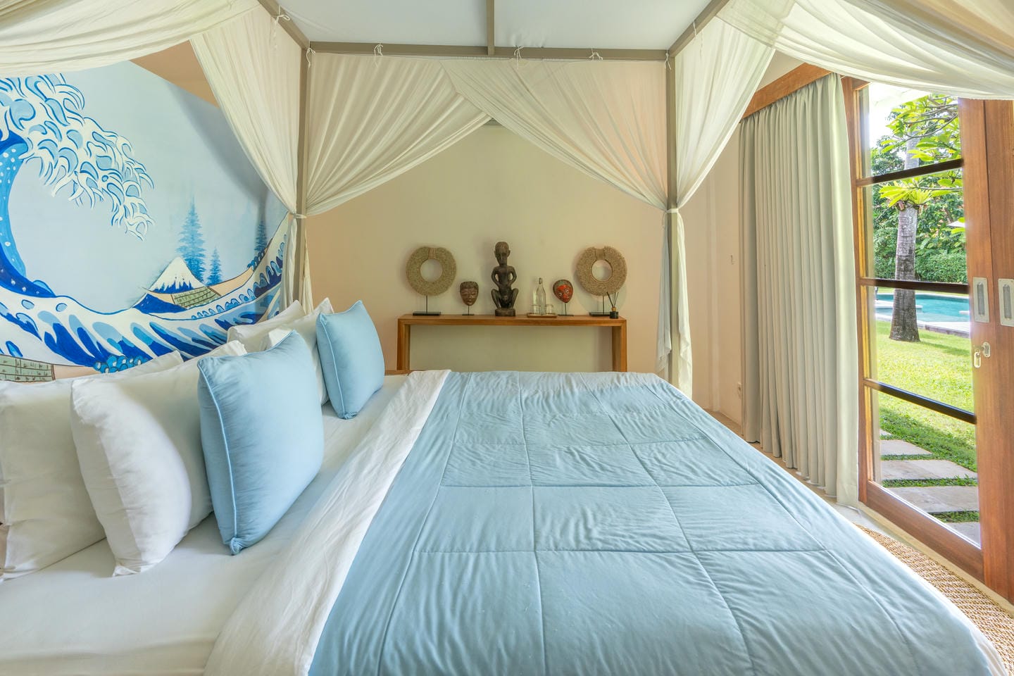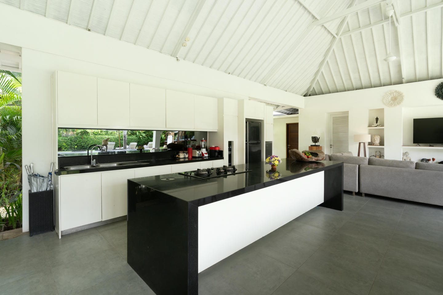 À l’intérieur, la villa offre de spacieux espaces de vie d’inspiration balinaise, avec une cuisine et une salle à manger ouvertes sur l’extérieur, entièrement équipées pour allier confort et praticité. Chaque chambre dispose d’un lit king-size, de la climatisation et de moustiquaires, avec une vue sur le jardin qui crée une ambiance sereine et proche de la nature. Le design allie ouverture et chaleur, pour une atmosphère détendue et conviviale.
