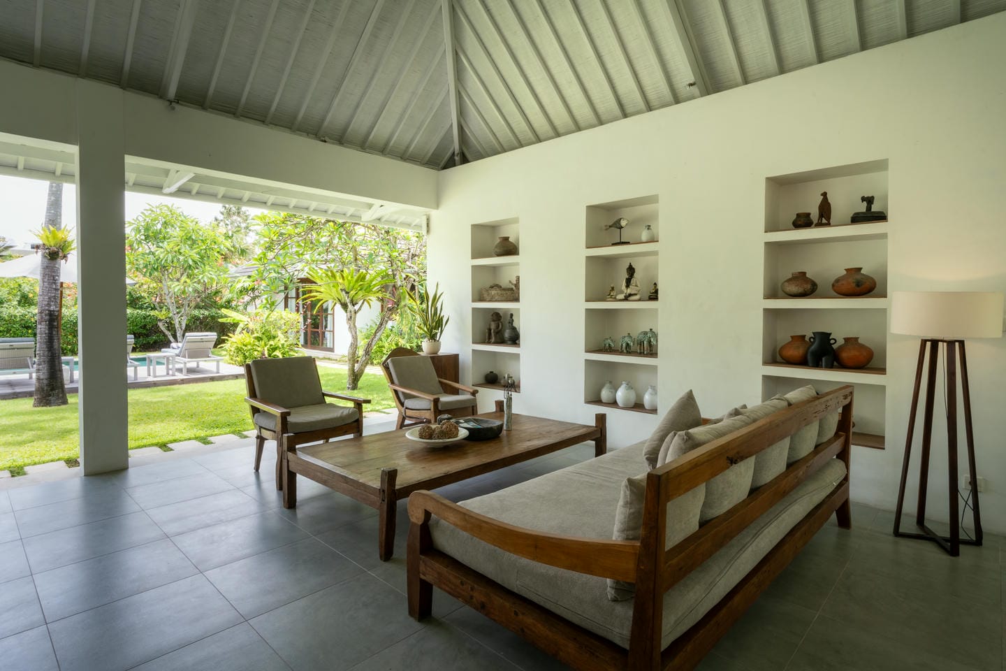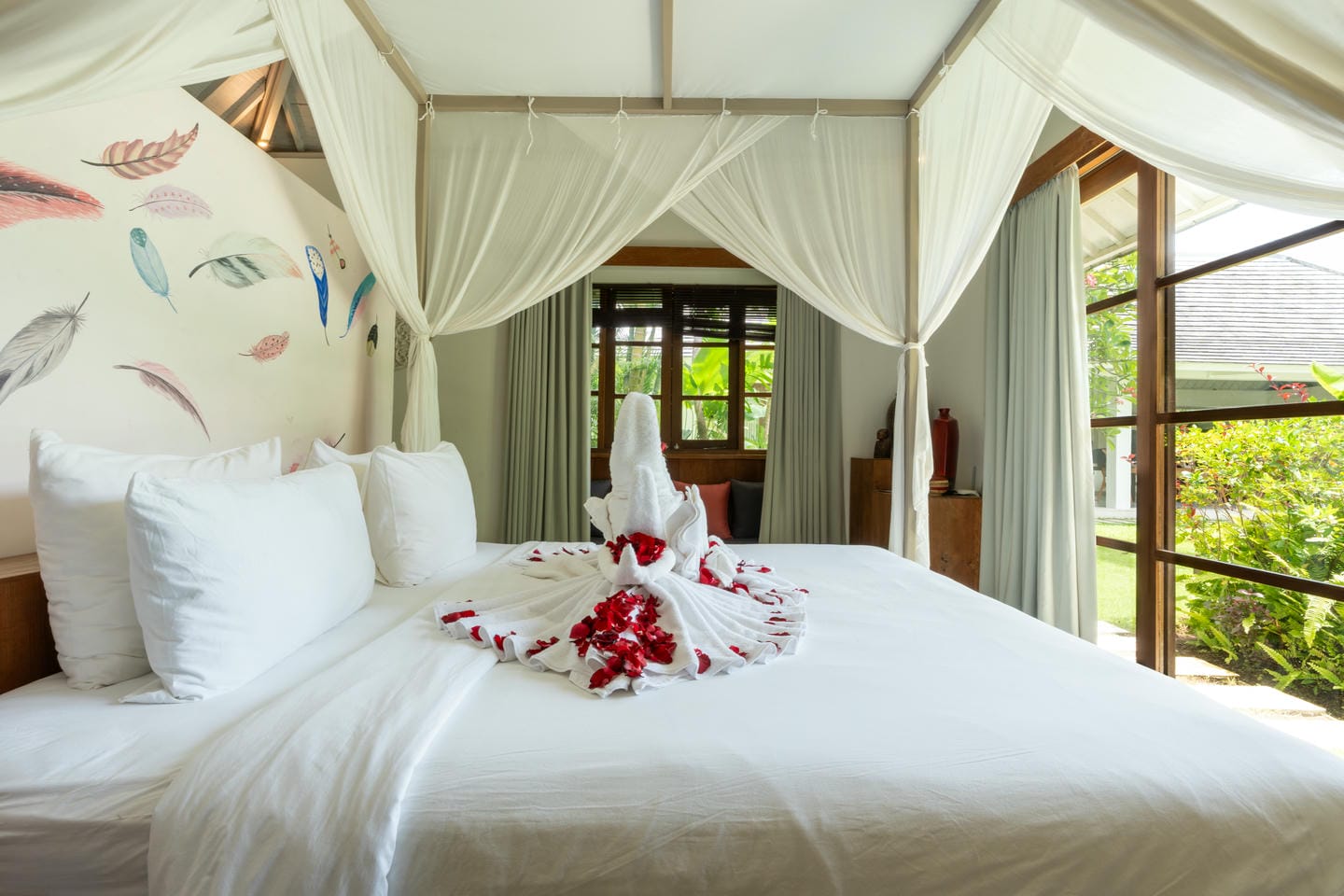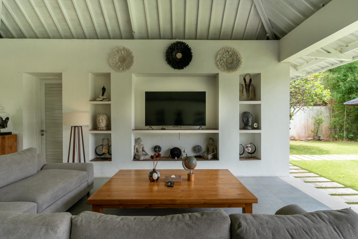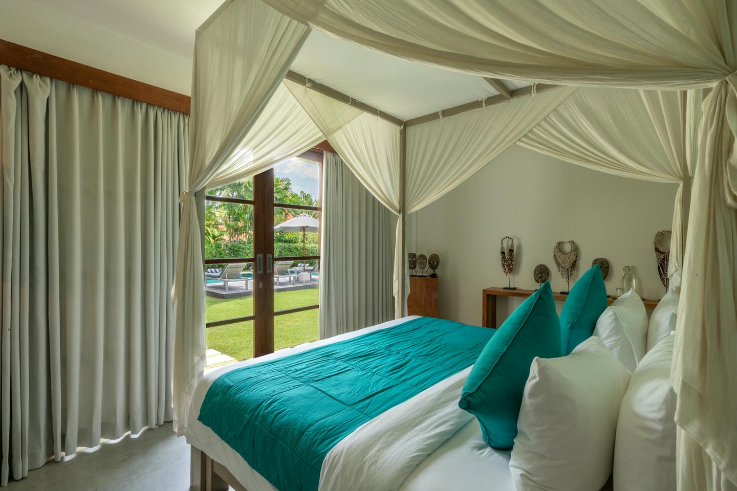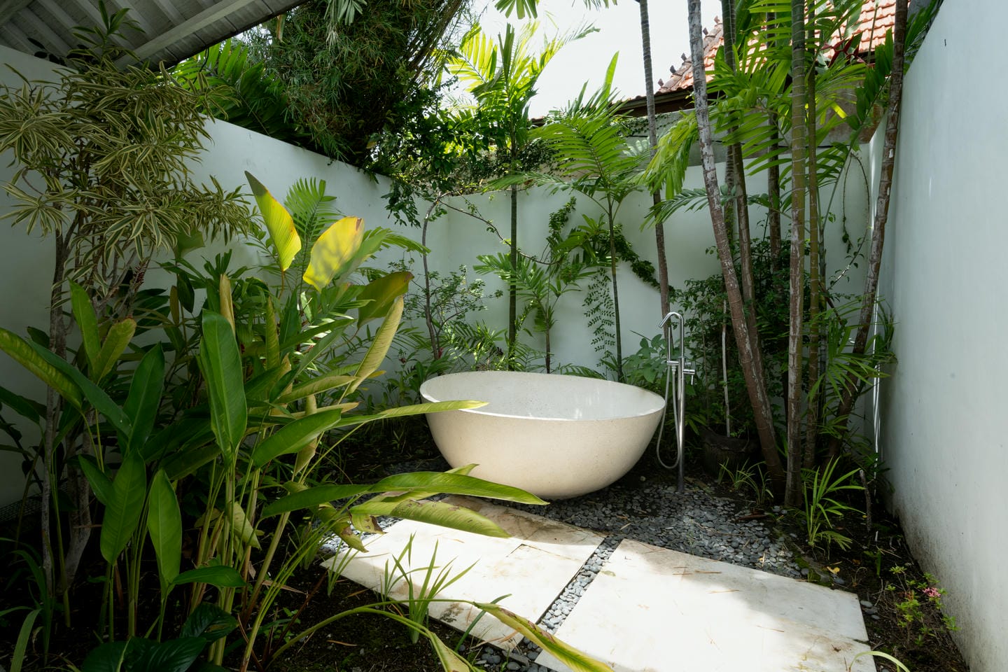 À l’intérieur, la villa offre de spacieux espaces de vie d’inspiration balinaise, avec une cuisine et une salle à manger ouvertes sur l’extérieur, entièrement équipées pour allier confort et praticité. Chaque chambre dispose d’un lit king-size, de la climatisation et de moustiquaires, avec une vue sur le jardin qui crée une ambiance sereine et proche de la nature. Le design allie ouverture et chaleur, pour une atmosphère détendue et conviviale.