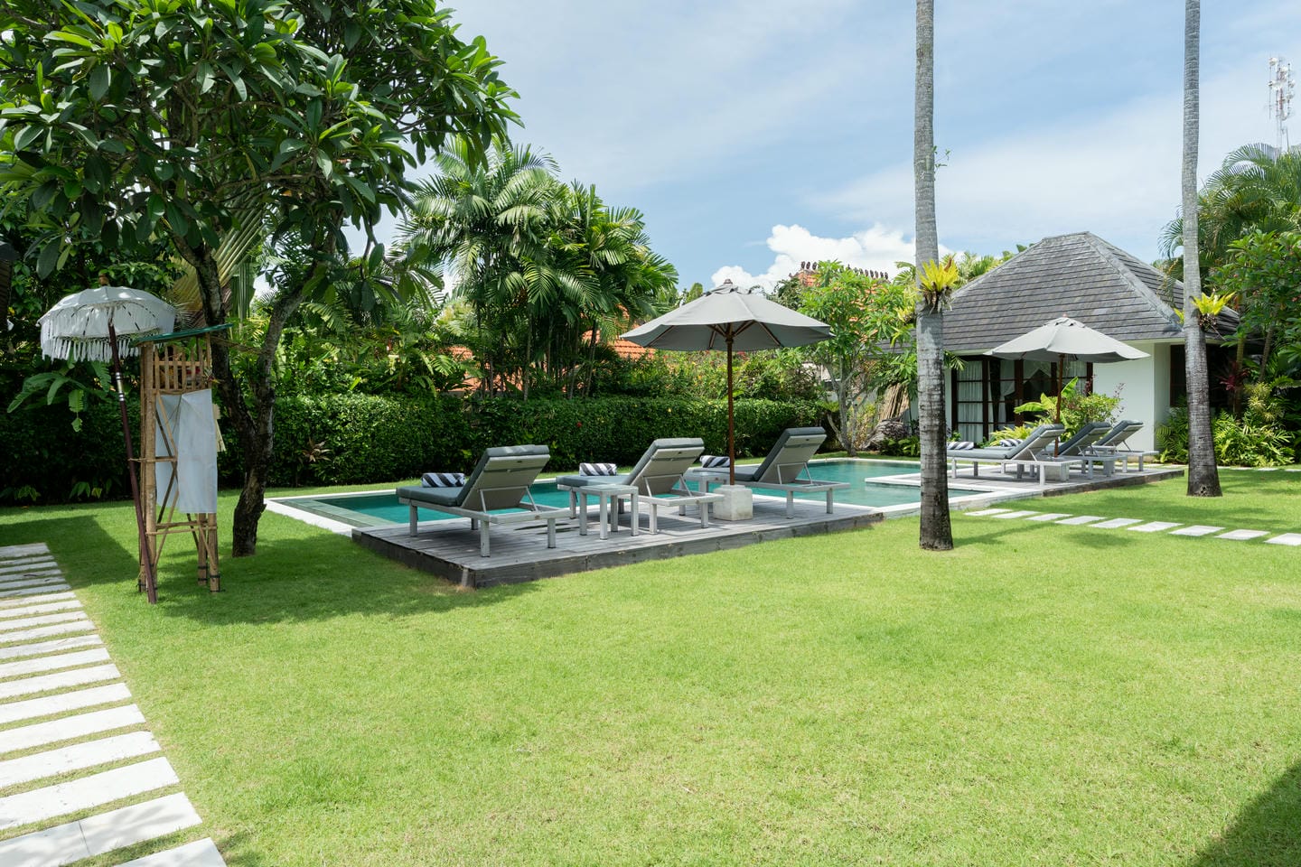 Le vaste jardin et l’espace piscine, ainsi que le salon et la salle à manger extérieurs, invitent à un art de vivre décontracté — que ce soit pour prendre le soleil, nager, se détendre à l’ombre ou savourer des repas entourés d’une végétation luxuriante.