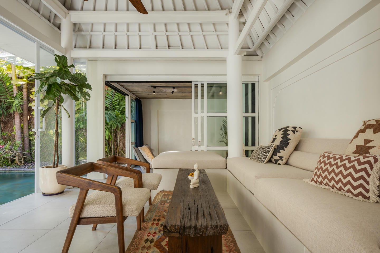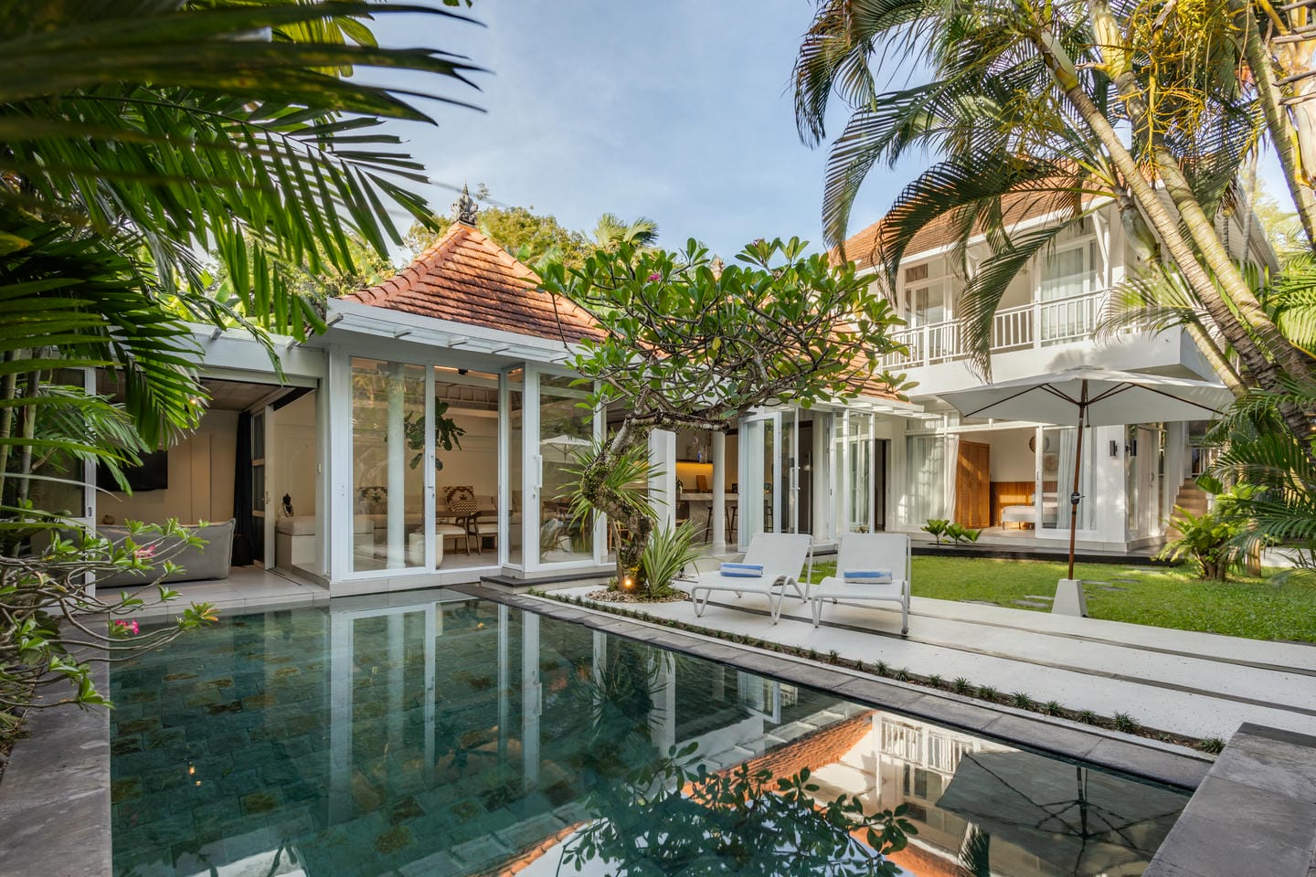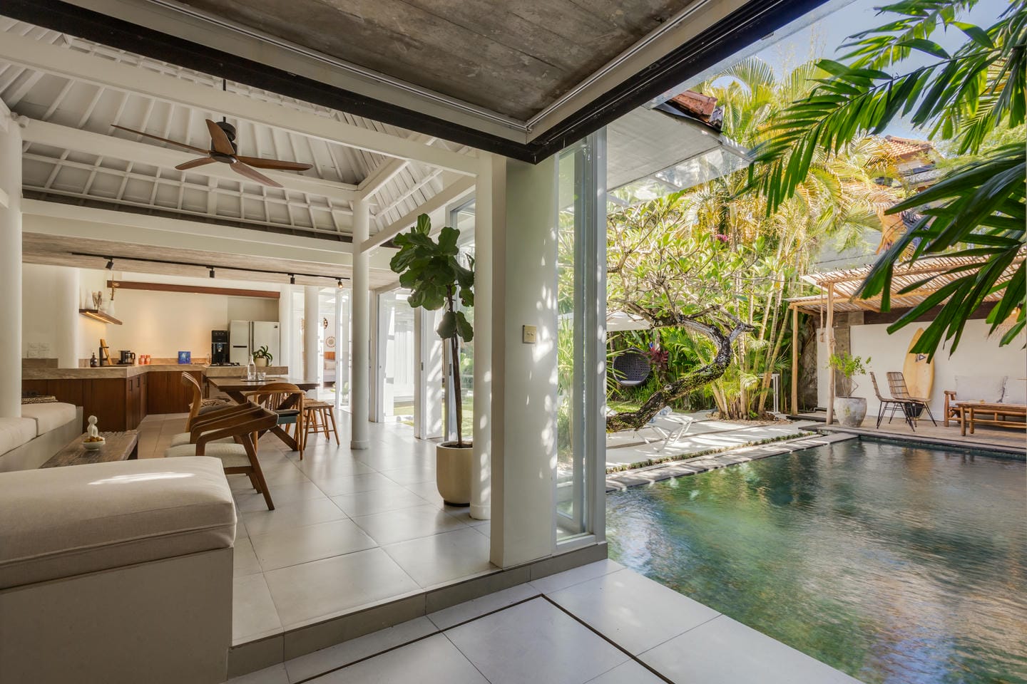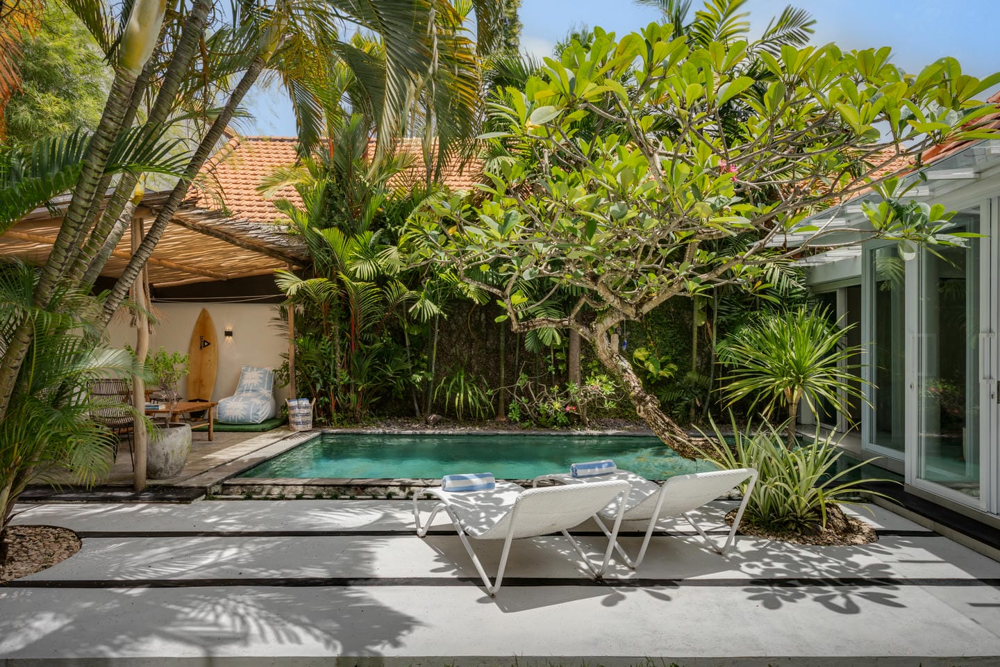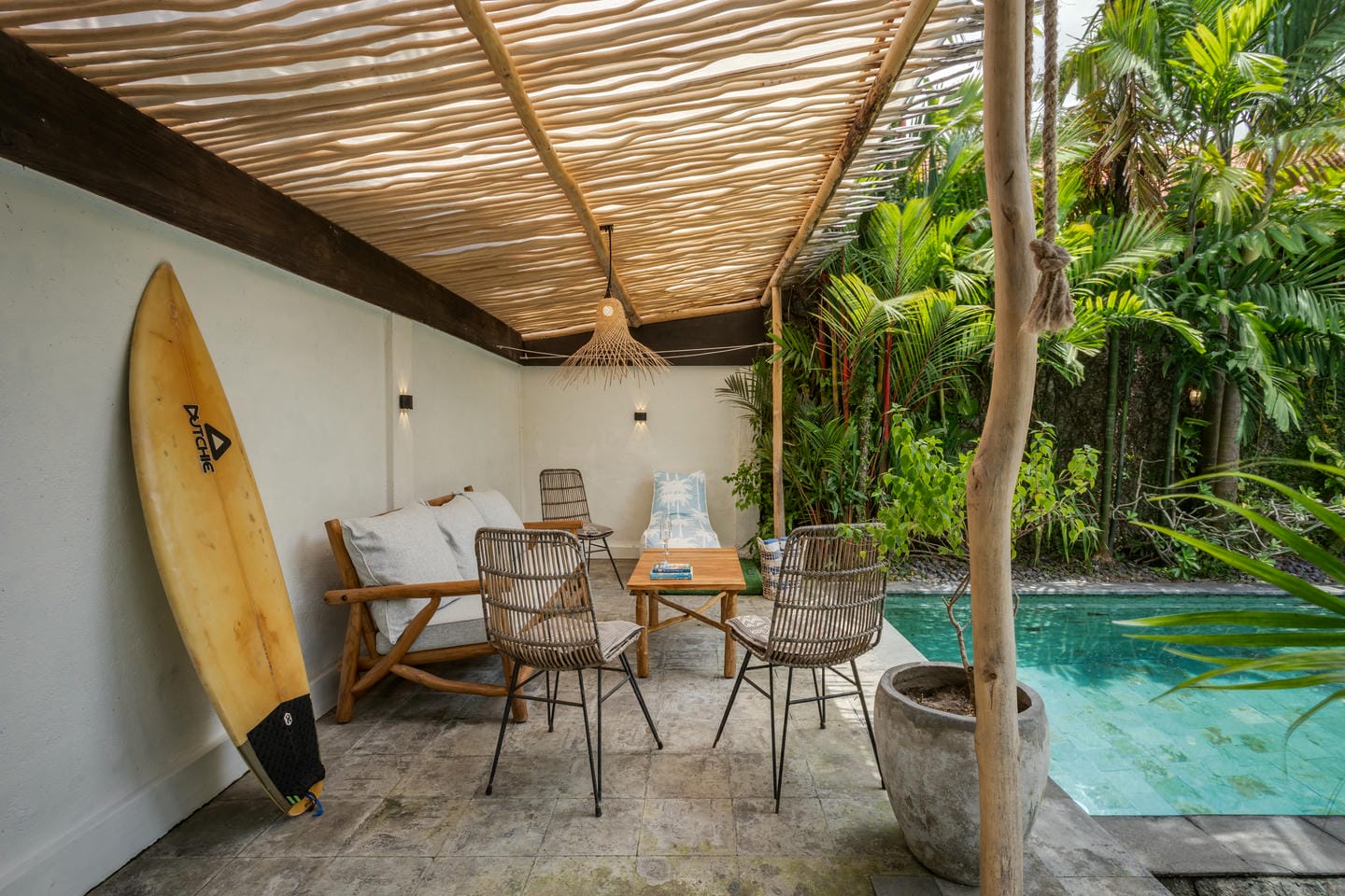 Entrez dans l'espace extérieur doté d'une piscine privée avec des chaises longues sur le côté, complétée par une terrasse confortable. Entouré d'arbres luxuriants, l'espace crée une atmosphère relaxante et rafraîchissante, parfaite pour profiter du cadre tropical et se détendre dans le confort.