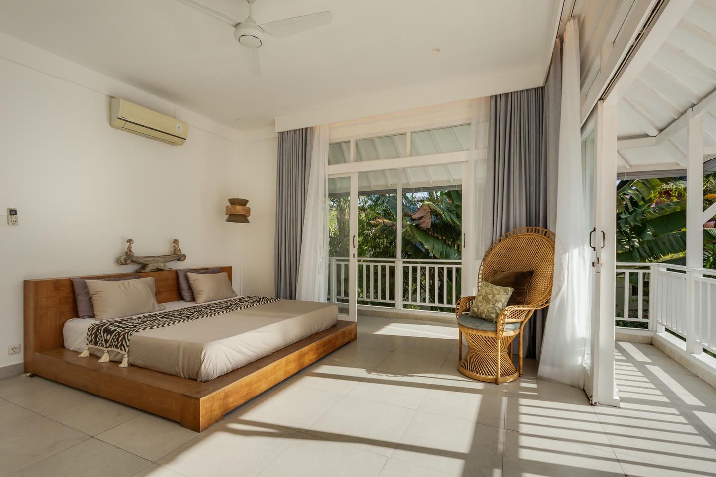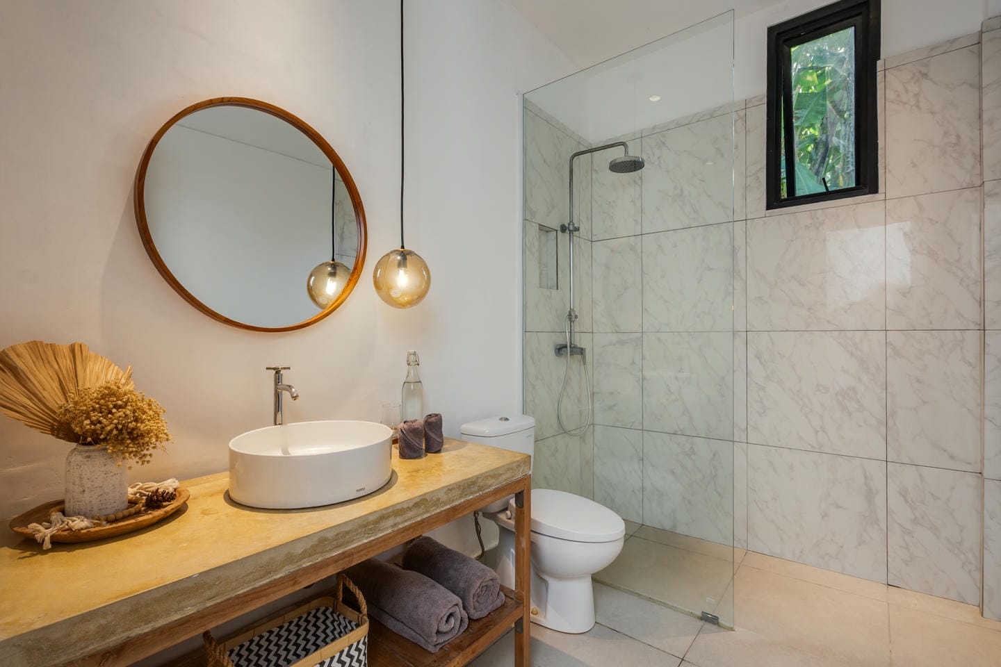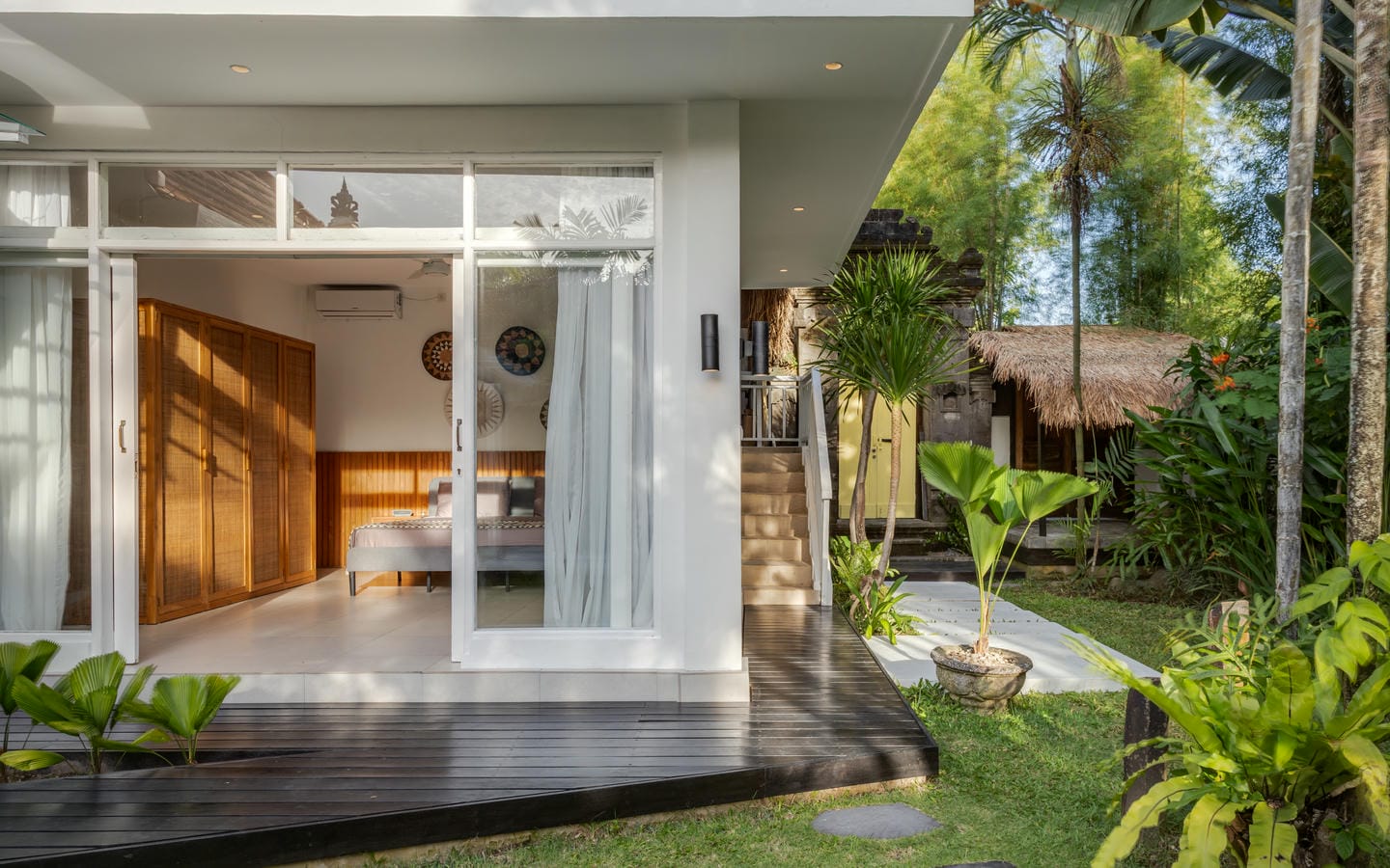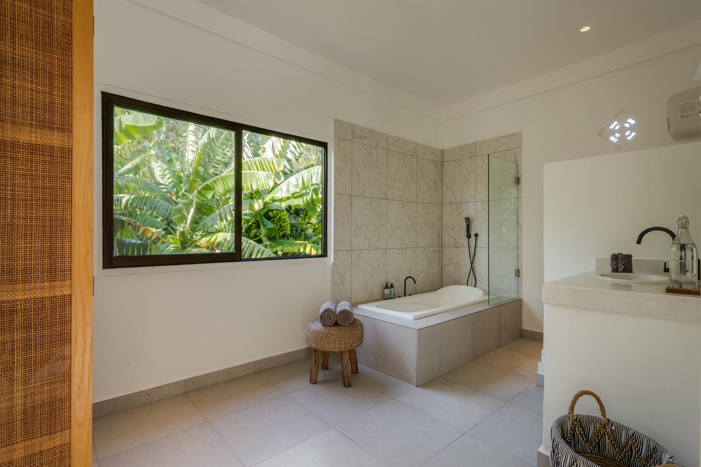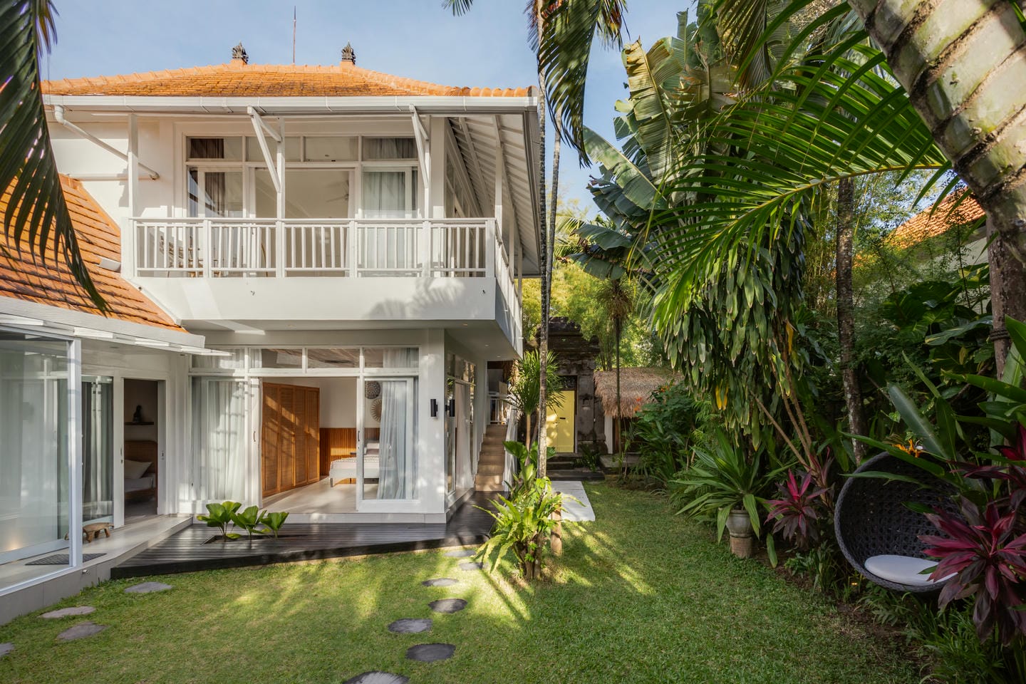 Entrez dans l'espace extérieur doté d'une piscine privée avec des chaises longues sur le côté, complétée par une terrasse confortable. Entouré d'arbres luxuriants, l'espace crée une atmosphère relaxante et rafraîchissante, parfaite pour profiter du cadre tropical et se détendre dans le confort.