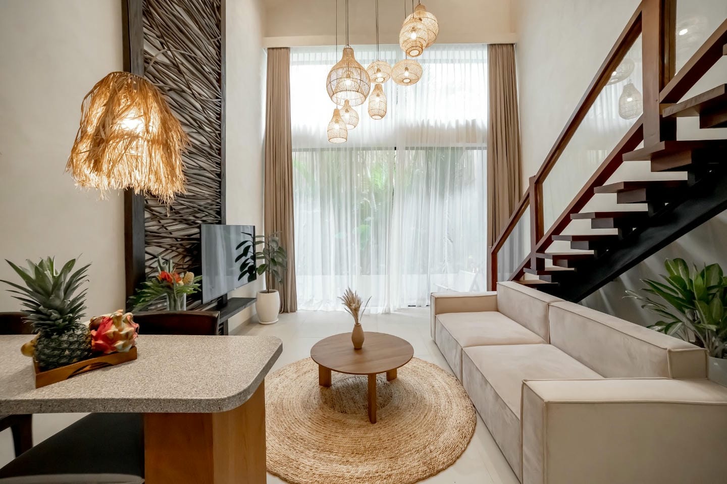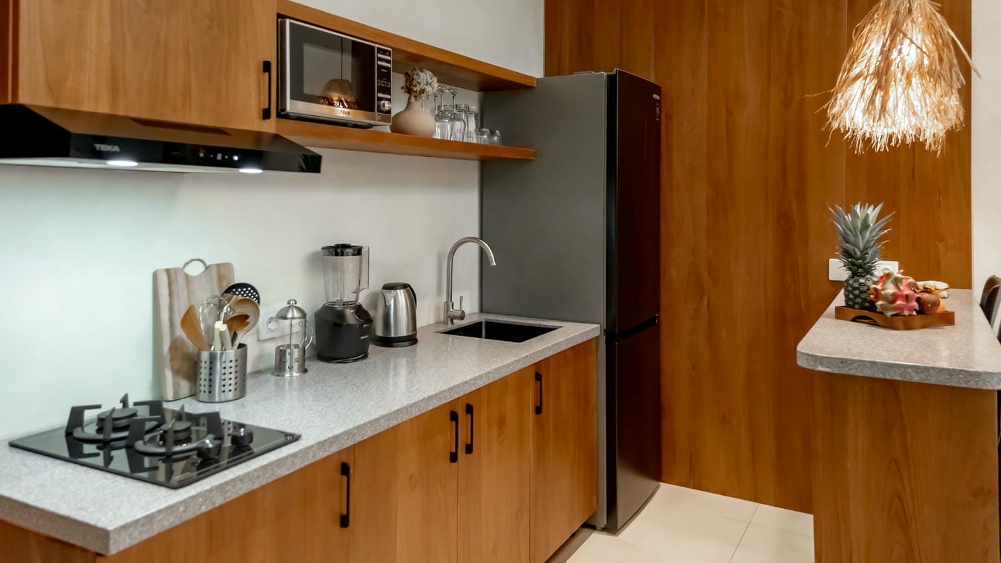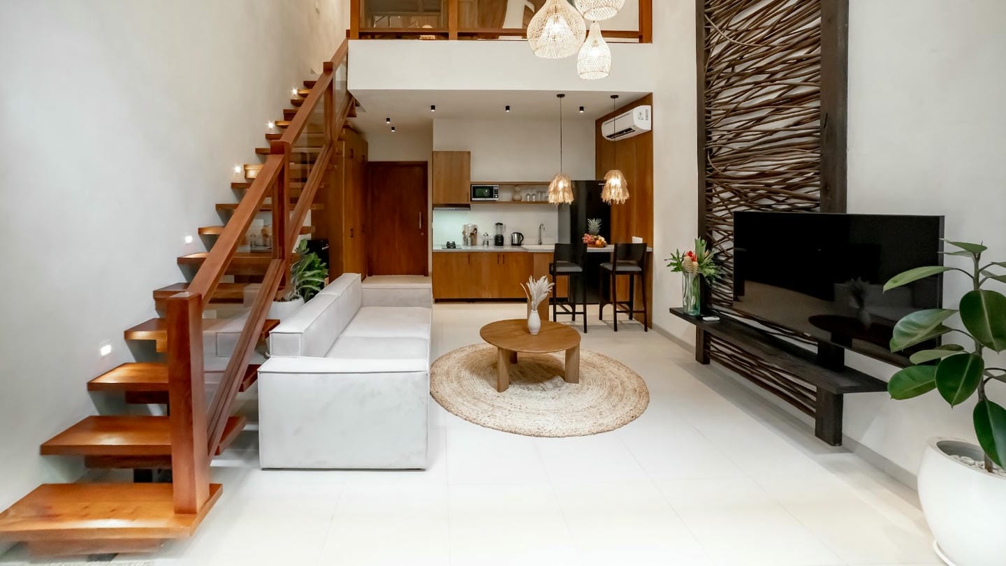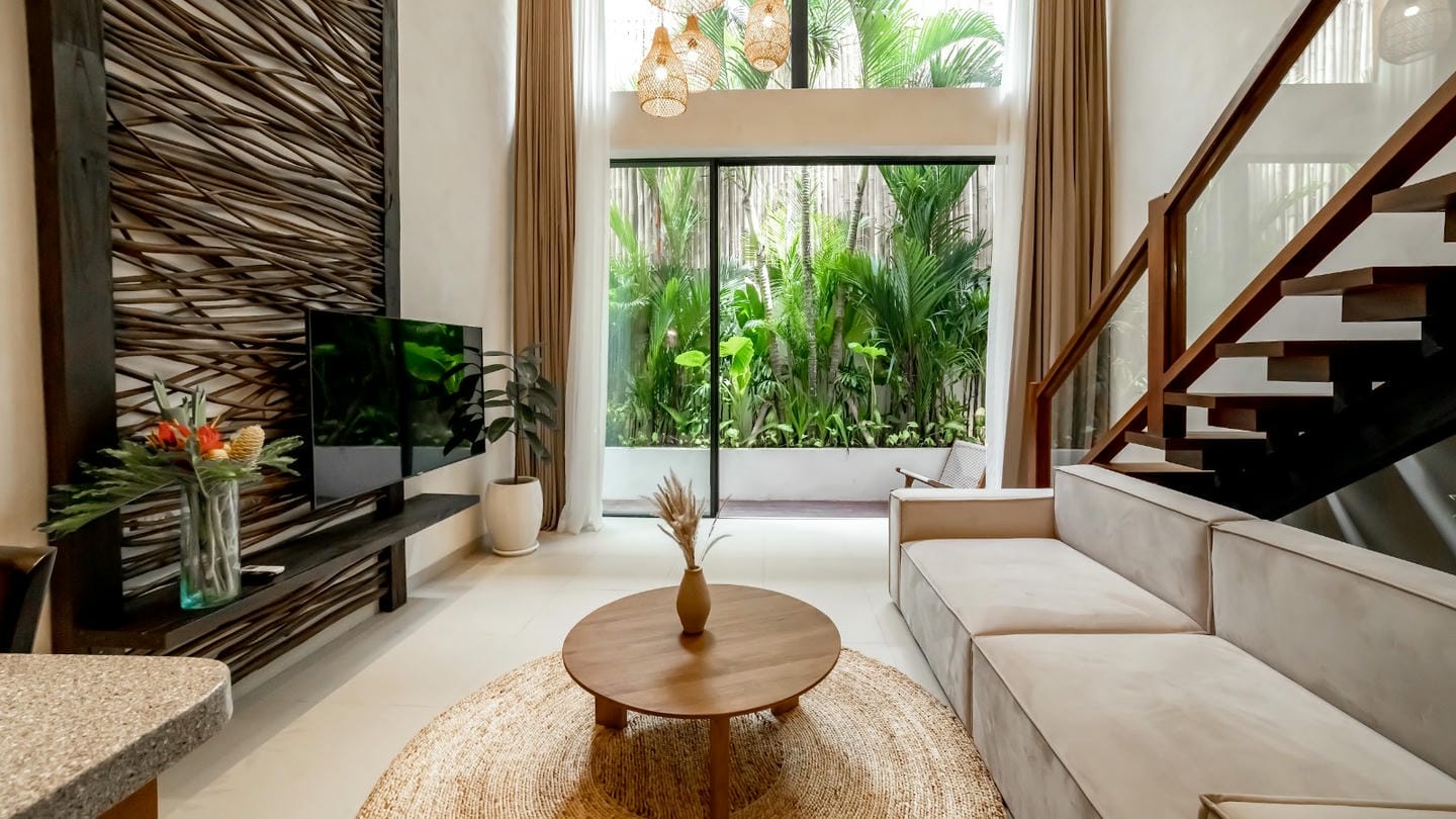 Cette villa présente un design tropical moderne et raffiné, avec de chaleureux accents de bois naturel dans toute la propriété. Le séjour à double hauteur sous plafond et les baies vitrées pleine hauteur créent une atmosphère lumineuse et aérée, tout en s’ouvrant sur un jardin privé luxuriant. L’espace ouvert regroupant le salon, la salle à manger et la cuisine allie confort et élégance, et est complété par un petit jardin à l’arrière de la villa. La propriété dispose d’une chambre confortable et d’une salle de bain bien aménagée, ce qui la rend idéale aussi bien pour un usage privé que pour un investissement locatif.