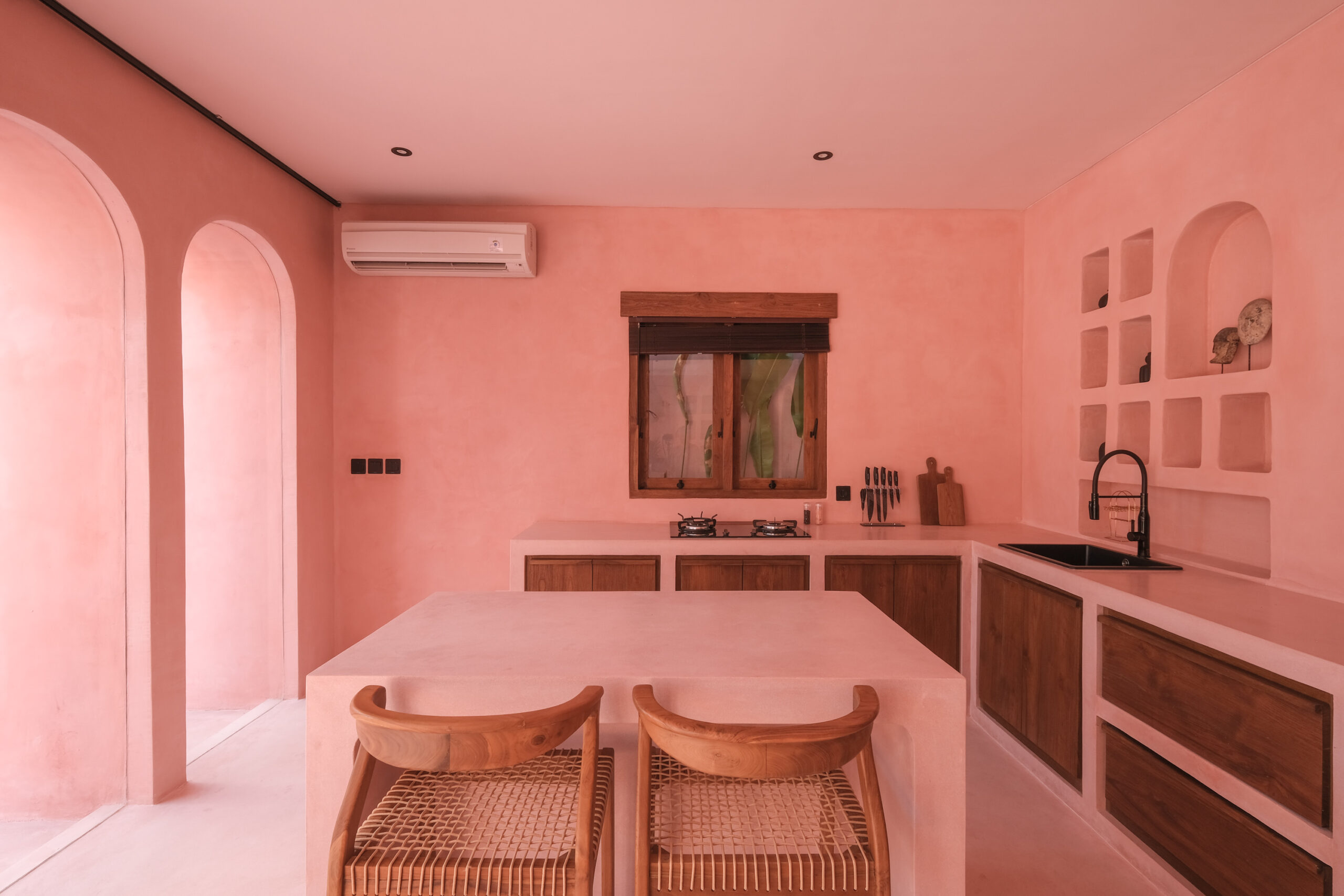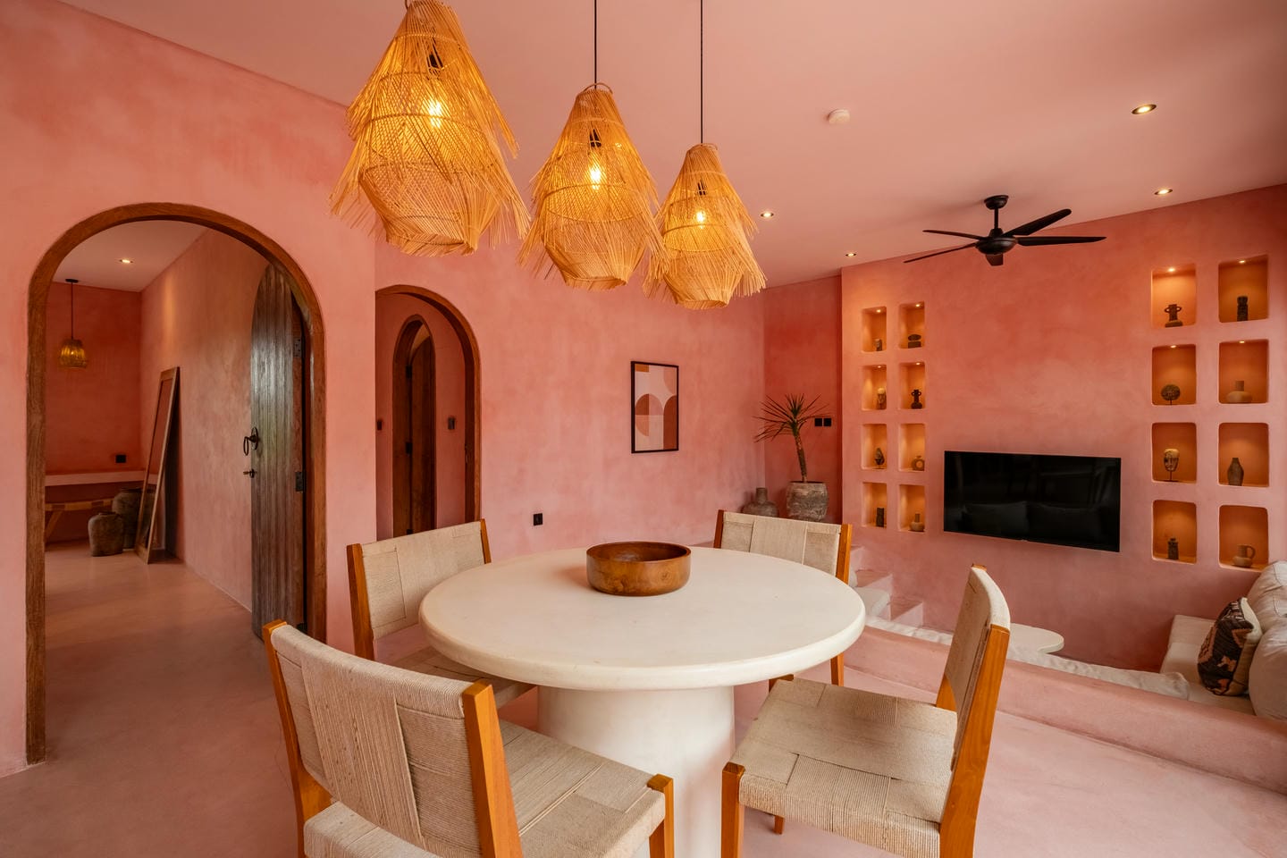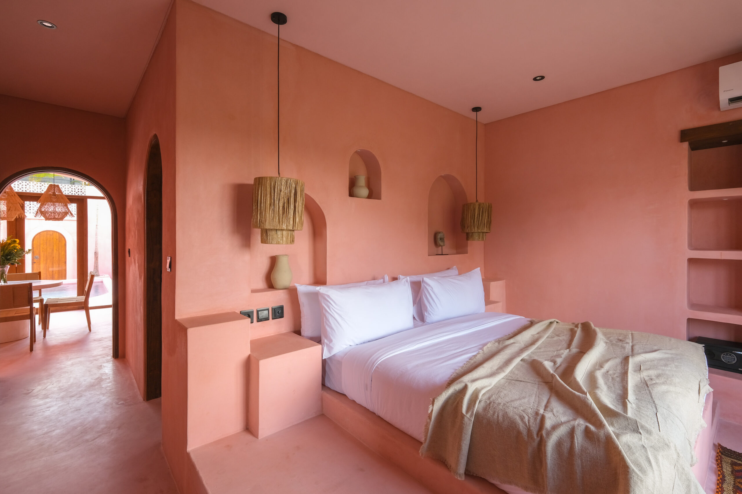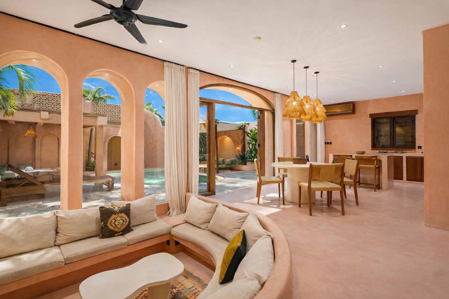 Les intérieurs présentent une esthétique méditerranéenne–tropicale chaleureuse, avec des tons terracotta doux, des arches arrondies, des textures naturelles et des finitions minimalistes épurées. L’espace de vie et de salle à manger décloisonné est lumineux et fluide, tandis que les deux chambres offrent des refuges calmes et intimistes, avec des aménagements intégrés et un éclairage d’ambiance délicat.
