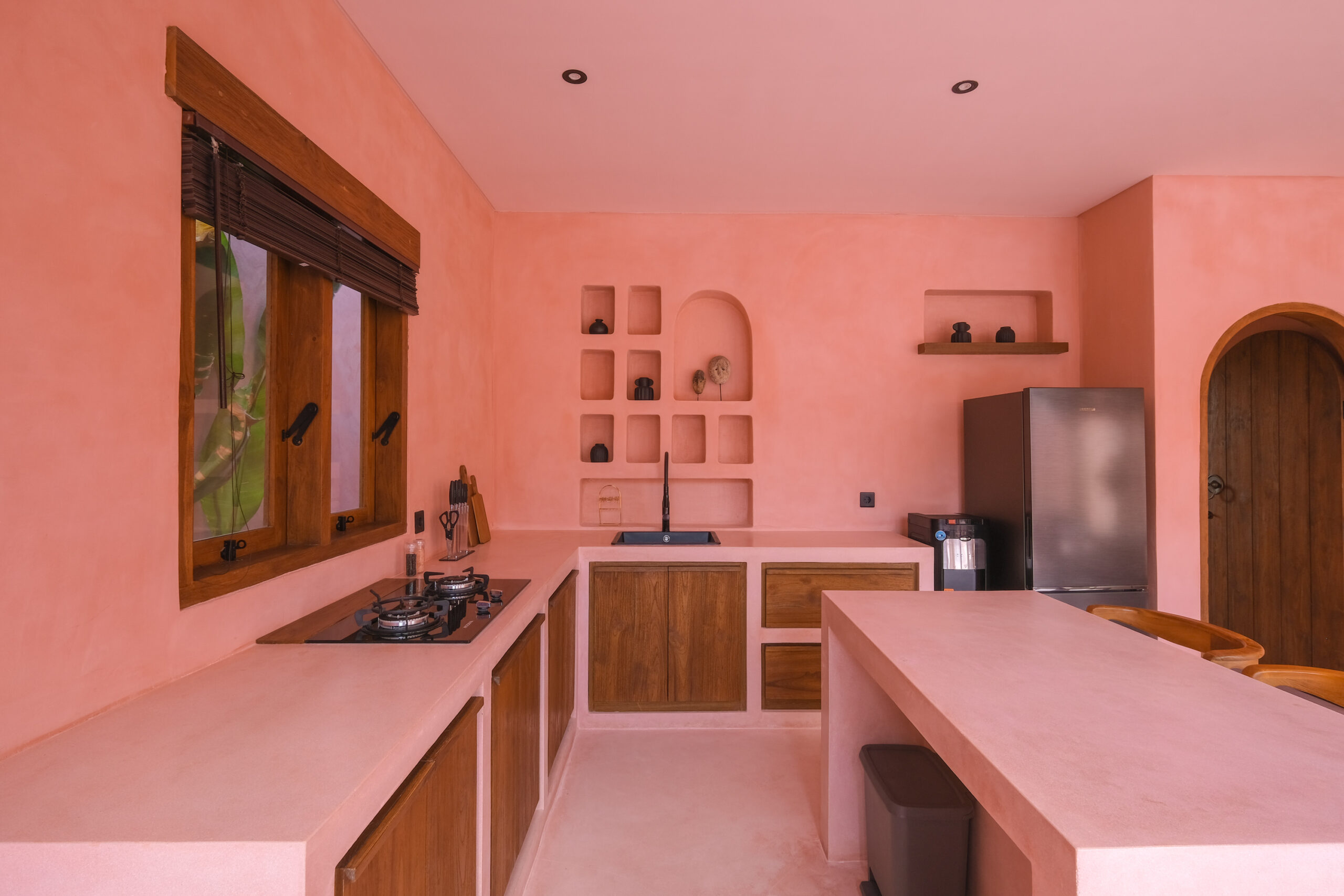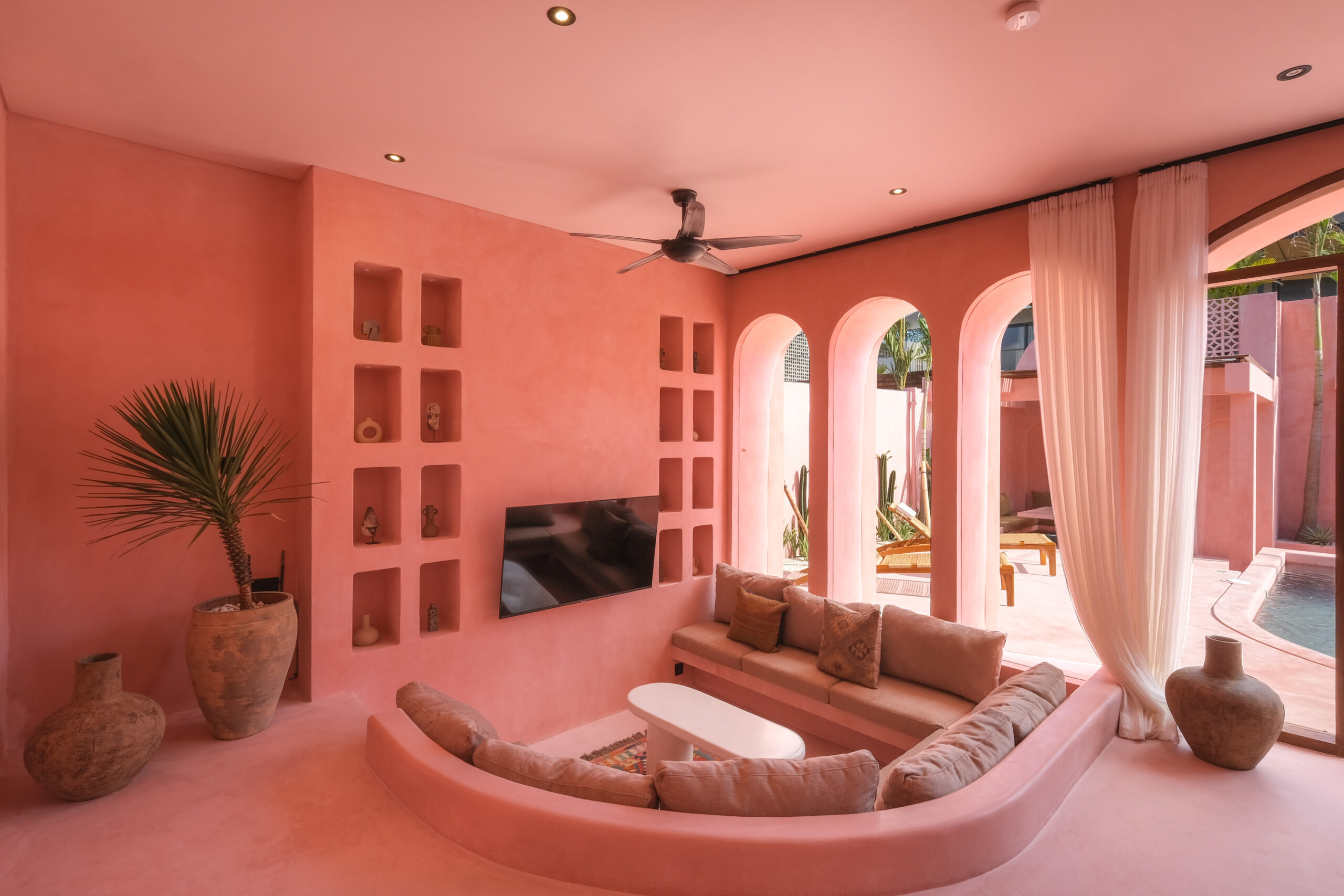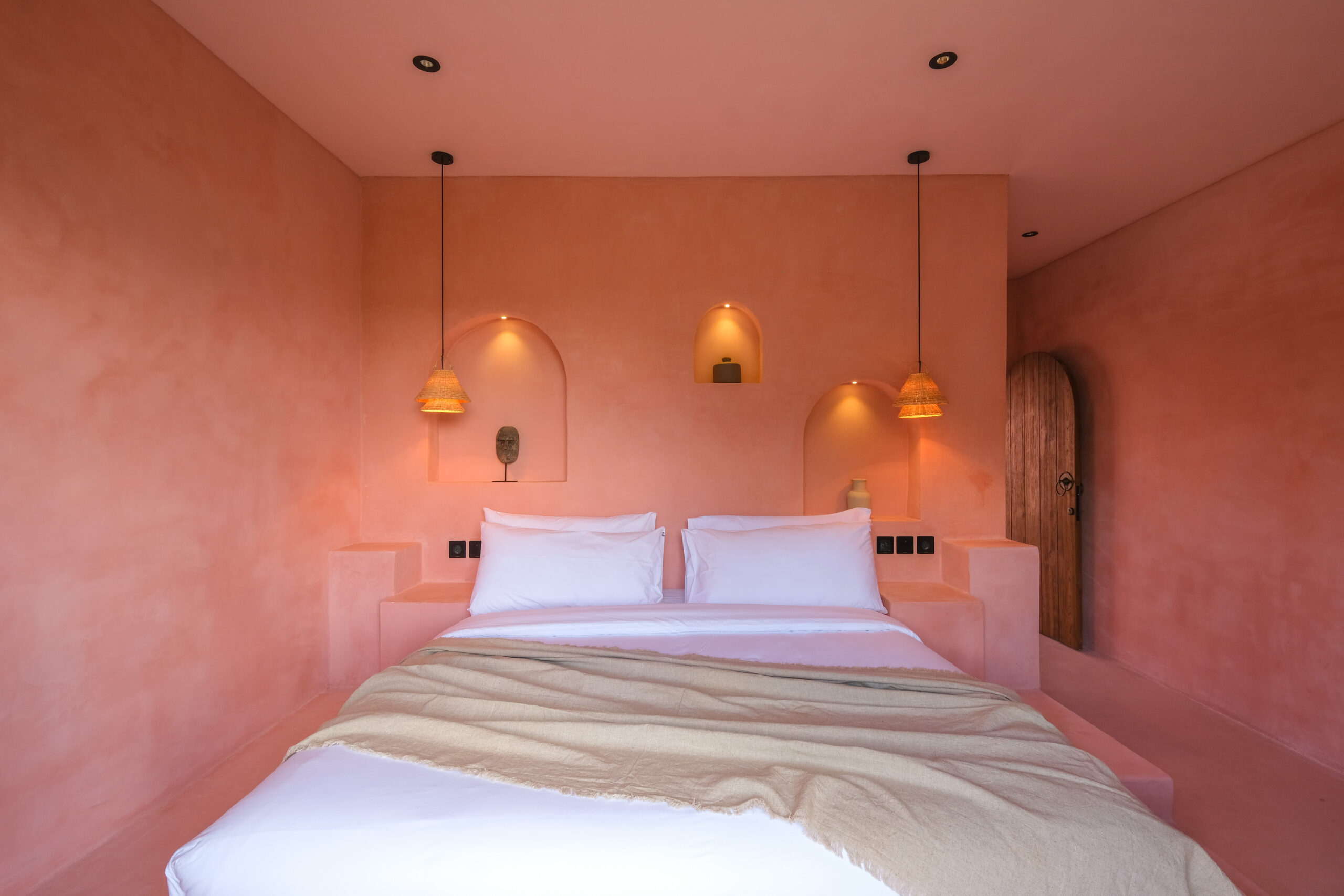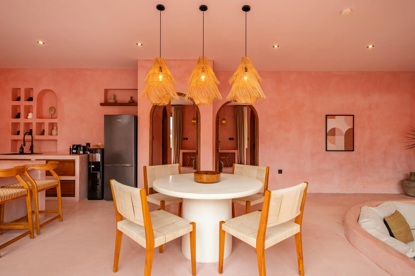 Les intérieurs présentent une esthétique méditerranéenne–tropicale chaleureuse, avec des tons terracotta doux, des arches arrondies, des textures naturelles et des finitions minimalistes épurées. L’espace de vie et de salle à manger décloisonné est lumineux et fluide, tandis que les deux chambres offrent des refuges calmes et intimistes, avec des aménagements intégrés et un éclairage d’ambiance délicat.
