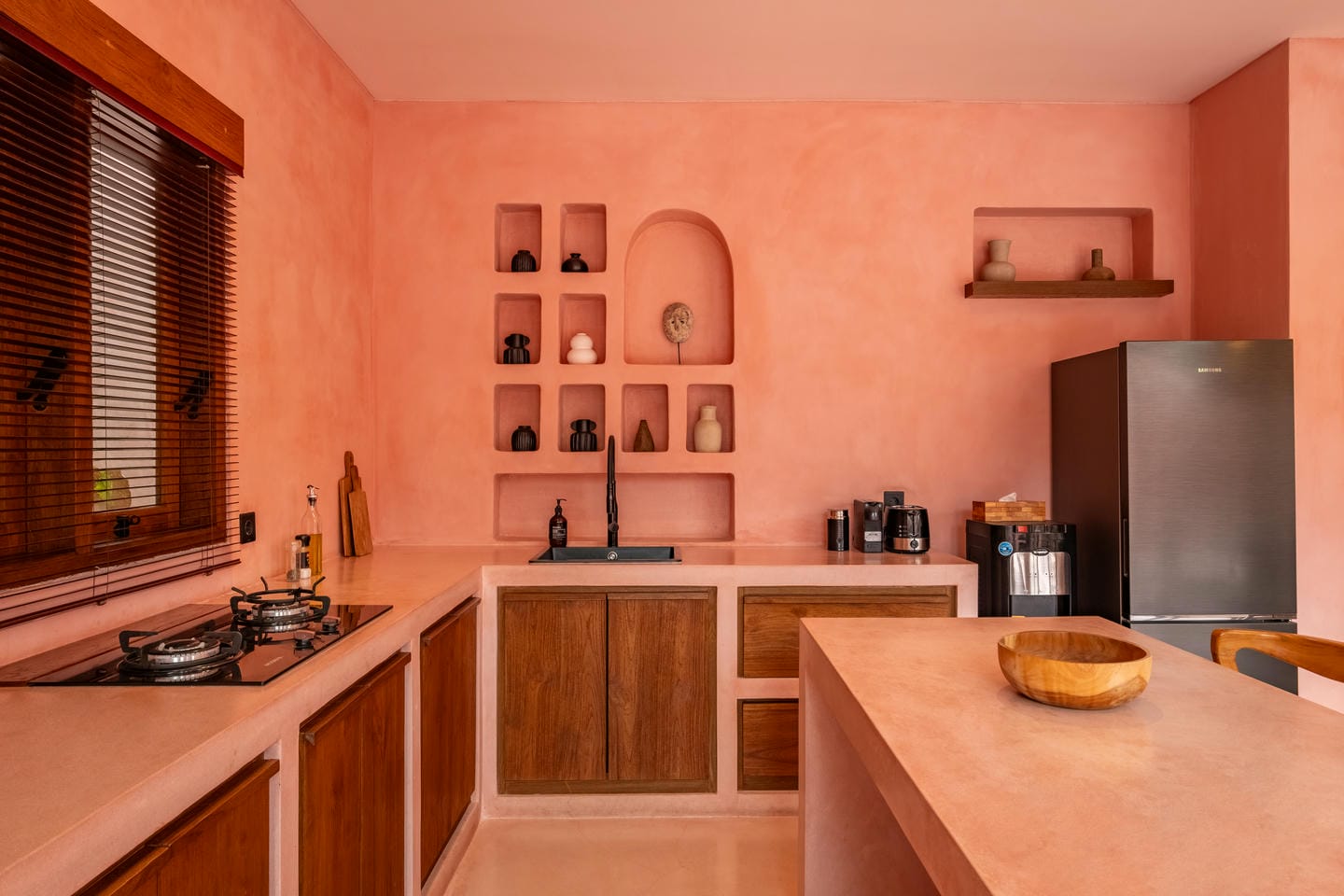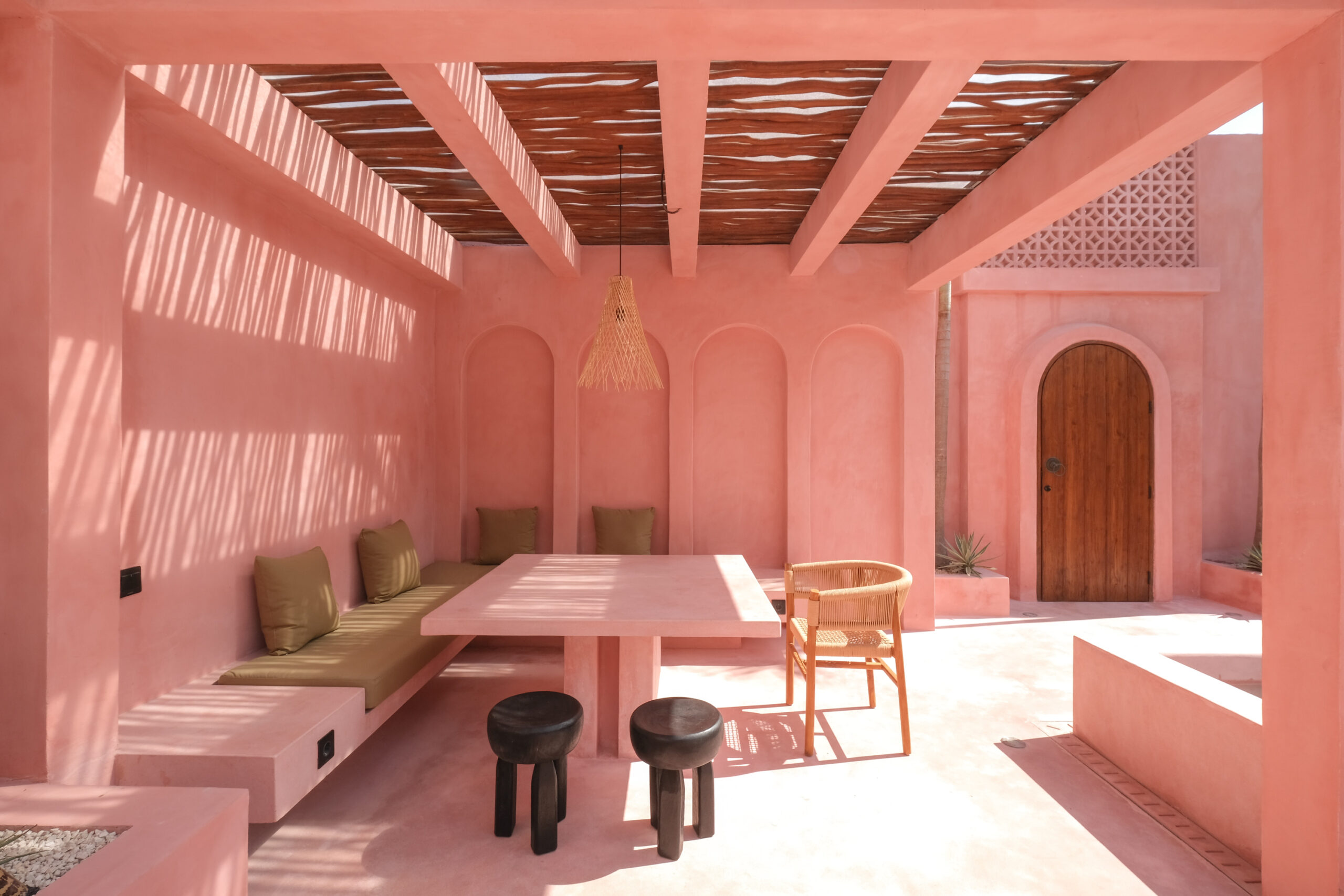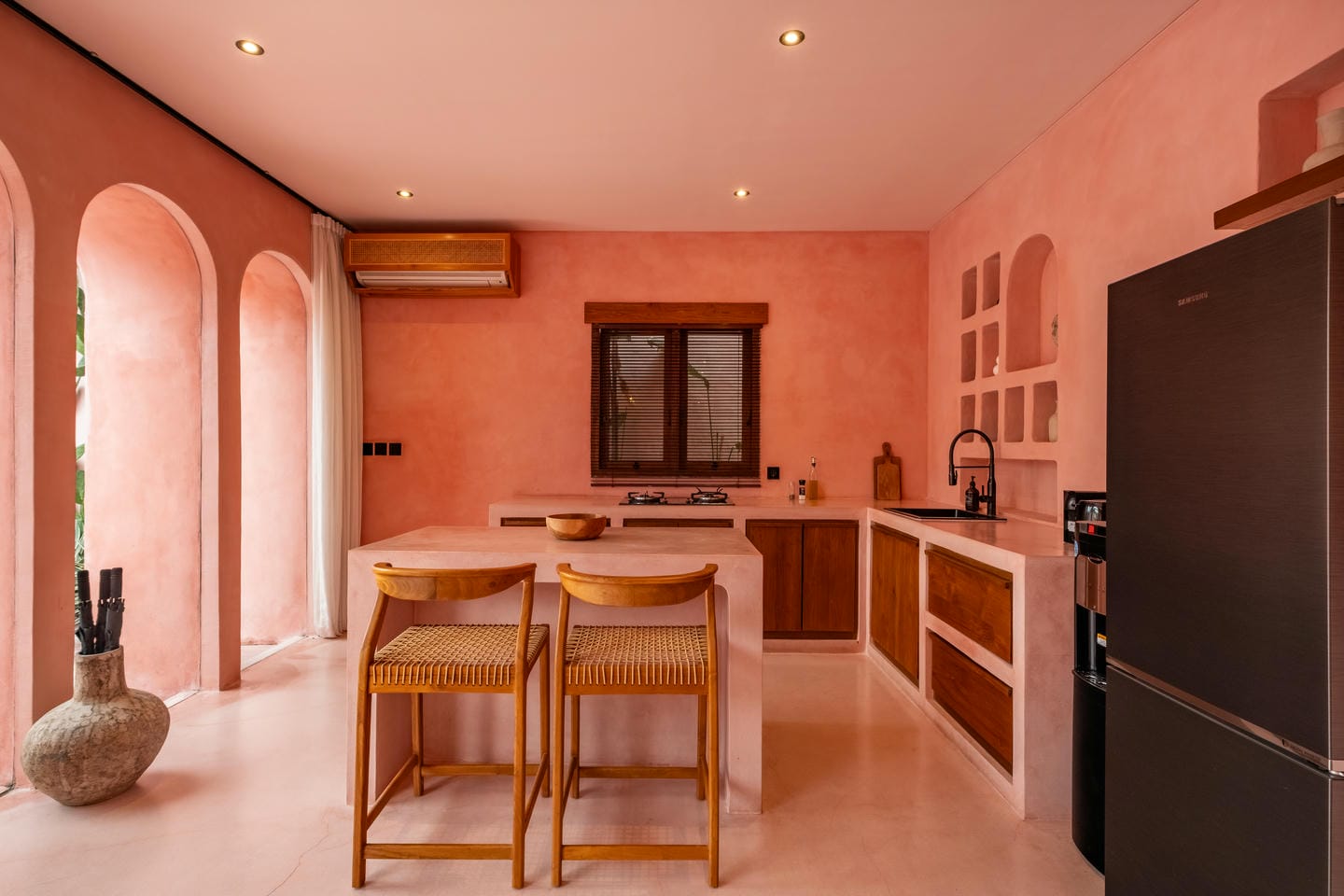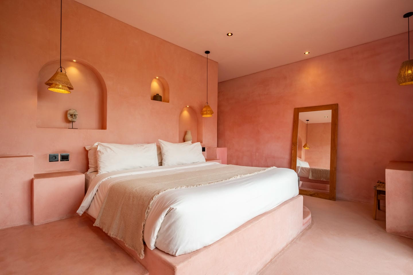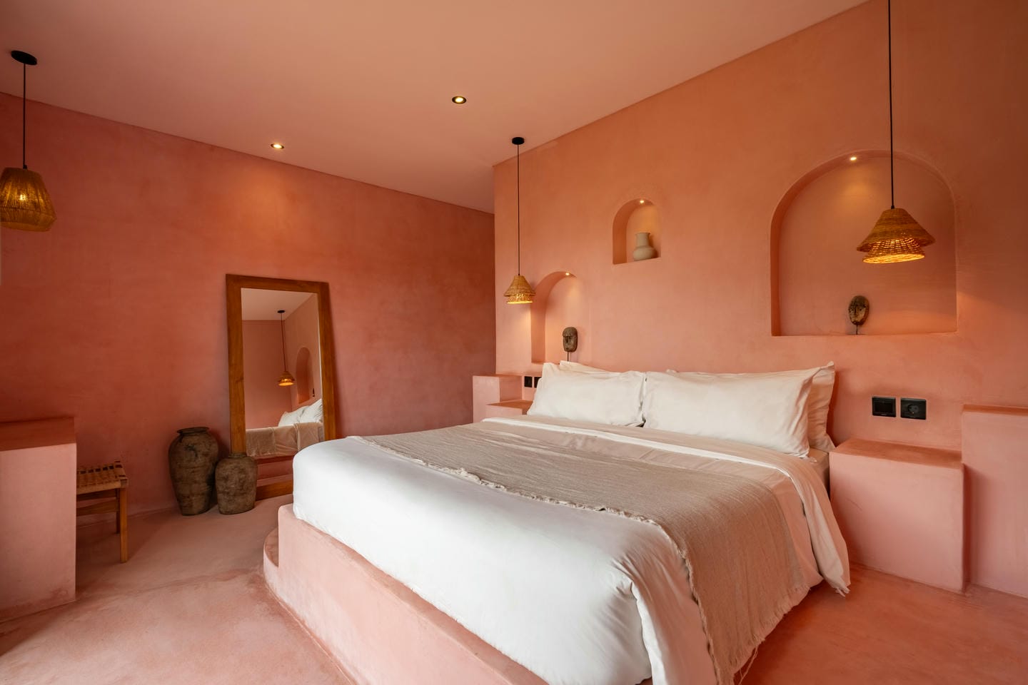 Les intérieurs présentent une esthétique méditerranéenne–tropicale chaleureuse, avec des tons terracotta doux, des arches arrondies, des textures naturelles et des finitions minimalistes épurées. L’espace de vie et de salle à manger décloisonné est lumineux et fluide, tandis que les deux chambres offrent des refuges calmes et intimistes, avec des aménagements intégrés et un éclairage d’ambiance délicat.