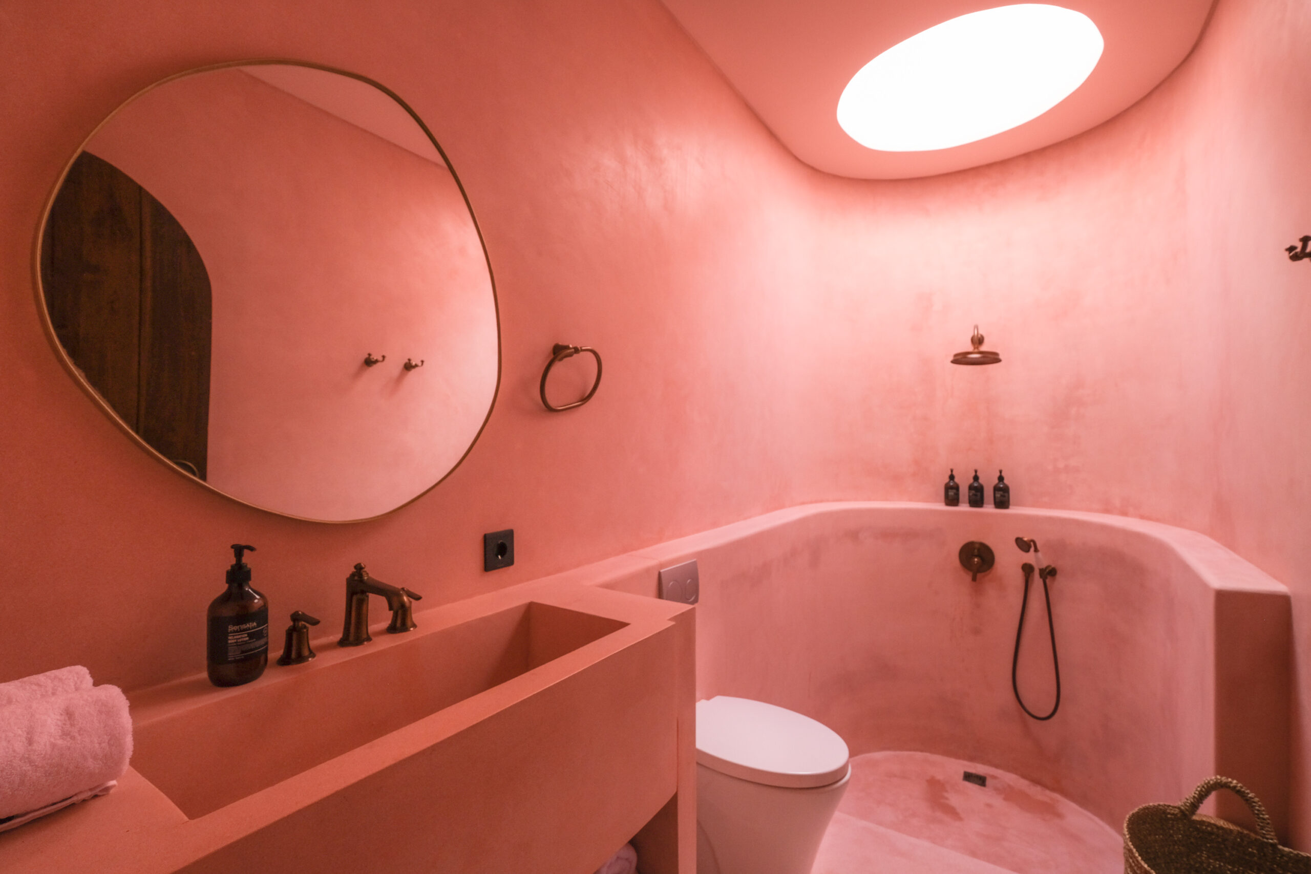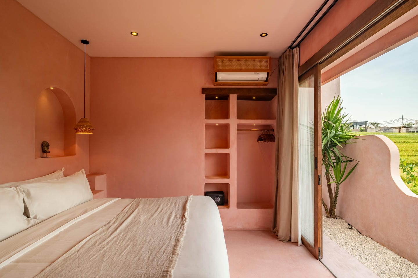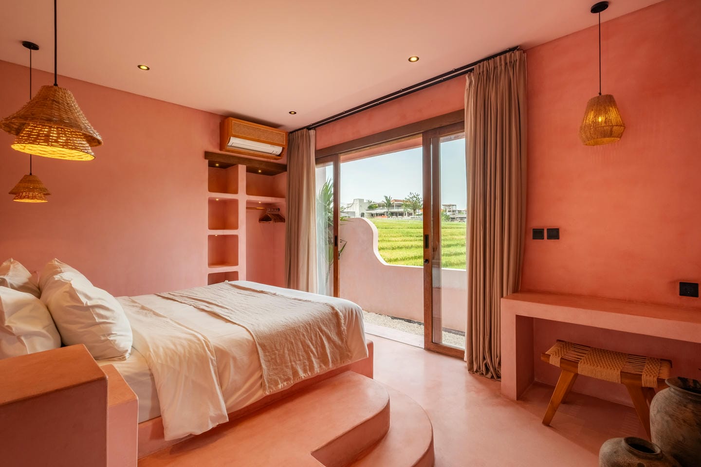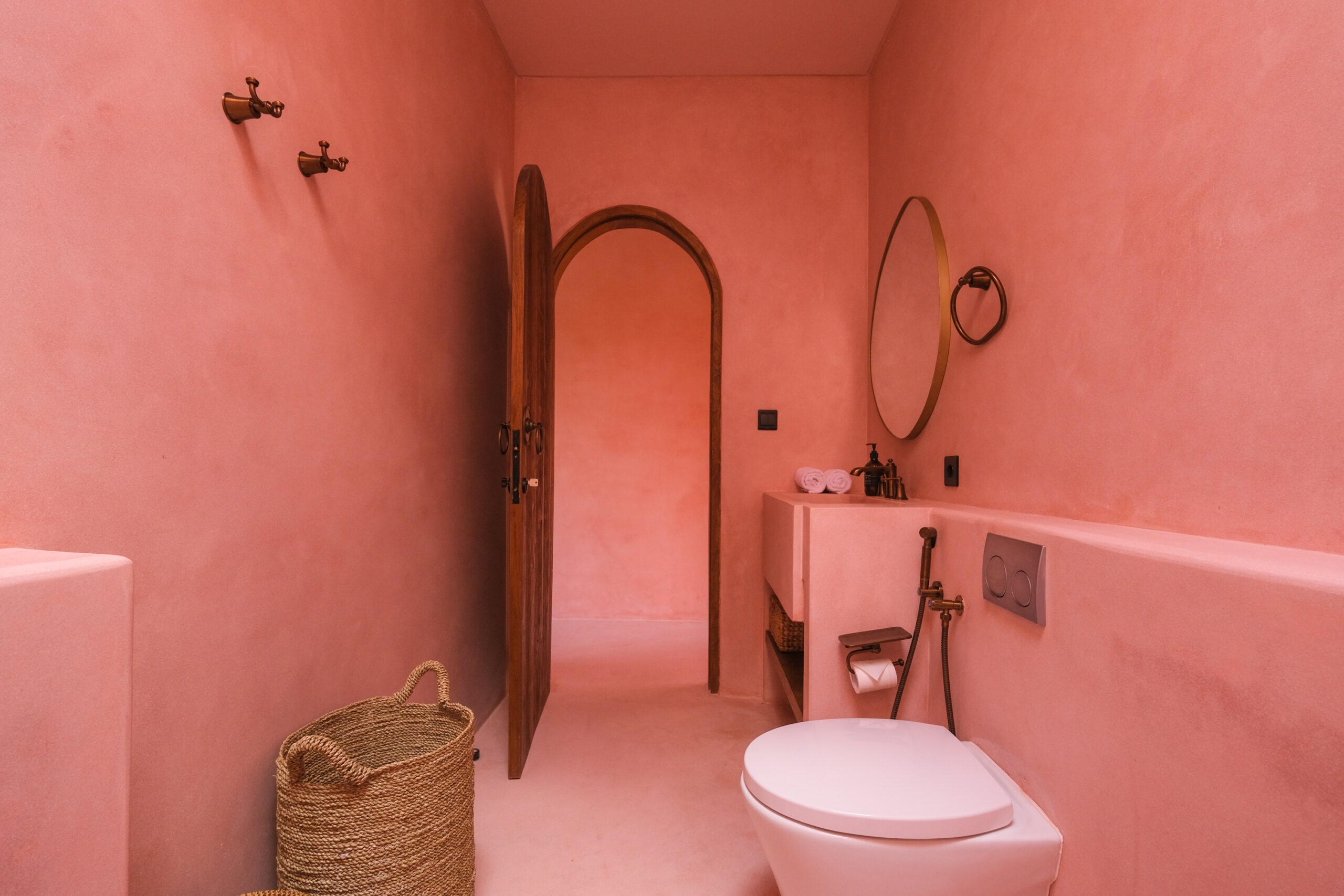 Les intérieurs présentent une esthétique méditerranéenne–tropicale chaleureuse, avec des tons terracotta doux, des arches arrondies, des textures naturelles et des finitions minimalistes épurées. L’espace de vie et de salle à manger décloisonné est lumineux et fluide, tandis que les deux chambres offrent des refuges calmes et intimistes, avec des aménagements intégrés et un éclairage d’ambiance délicat.