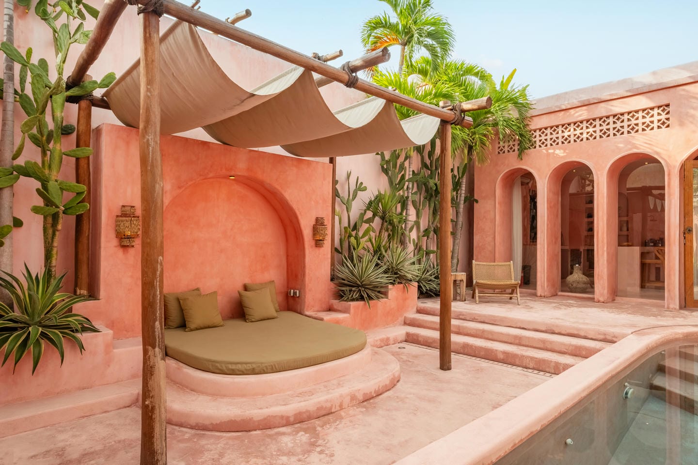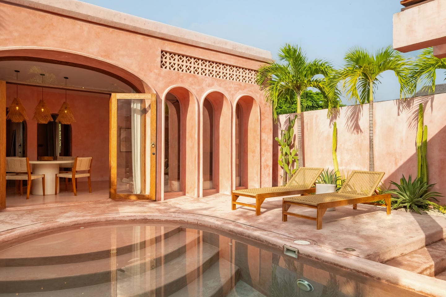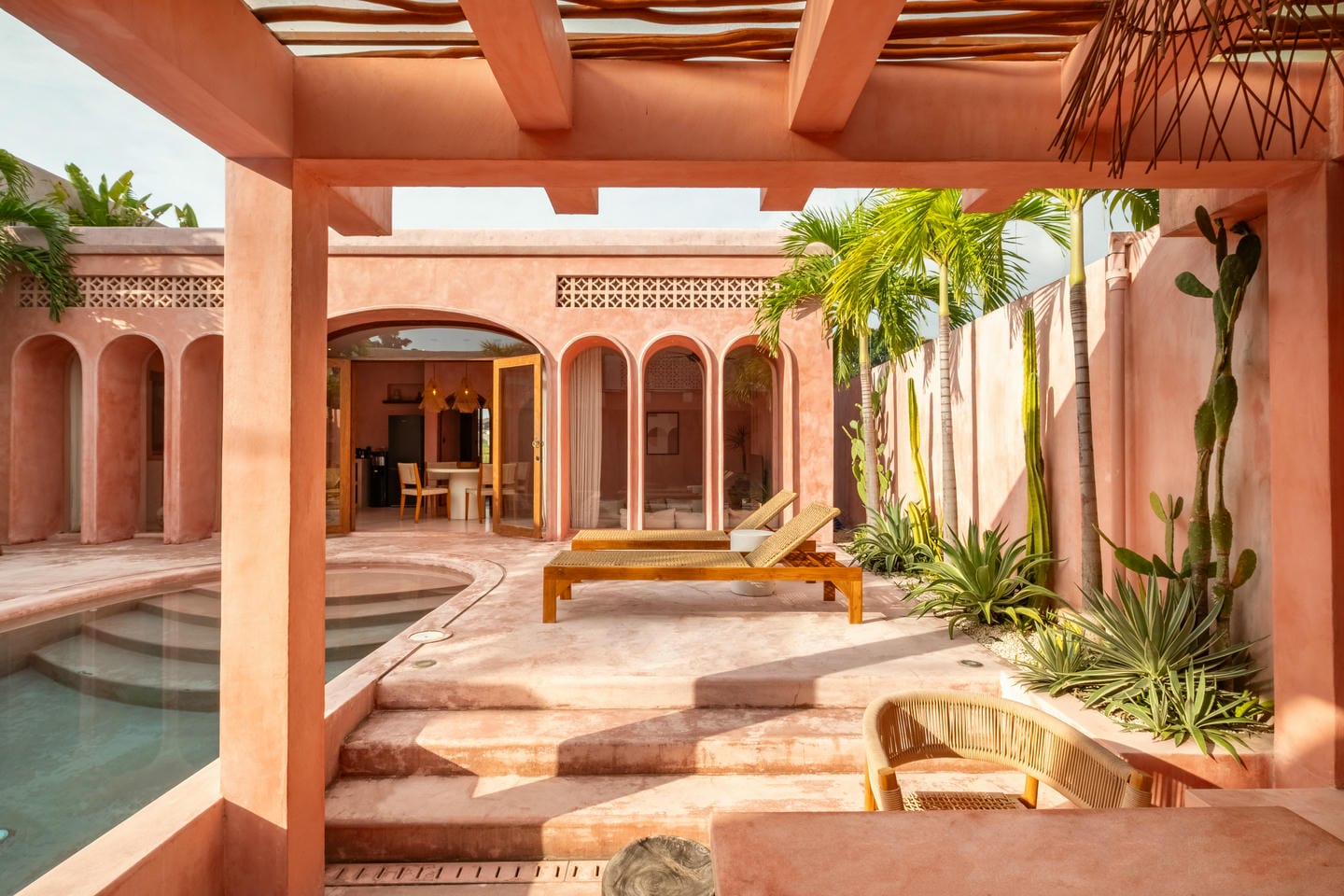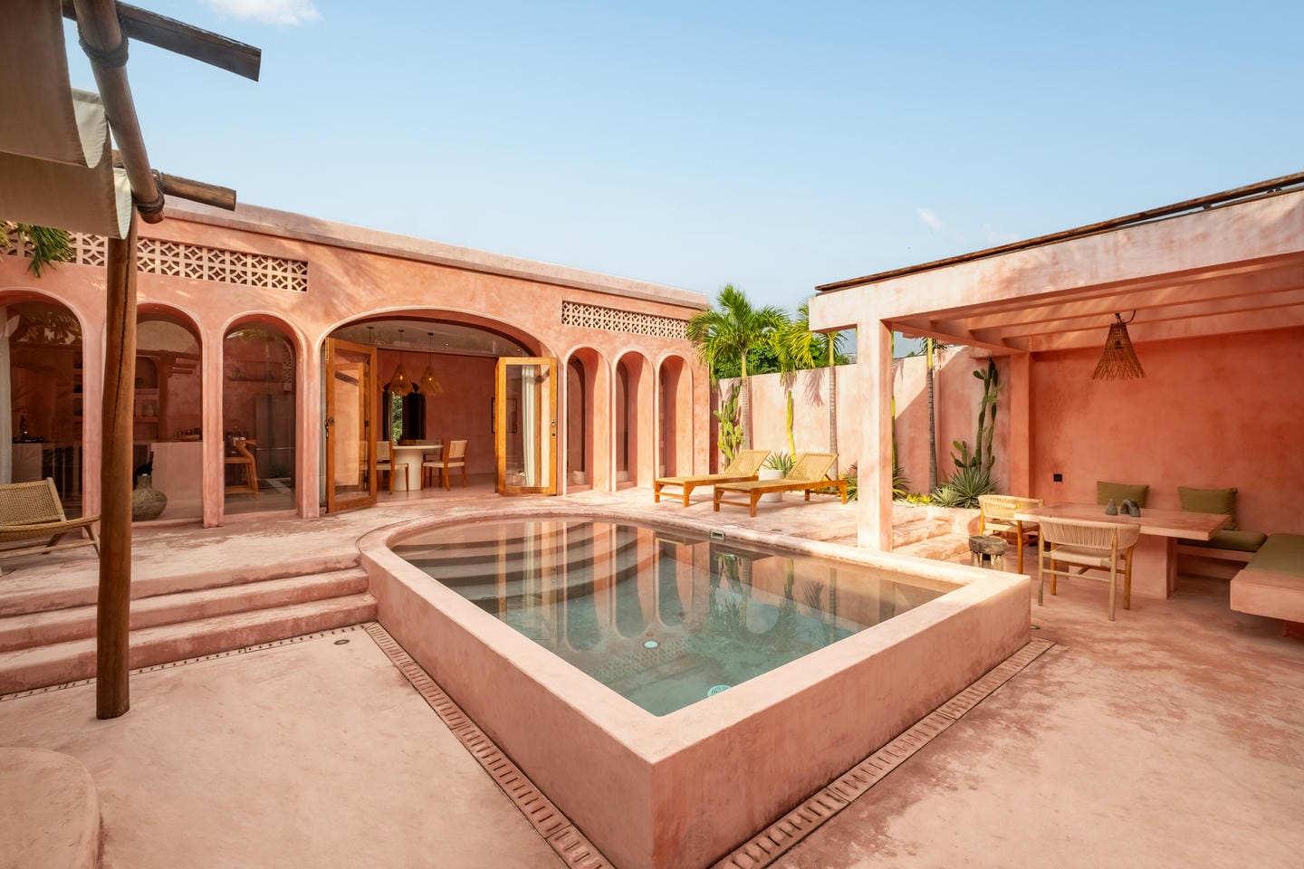 À l’extérieur, chaque villa s’ouvre sur une cour privée organisée autour d’une piscine, entourée d’une végétation tropicale luxuriante et de bains de soleil. Cet espace extérieur clos garantit intimité et atmosphère détendue de type resort — idéal pour recevoir ou simplement se relaxer.