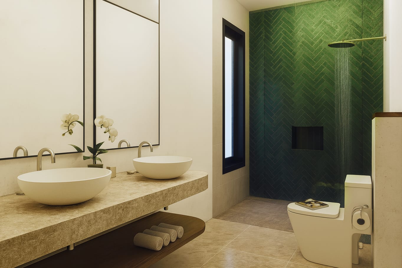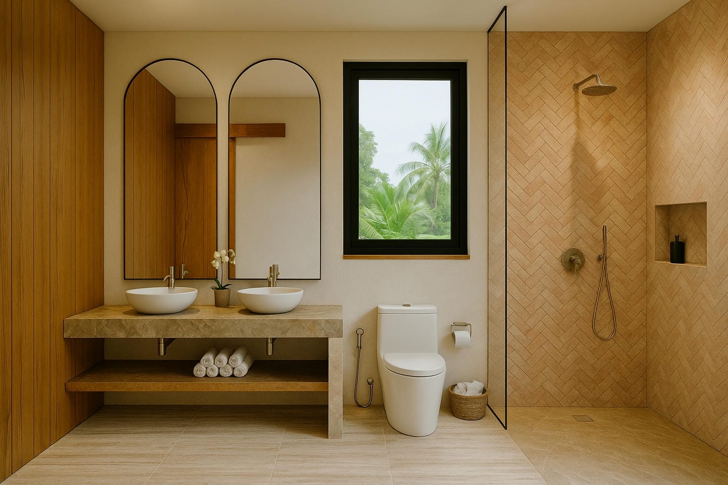 La villa comprend trois grandes chambres avec salles de bain attenantes, offrant intimité et confort. Chaque salle de bain se distingue par des doubles miroirs et des douches italiennes élégantes. Elle dispose également de deux espaces de vie distincts : un vaste salon au rez-de-chaussée harmonieusement intégré à la salle à manger et une cuisine moderne entièrement équipée.