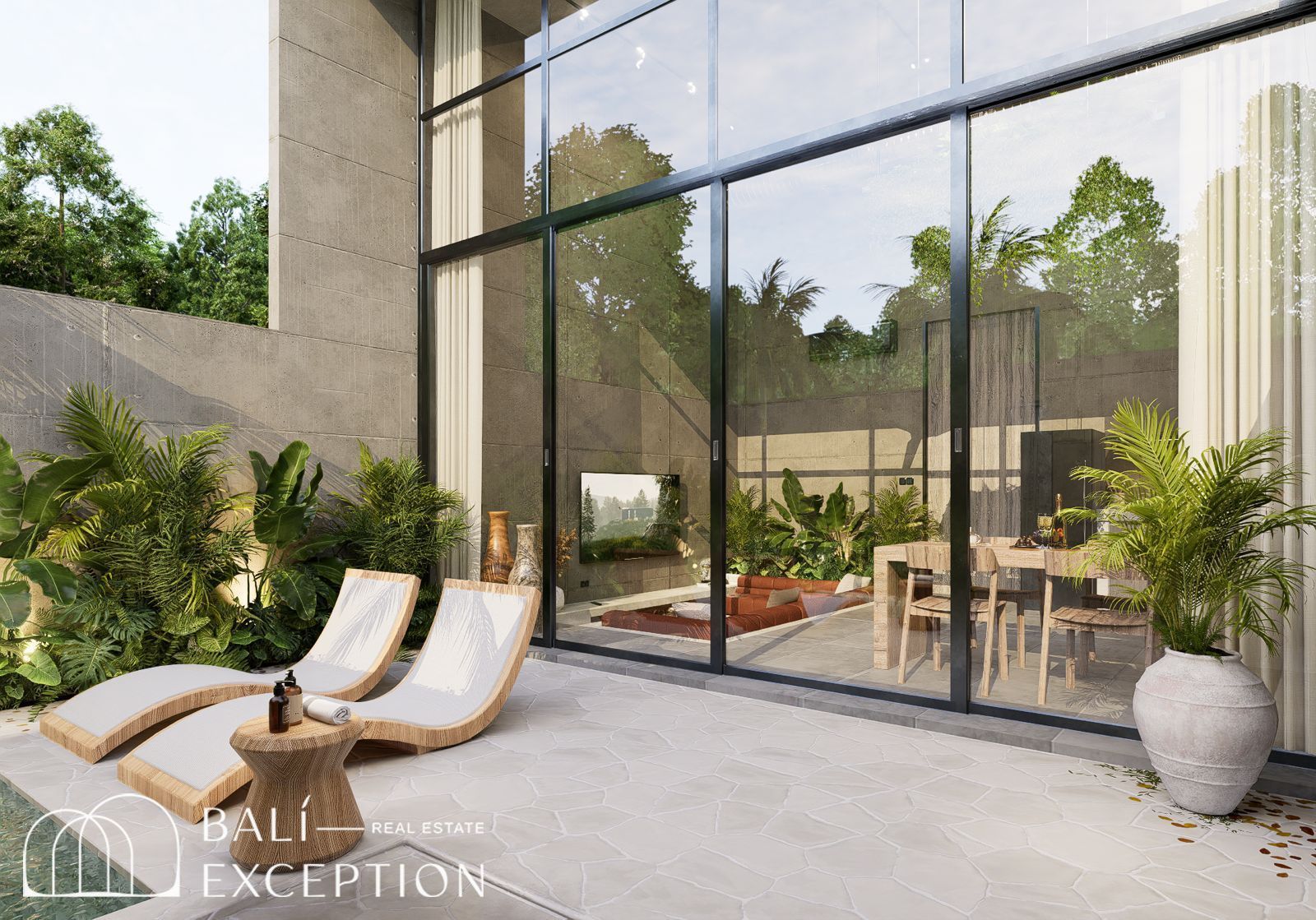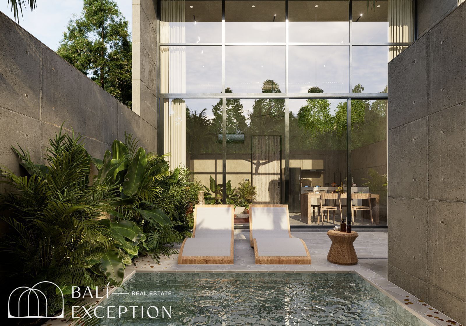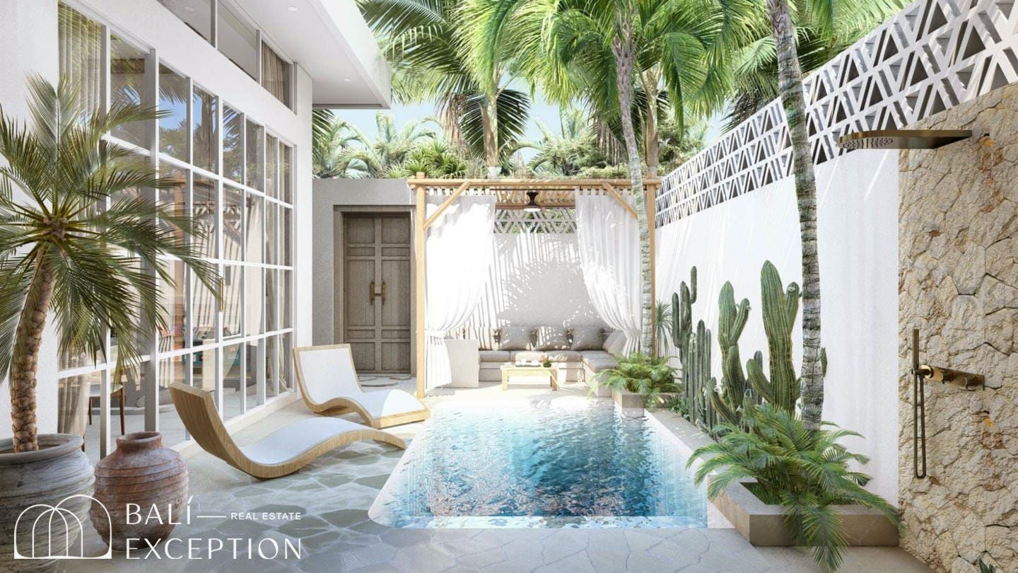 À l'extérieur, la villa offre une charmante piscine privée entourée d'une végétation luxuriante et de plantes tropicales. L'agencement en cour intérieure procure une sensation de calme et de semi-ouverture, avec une vue directe sur la piscine depuis la chambre, sublimant ainsi la transition entre l'intérieur et l'extérieur.
