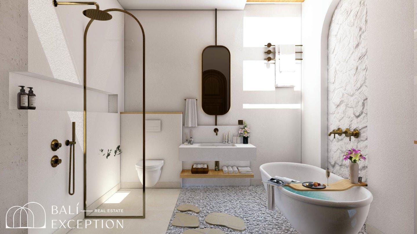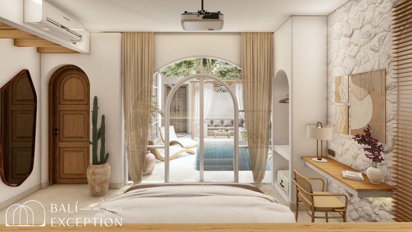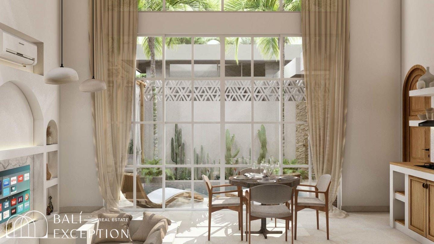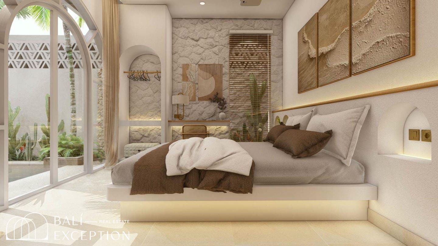 La villa, de plain-pied, comprend une chambre et une salle de bains, et arbore un style tropical minimaliste chaleureux. L'intérieur mêle des textures naturelles comme les murs en pierre, des tons neutres doux et des touches de bois, créant une atmosphère calme et accueillante. De grandes fenêtres cintrées et des portes vitrées laissent entrer la lumière naturelle en abondance.