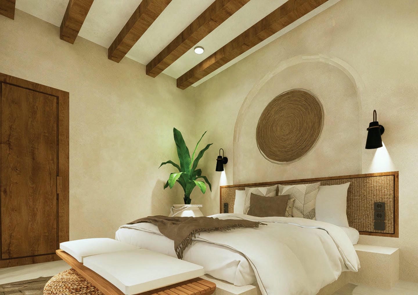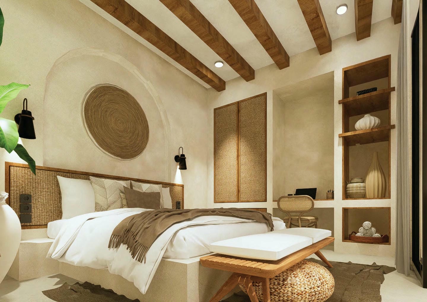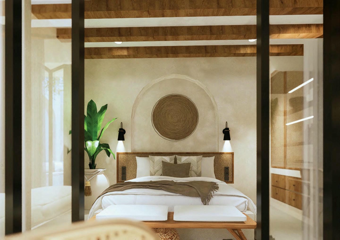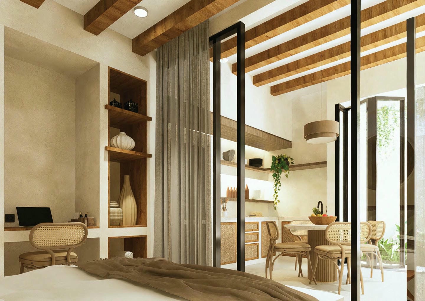 Les villas d’une chambre sont construites sur environ 60 m² de terrain avec une surface habitable de 45 m². Elles disposent d’une chambre confortable avec salle de bain attenante, d’un dressing intégré, d’une cuisine entièrement équipée et d’un espace de vie ouvert. Un espace de travail dédié est inclus, rendant l’agencement idéal pour le télétravail et les séjours de longue durée. Chaque villa est livrée entièrement meublée et prête à être habitée, avec un design qui privilégie la fonctionnalité et la simplicité de vie.