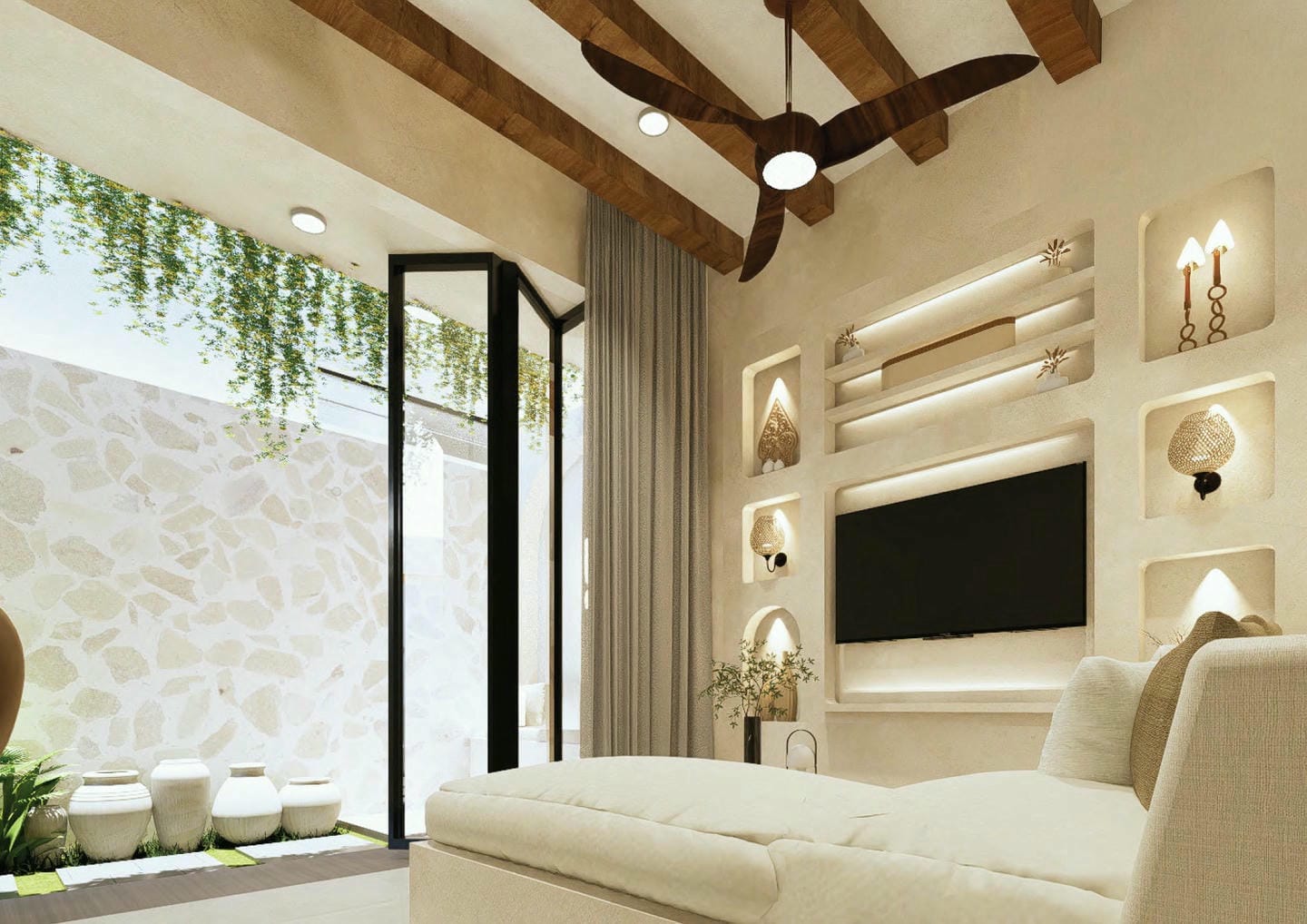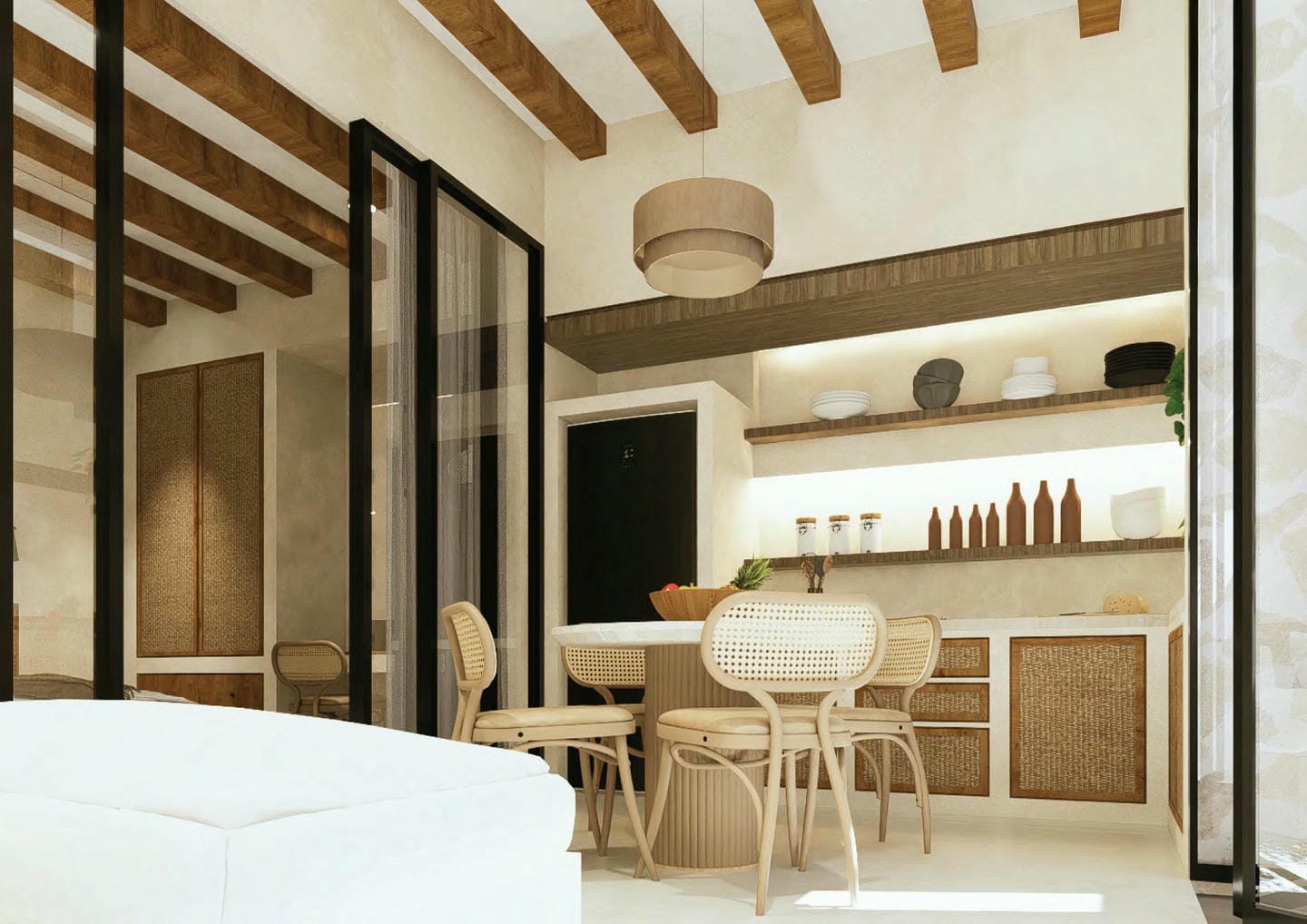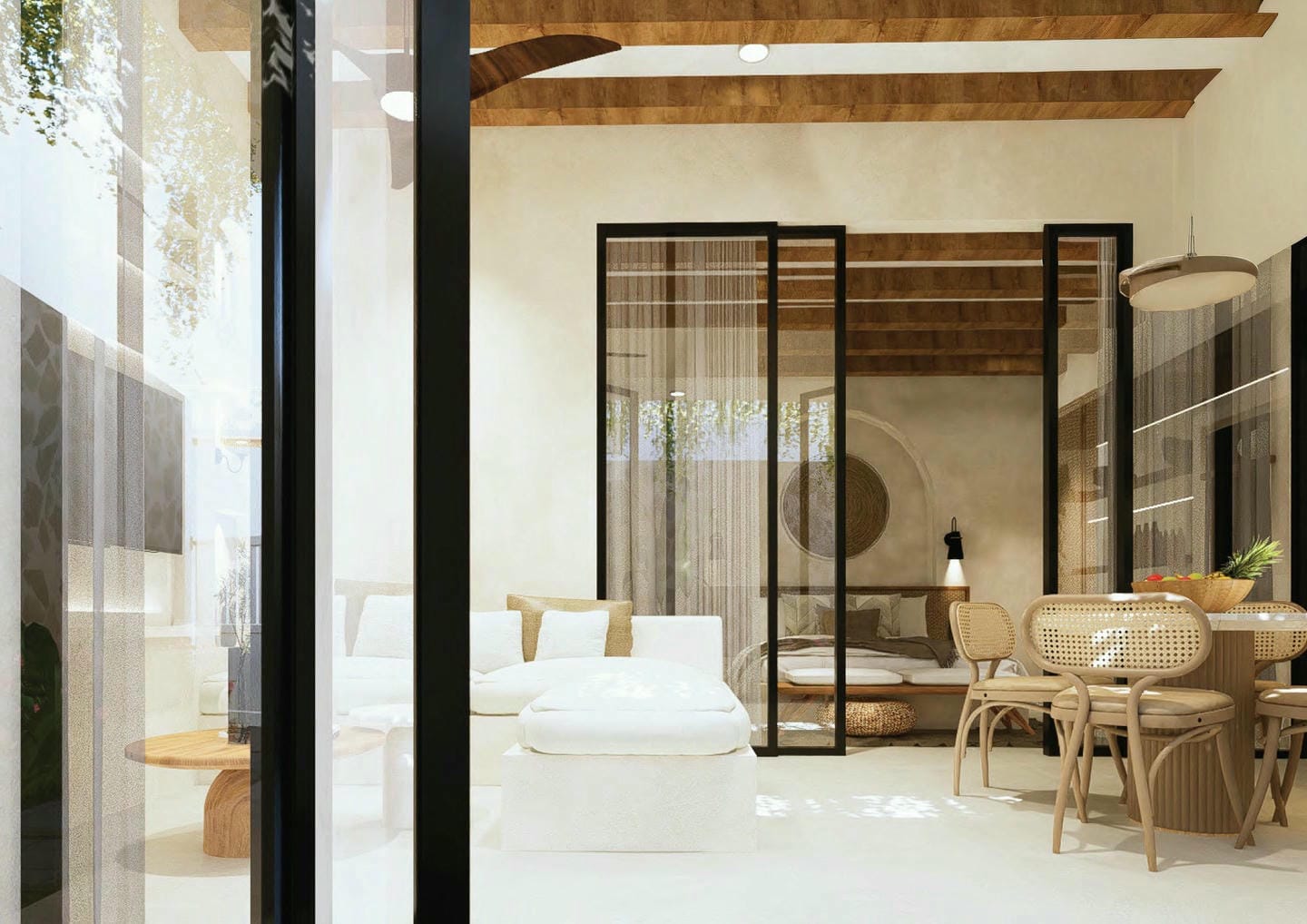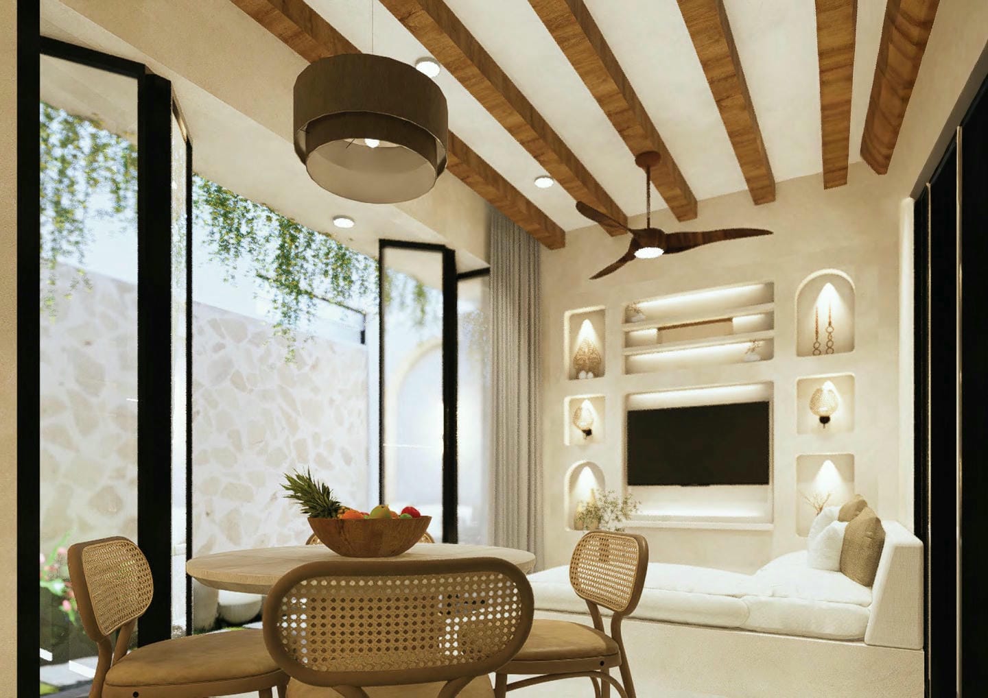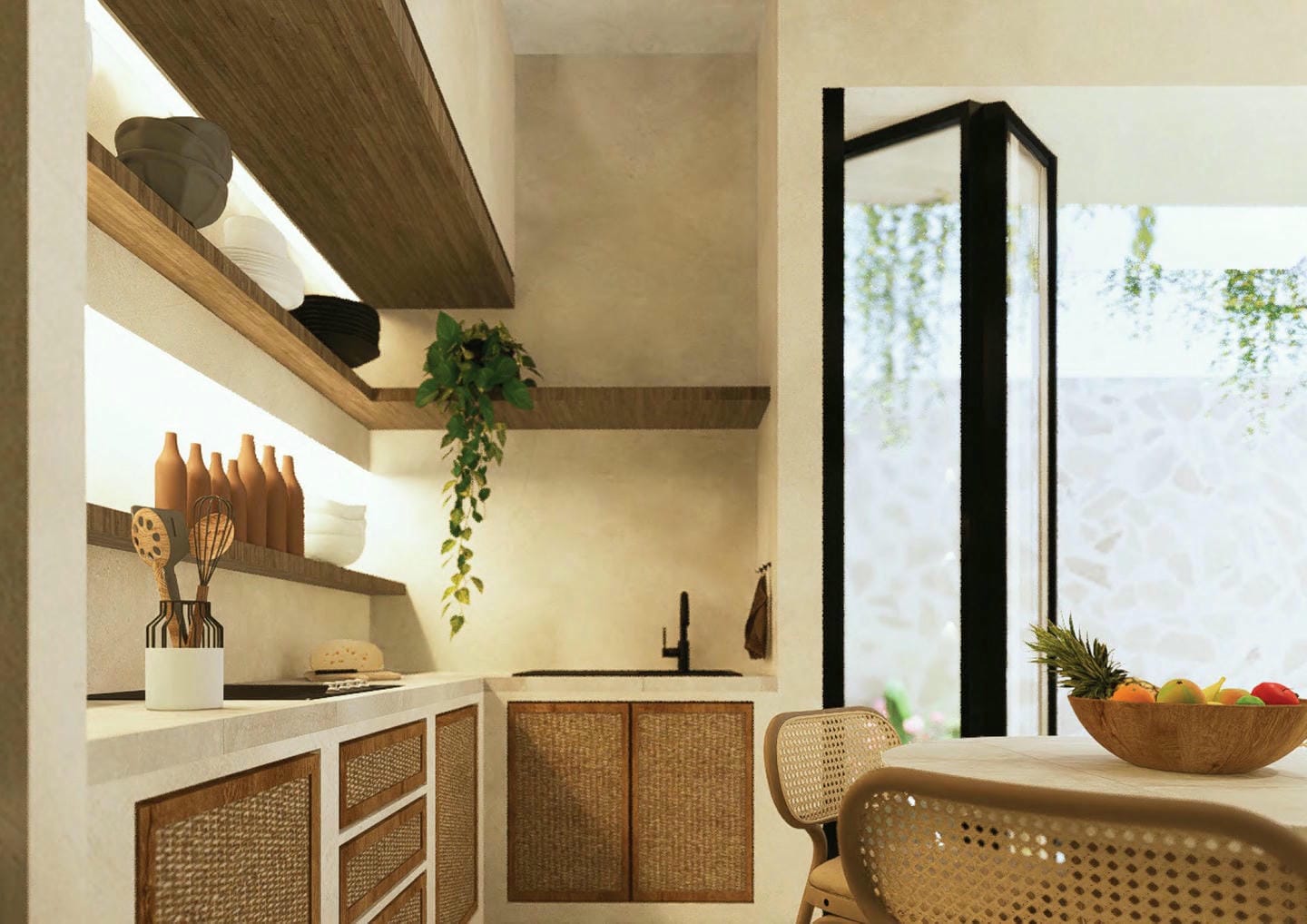 Les villas d’une chambre sont construites sur environ 60 m² de terrain avec une surface habitable de 45 m². Elles disposent d’une chambre confortable avec salle de bain attenante, d’un dressing intégré, d’une cuisine entièrement équipée et d’un espace de vie ouvert. Un espace de travail dédié est inclus, rendant l’agencement idéal pour le télétravail et les séjours de longue durée. Chaque villa est livrée entièrement meublée et prête à être habitée, avec un design qui privilégie la fonctionnalité et la simplicité de vie.