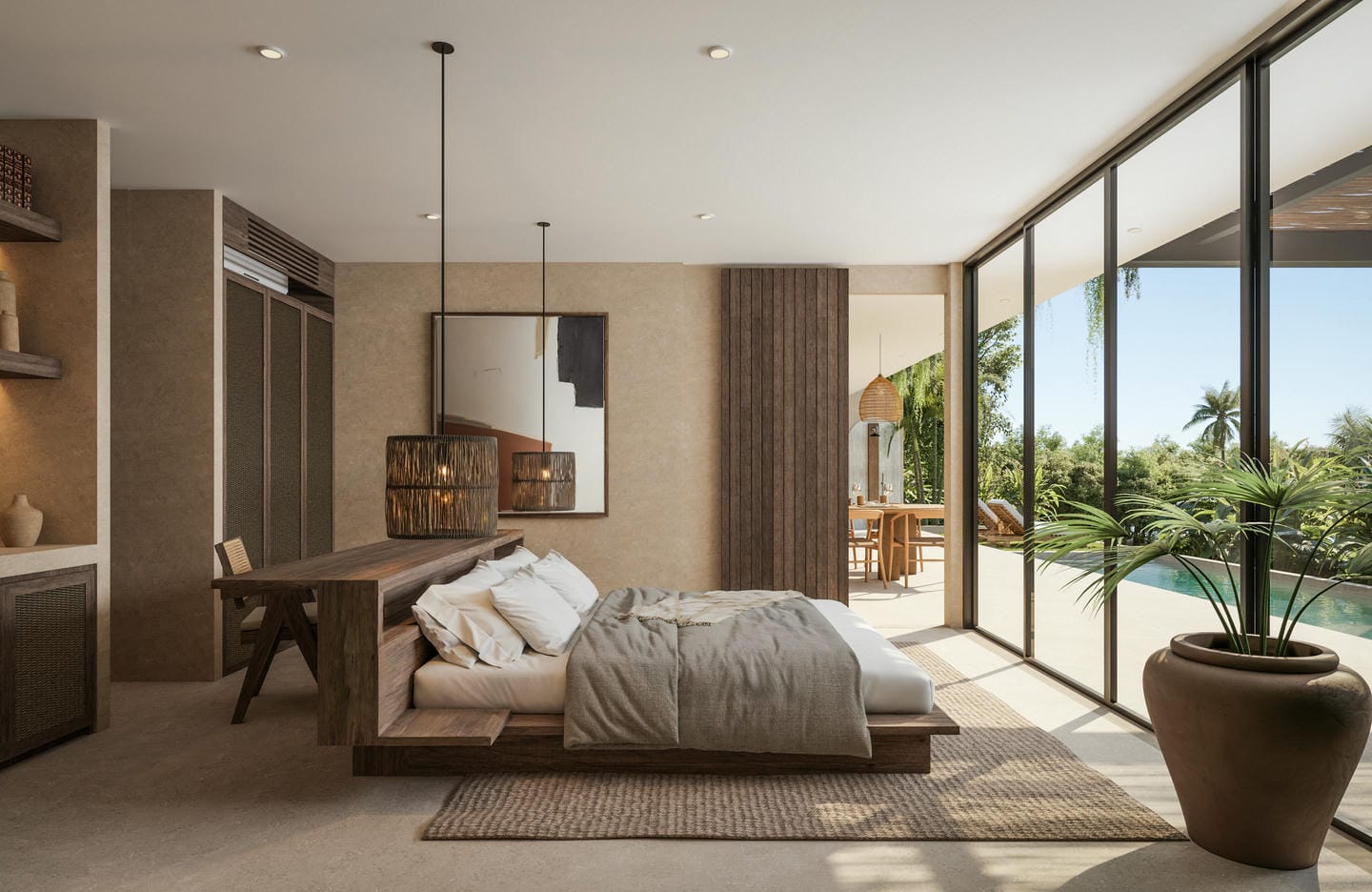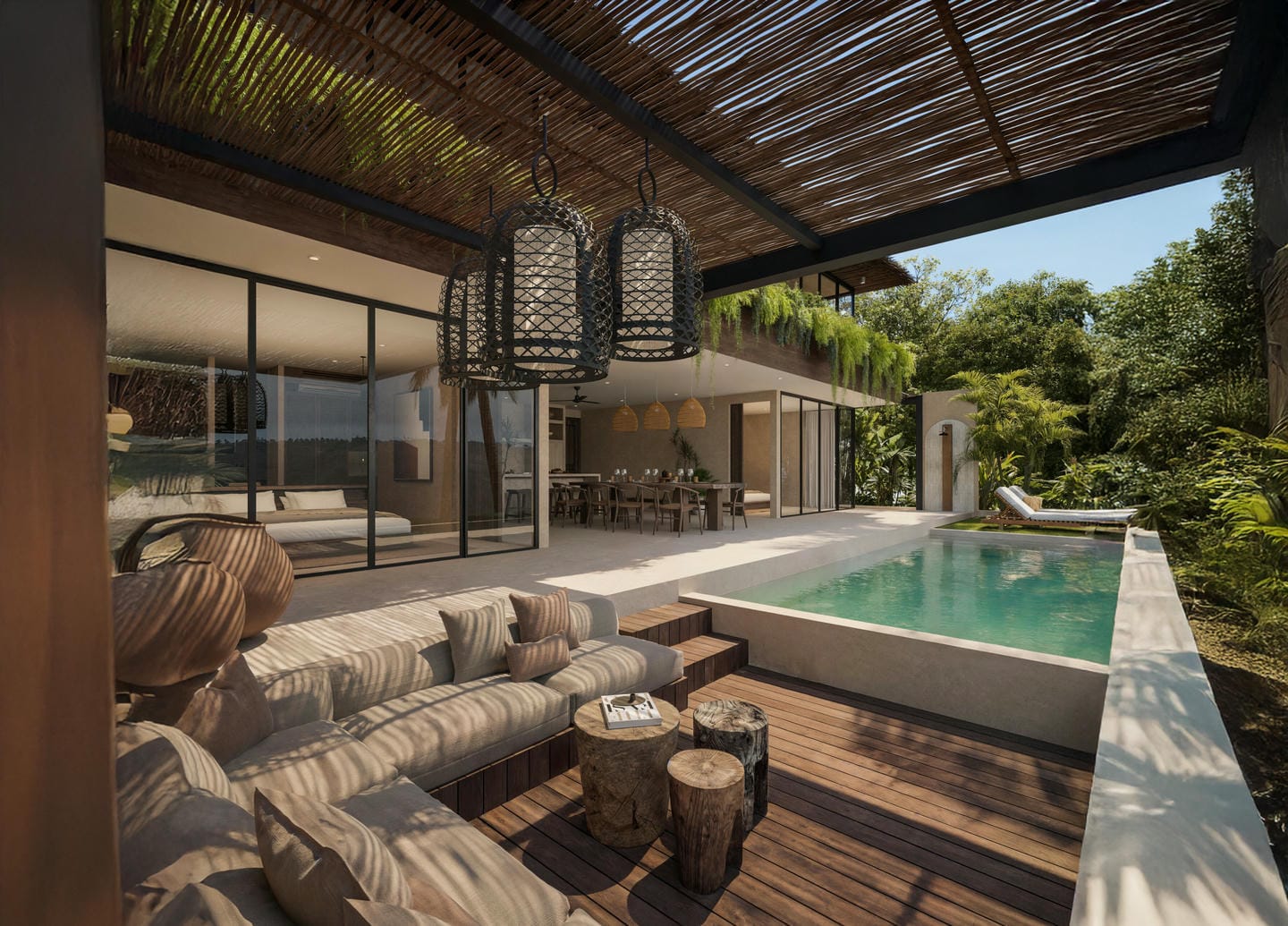 Le rez-de-chaussée comprend de vastes espaces de vie ouverts baignés de lumière naturelle, une cuisine moderne entièrement équipée avec des appareils haut de gamme, ainsi qu’une piscine à débordement privée entourée d’un jardin tropical luxuriant.