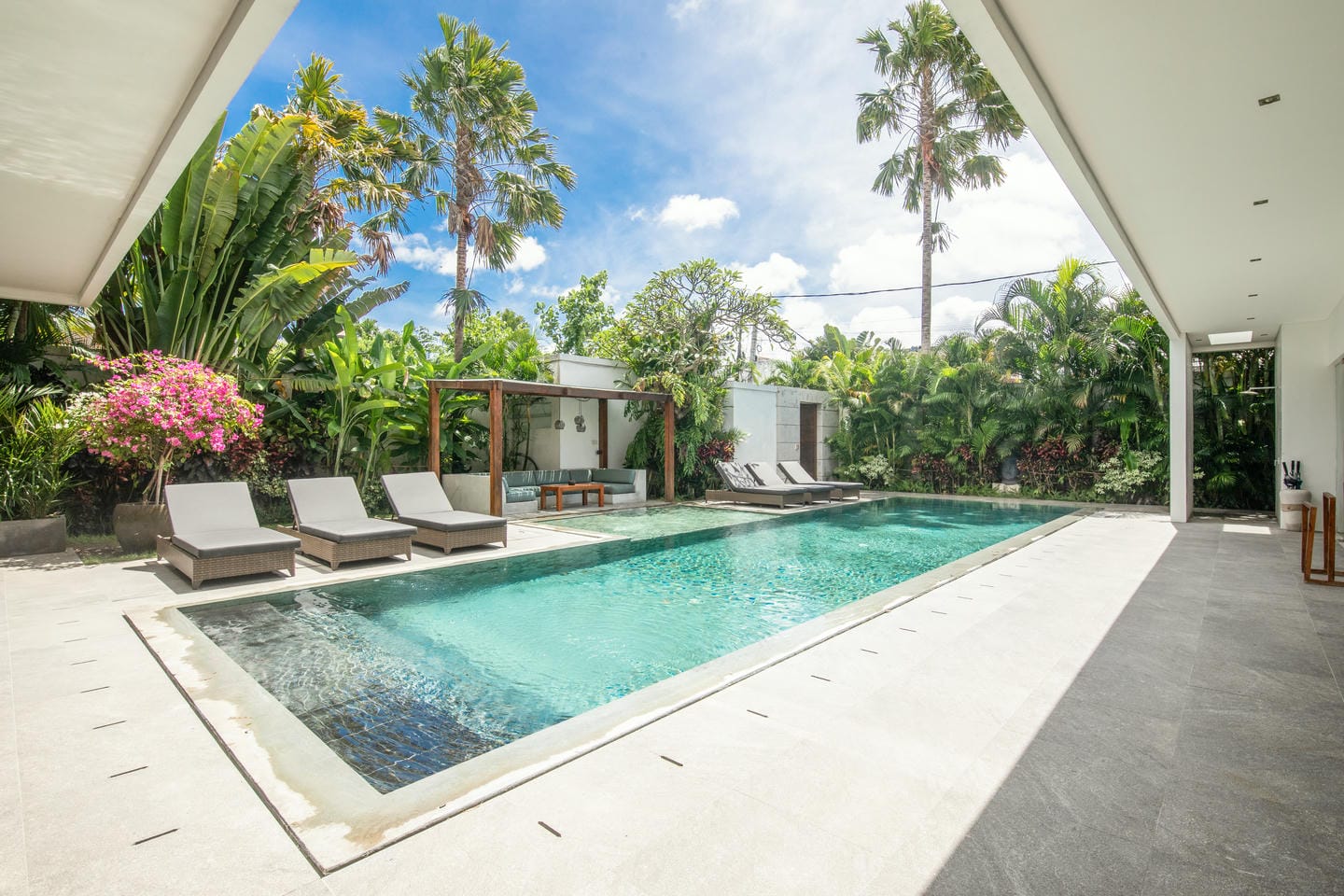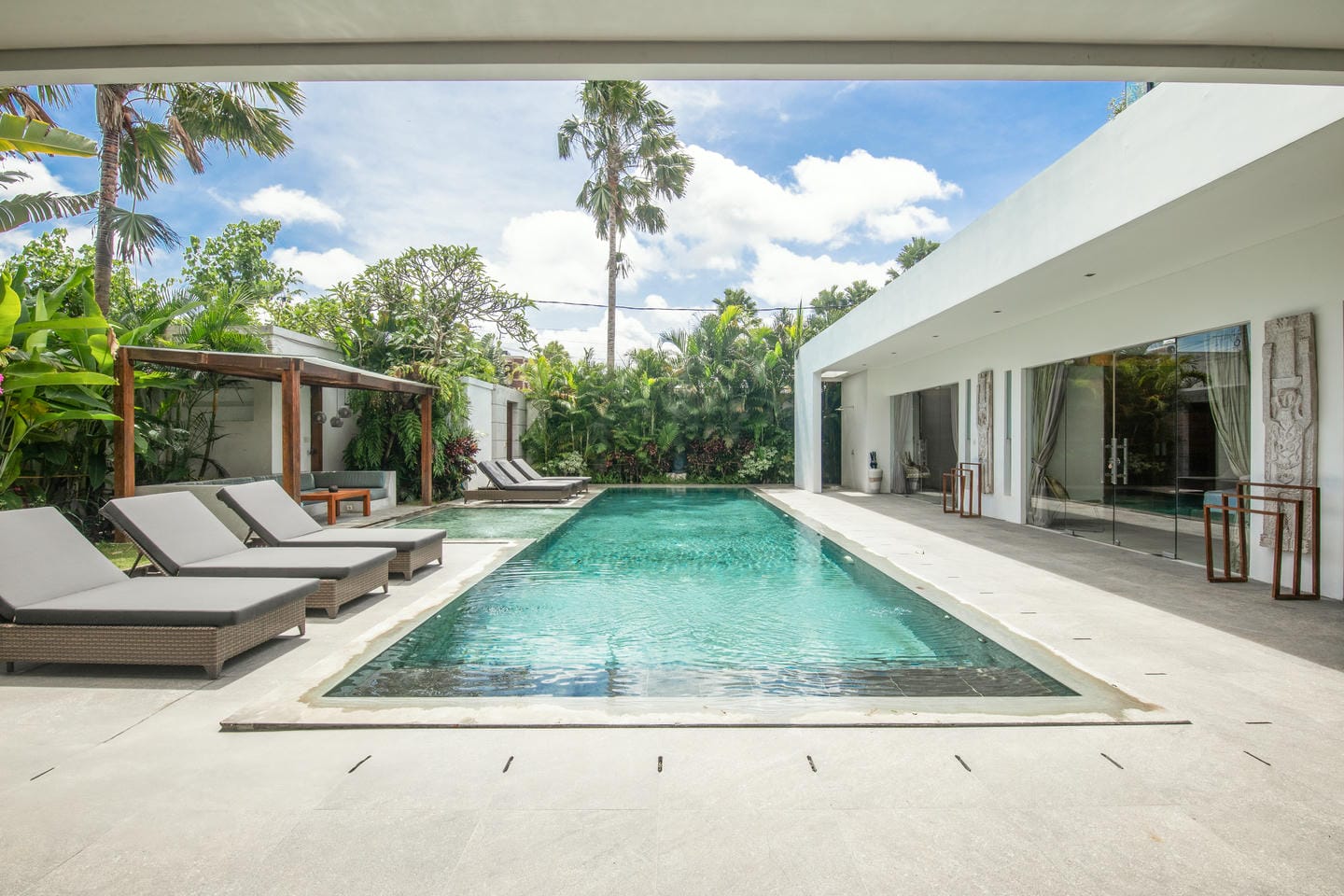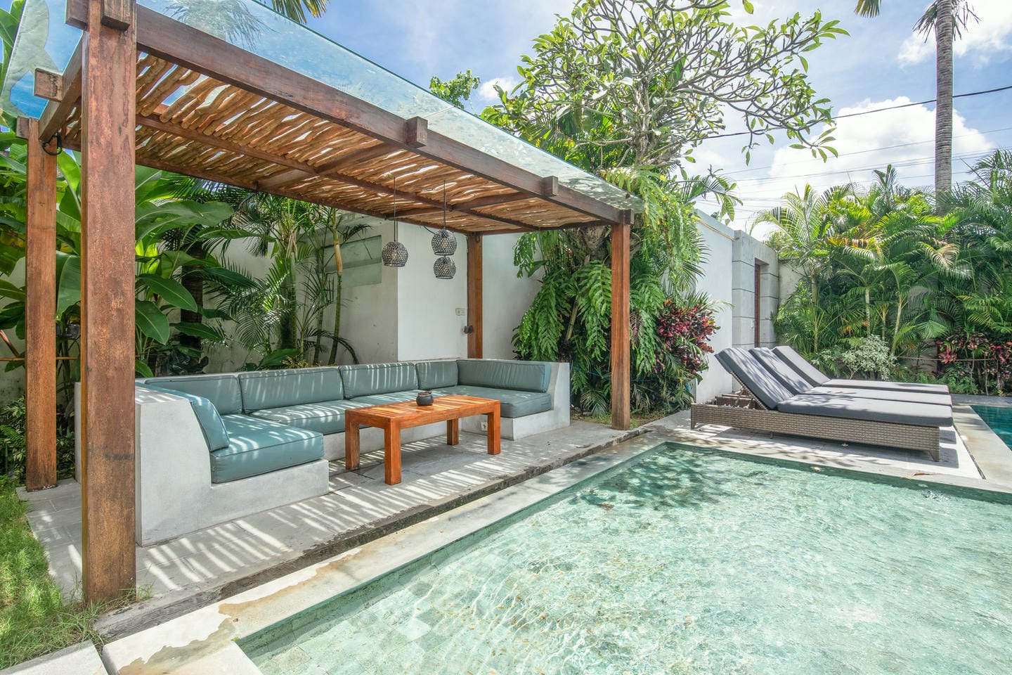 À l’extérieur, vous serez accueilli par une piscine privée entourée de chaises longues et d’un coin salon ombragé, parfait pour se détendre et profiter de l’ambiance tropicale de Bali.