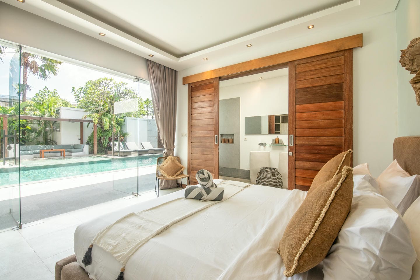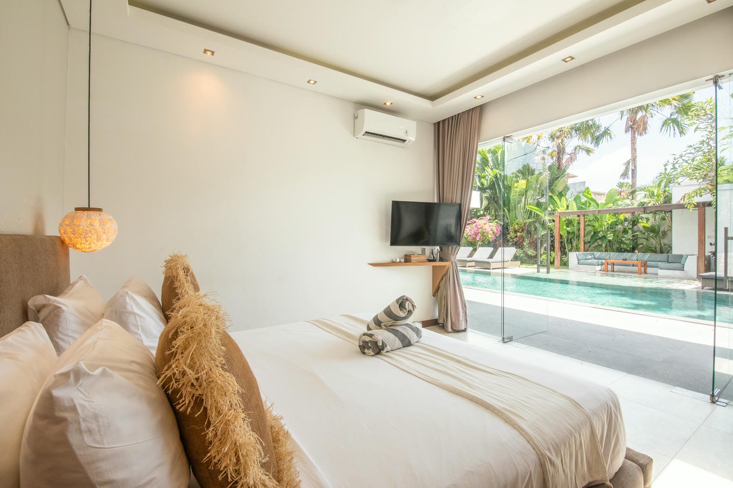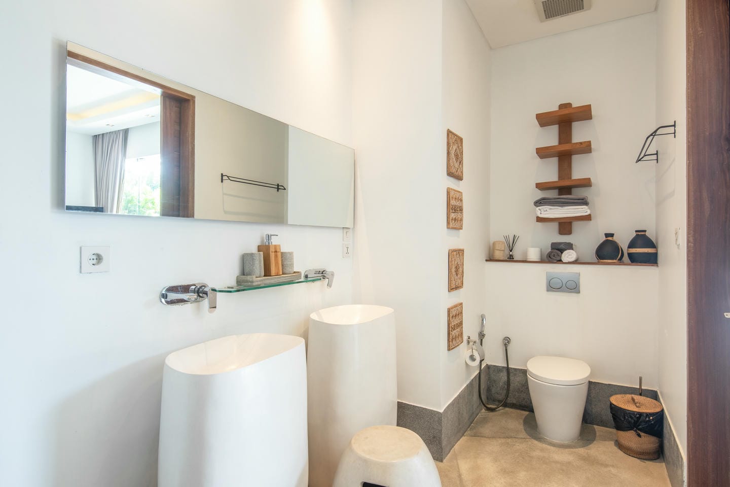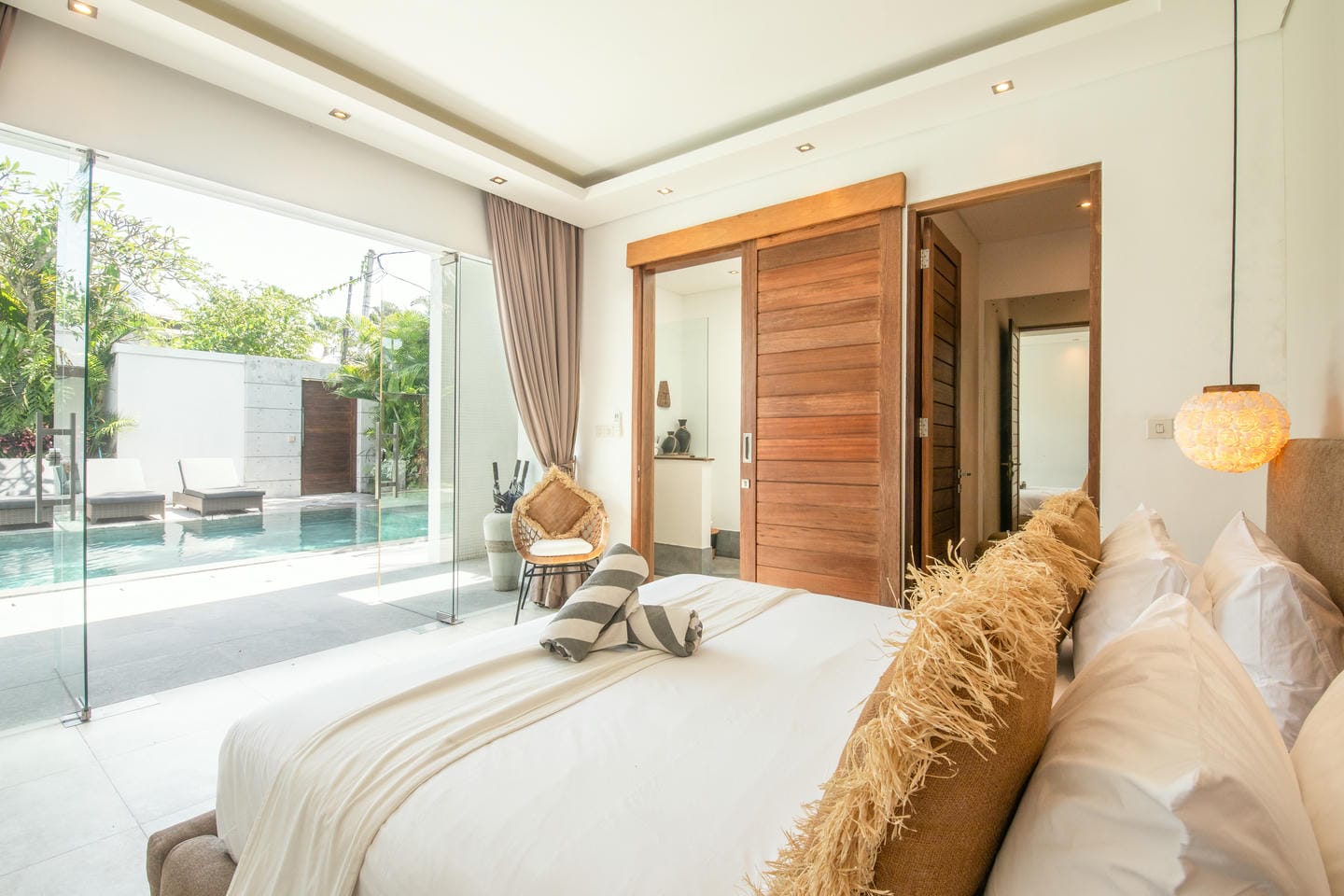 À l’extérieur, vous serez accueilli par une piscine privée entourée de chaises longues et d’un coin salon ombragé, parfait pour se détendre et profiter de l’ambiance tropicale de Bali.