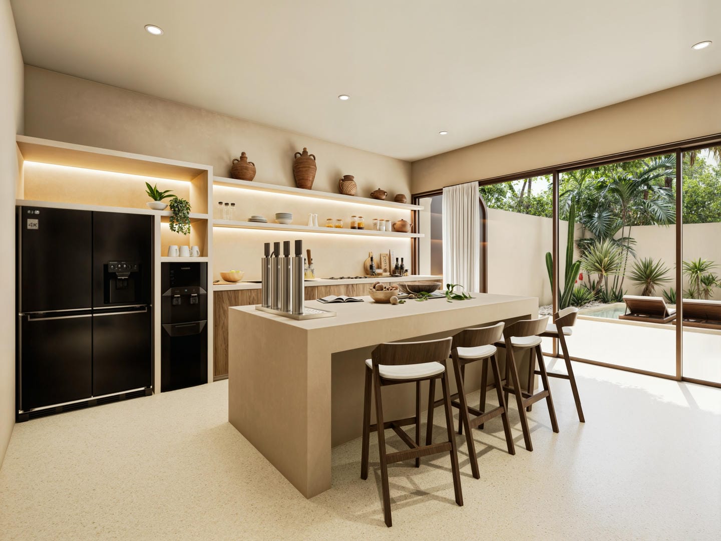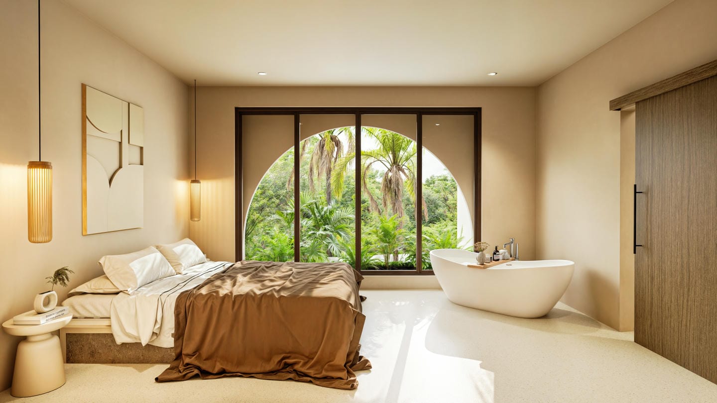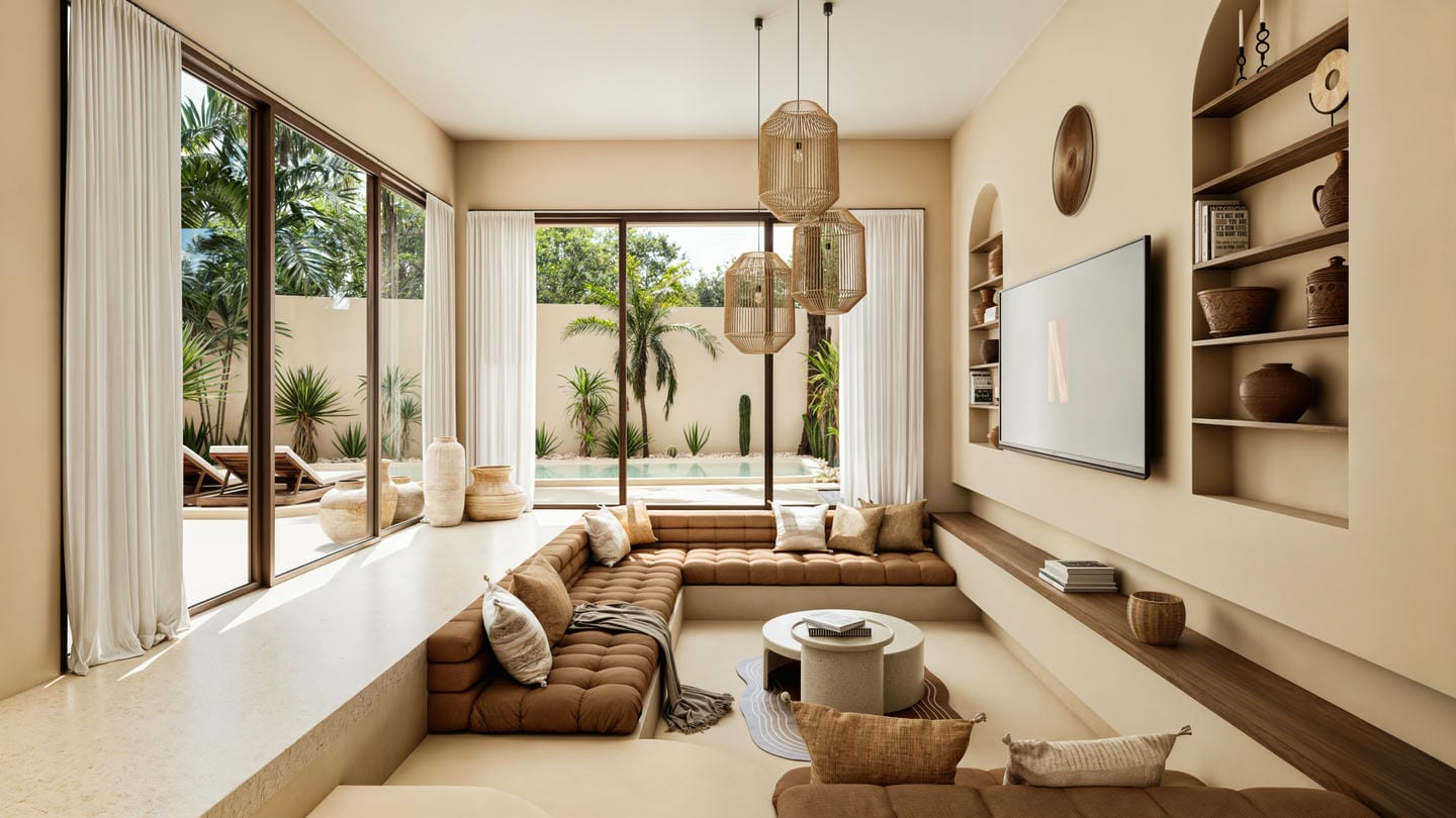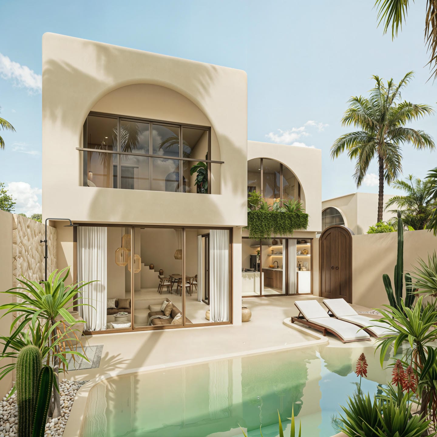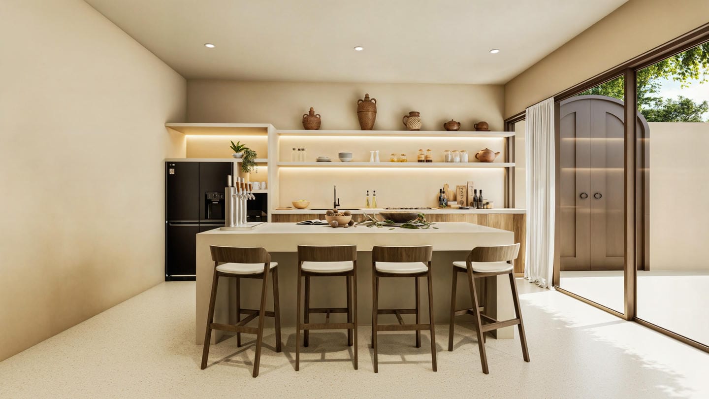 Cette villa tropicale moderne est conçue avec des tons naturels doux et une atmosphère chaleureuse et accueillante. L’espace de vie fermé s’ouvre sur une cuisine contemporaine et un coin salle à manger, sublimés par des finitions en bois chaleureux et des détails minimalistes épurés. La villa comprend deux chambres, deux salles de bains ainsi que des toilettes invités, offrant un confort idéal pour la vie quotidienne.
