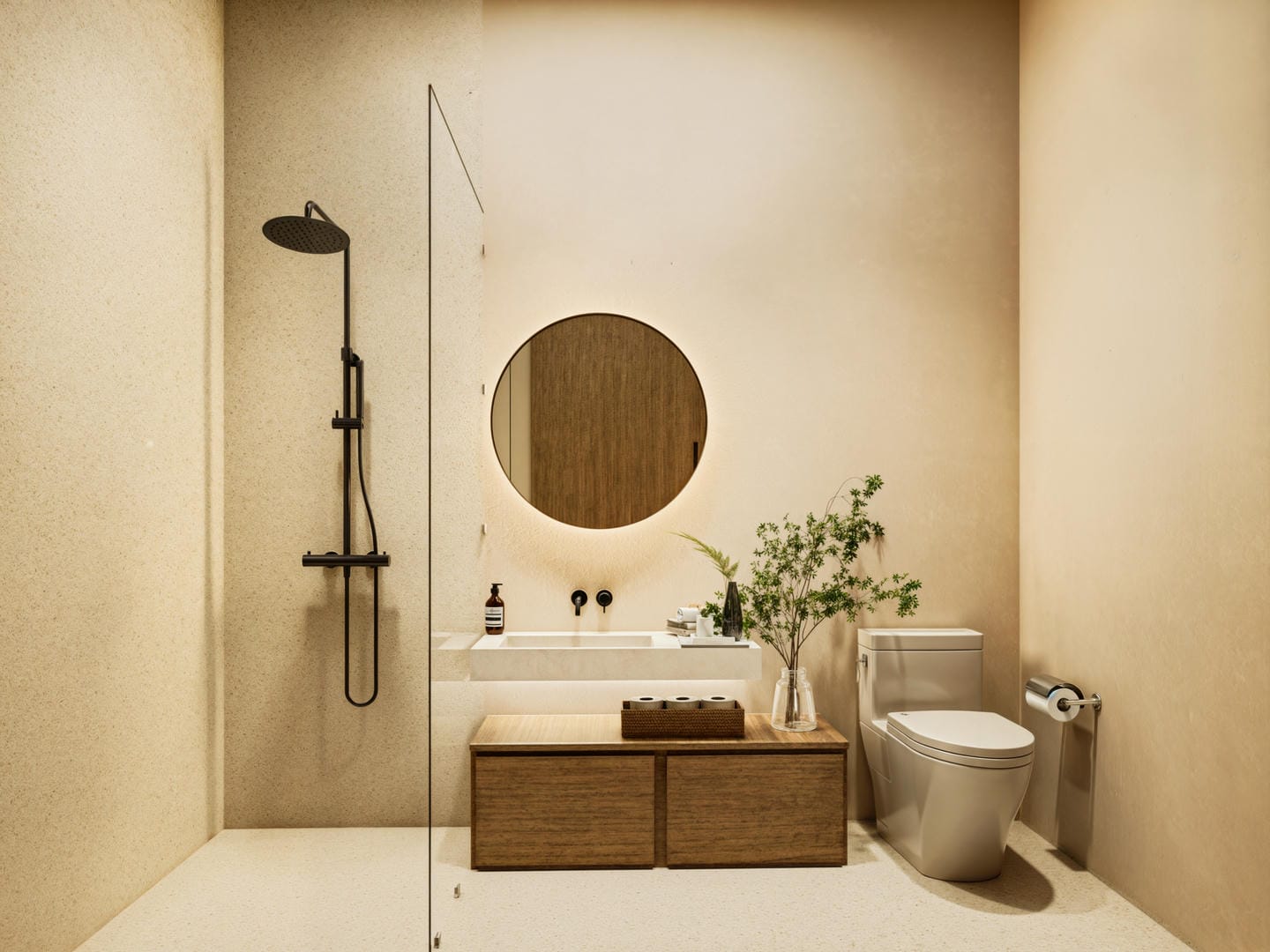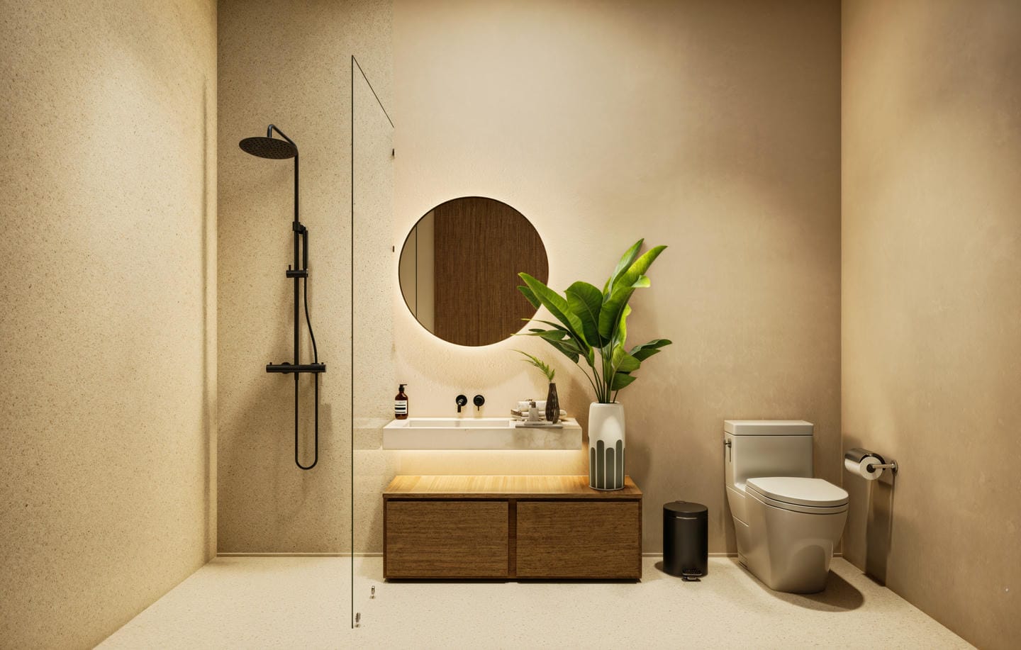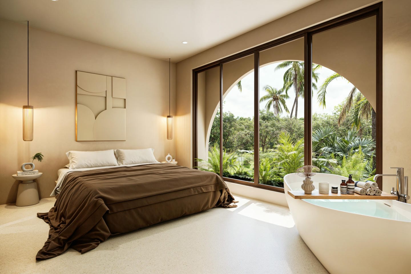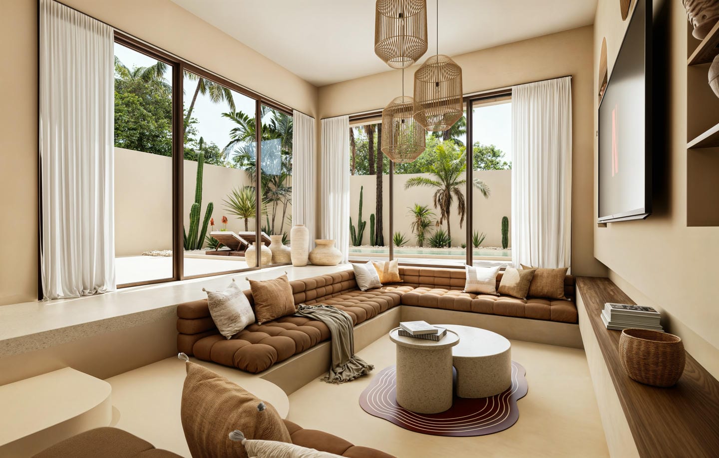 Cette villa tropicale moderne est conçue avec des tons naturels doux et une atmosphère chaleureuse et accueillante. L’espace de vie fermé s’ouvre sur une cuisine contemporaine et un coin salle à manger, sublimés par des finitions en bois chaleureux et des détails minimalistes épurés. La villa comprend deux chambres, deux salles de bains ainsi que des toilettes invités, offrant un confort idéal pour la vie quotidienne.
