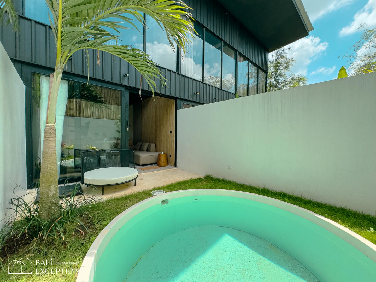 À l’extérieur, vous trouverez une petite piscine privée entourée d’un jardin – un endroit idéal pour se détendre au soleil. Les hauts murs garantissent une intimité totale, tandis que la façade noire moderne confère à la villa un look élégant et sophistiqué.