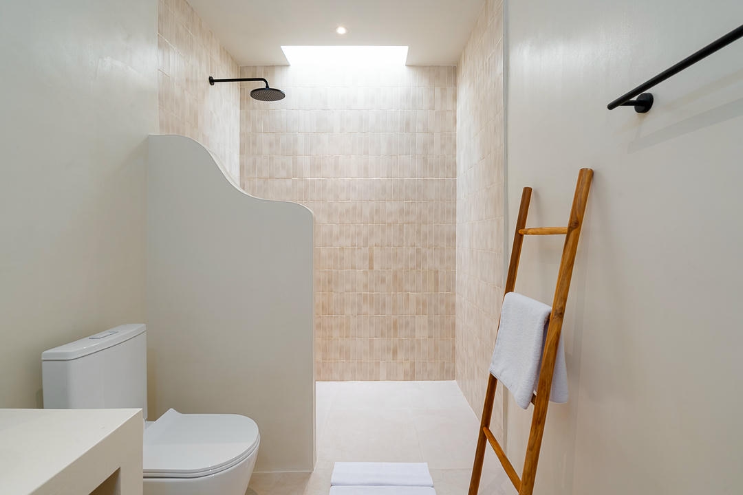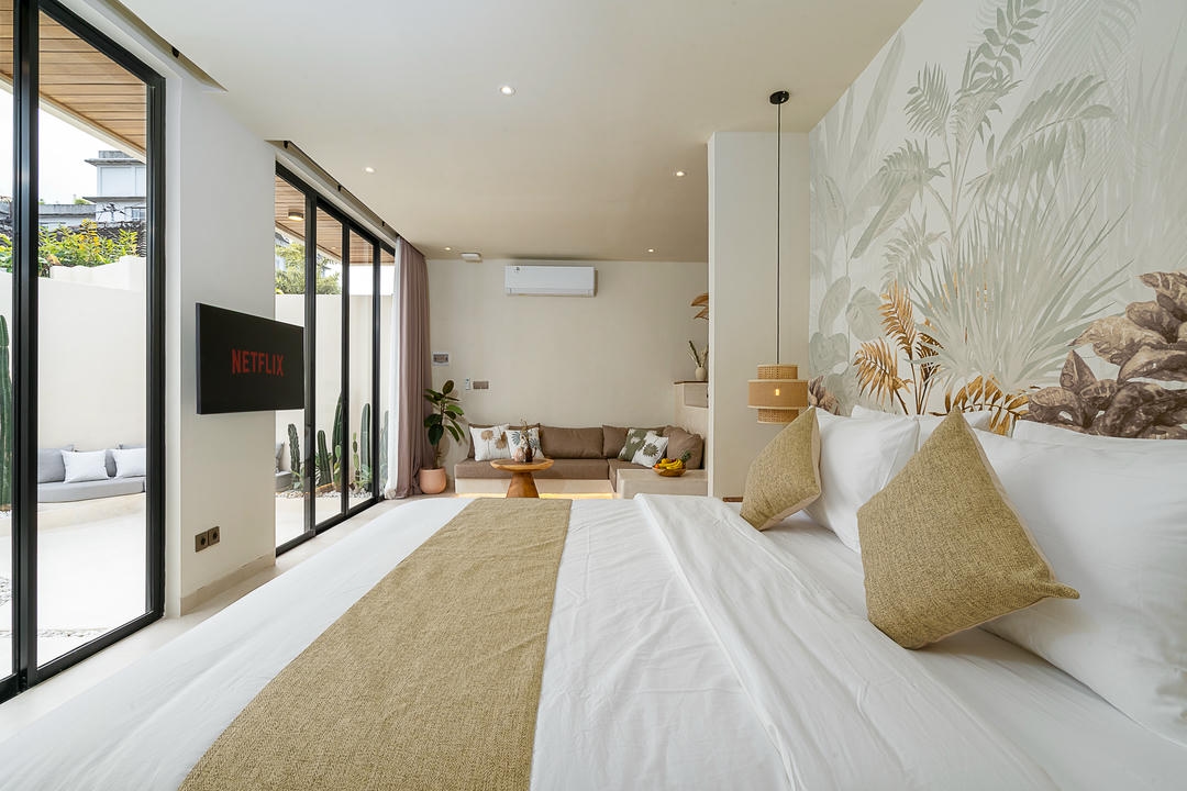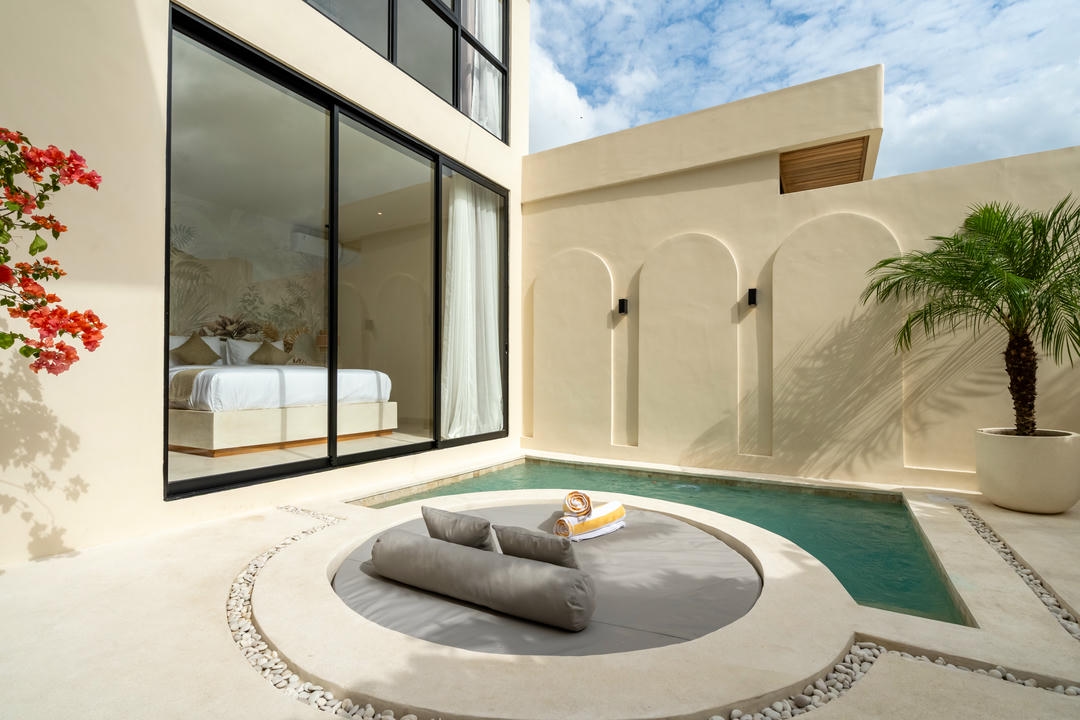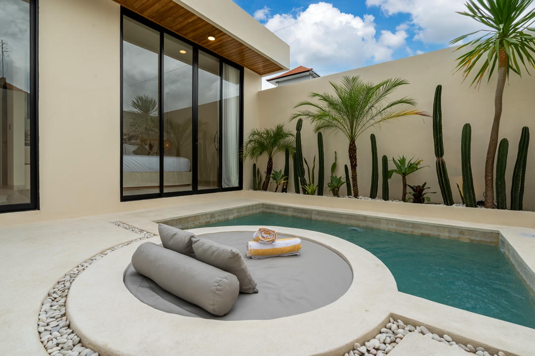 À l’extérieur, chaque villa dispose de sa propre piscine privée, avec un espace lounge et une douche extérieure, parfaits pour profiter pleinement du style de vie balinais.