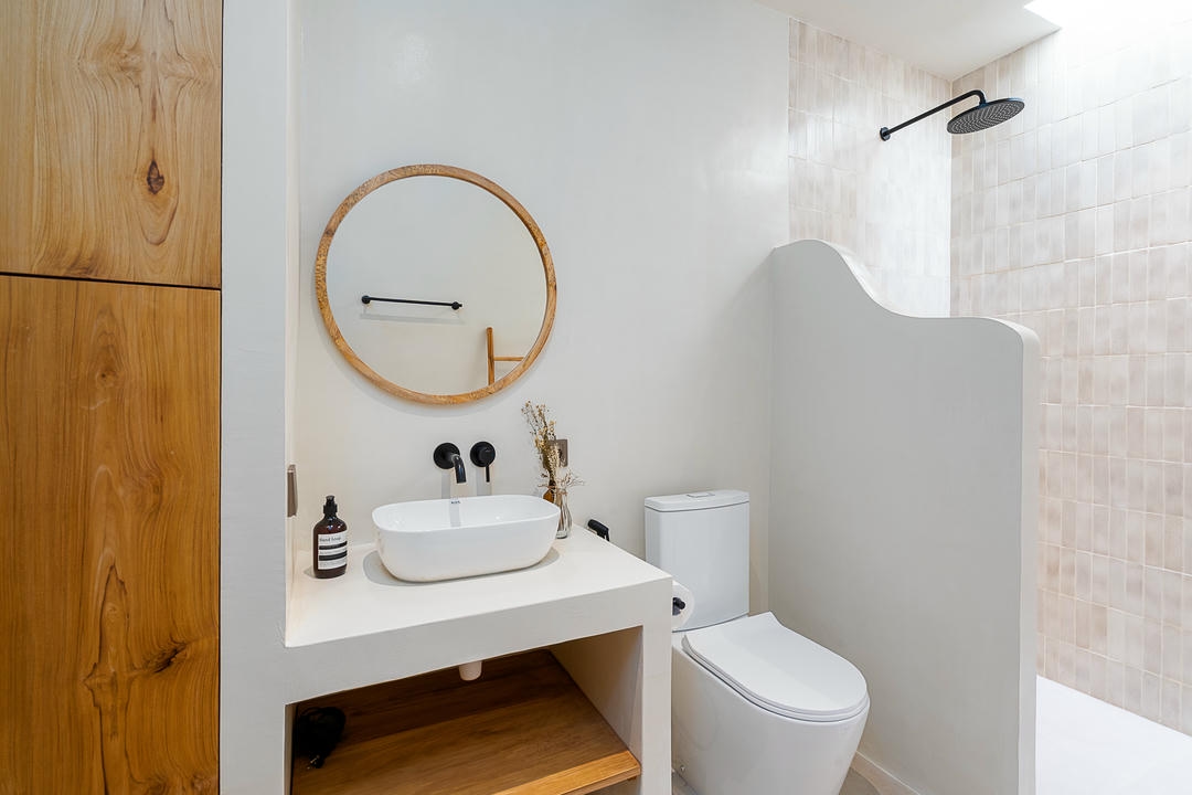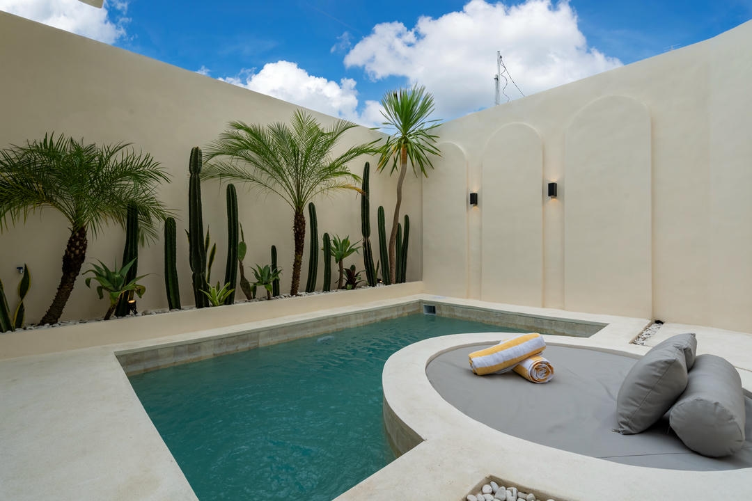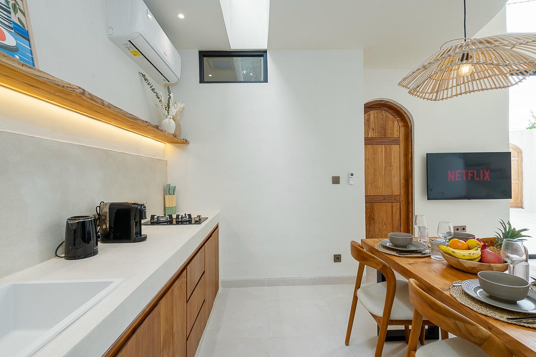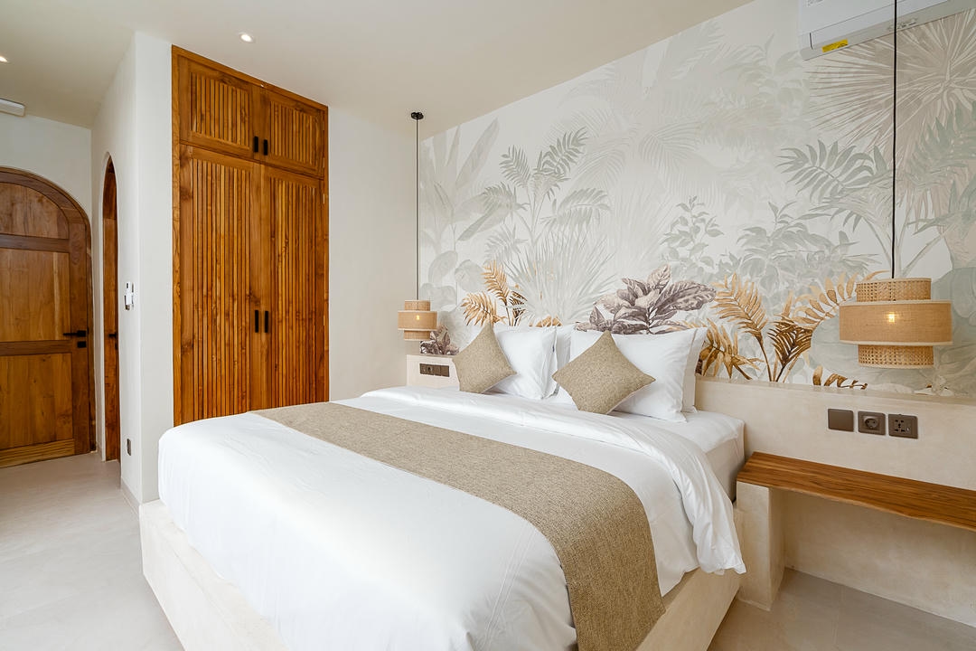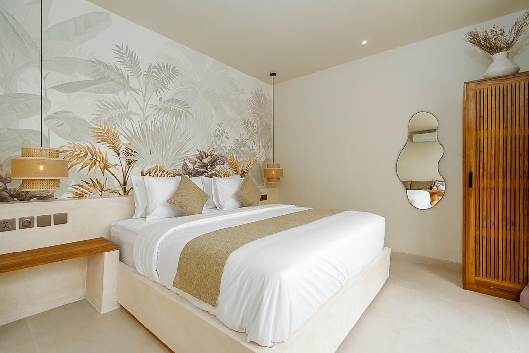 À l’extérieur, chaque villa dispose de sa propre piscine privée, avec un espace lounge et une douche extérieure, parfaits pour profiter pleinement du style de vie balinais.