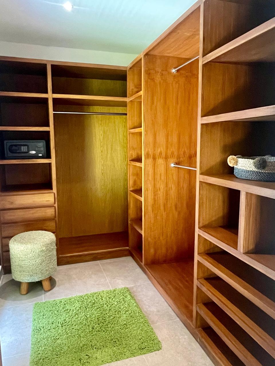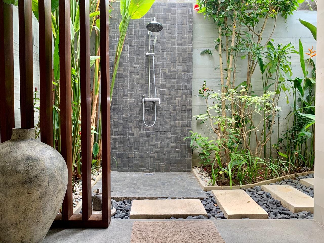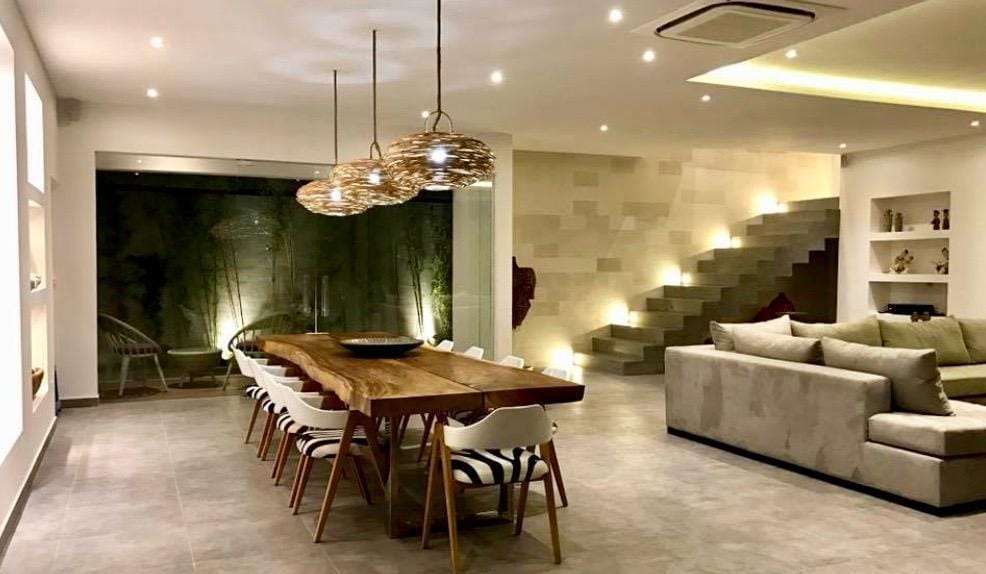 L’espace extérieur dispose d’une spacieuse piscine entourée d’une végétation tropicale luxuriante et d’un élégant revêtement en pierre, créant une atmosphère calme et intime. Des espaces de détente soigneusement aménagés complètent l’ensemble, offrant un cadre idéal pour se relaxer et profiter de l’environnement tropical.