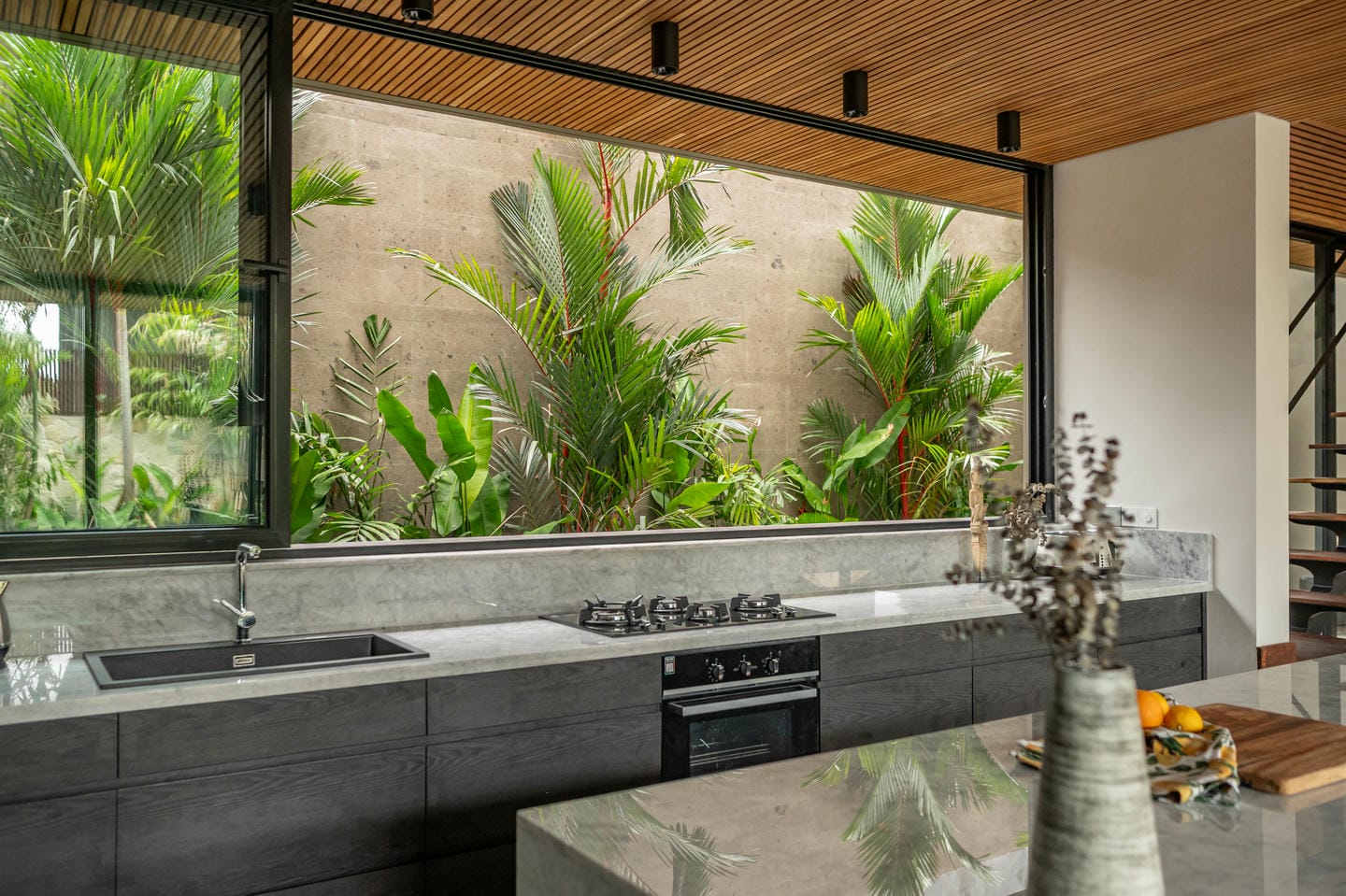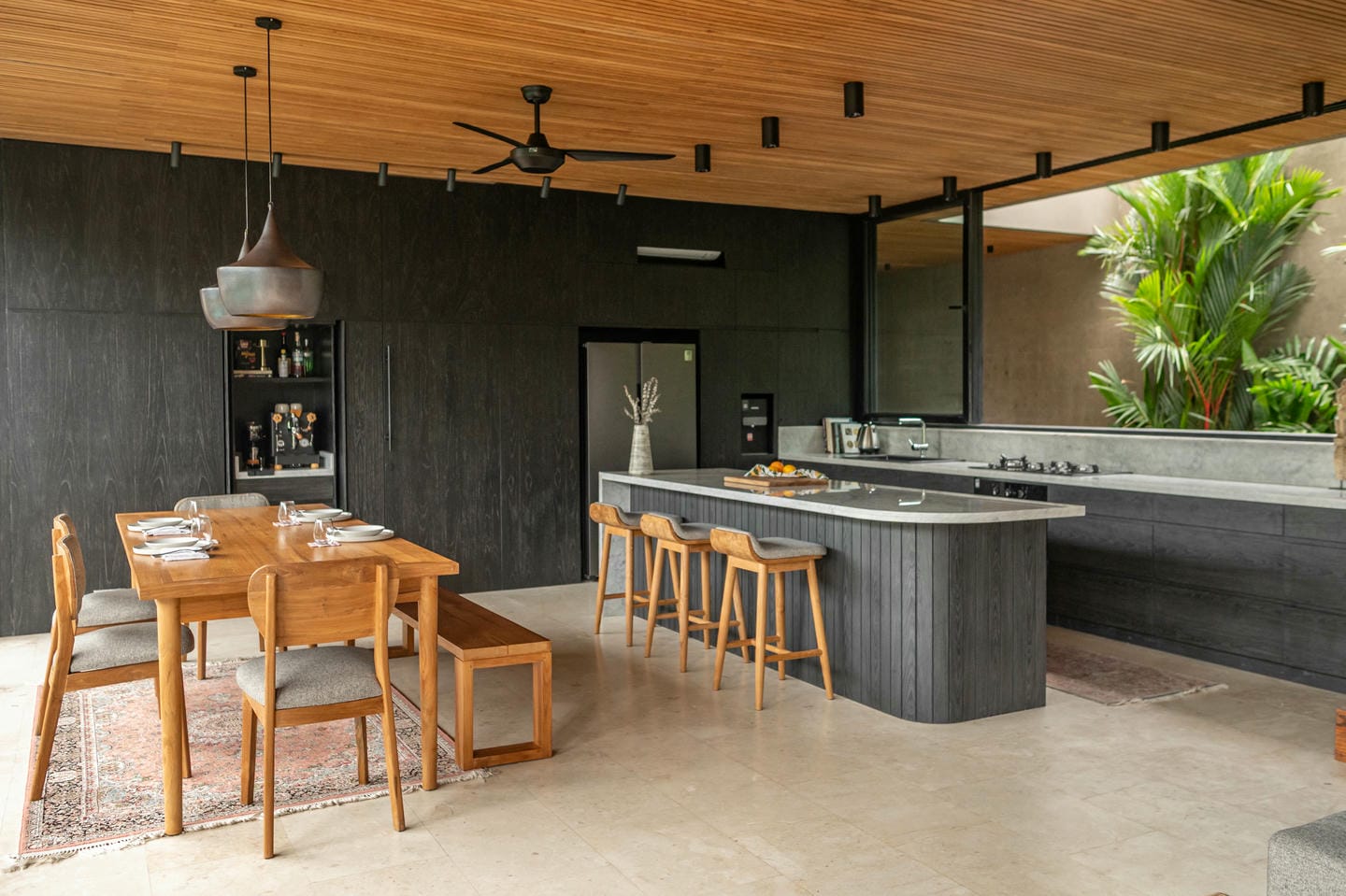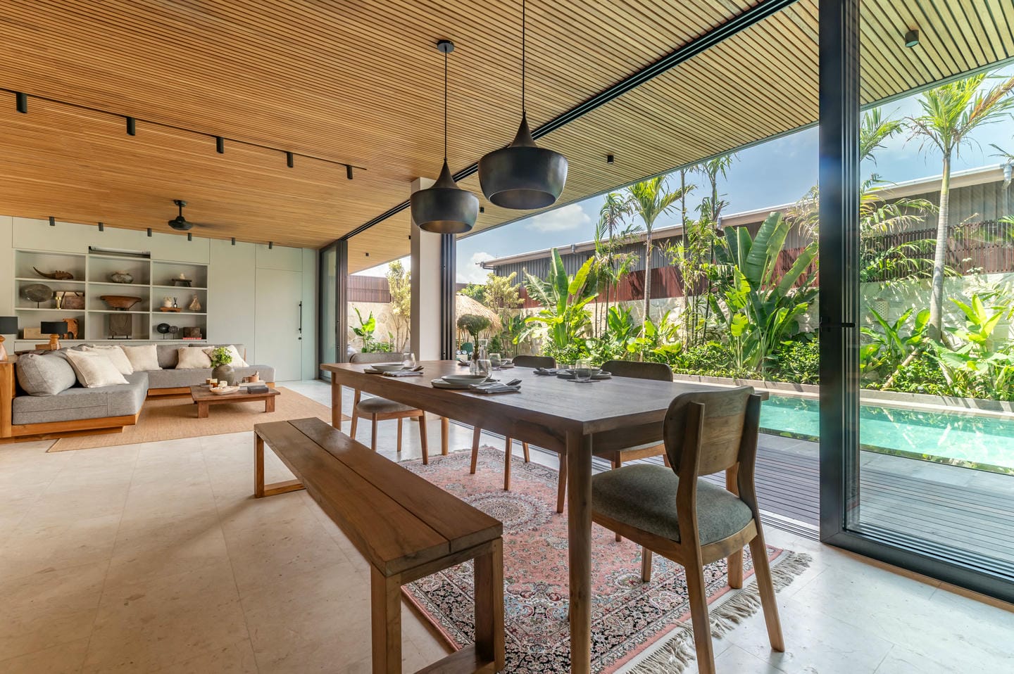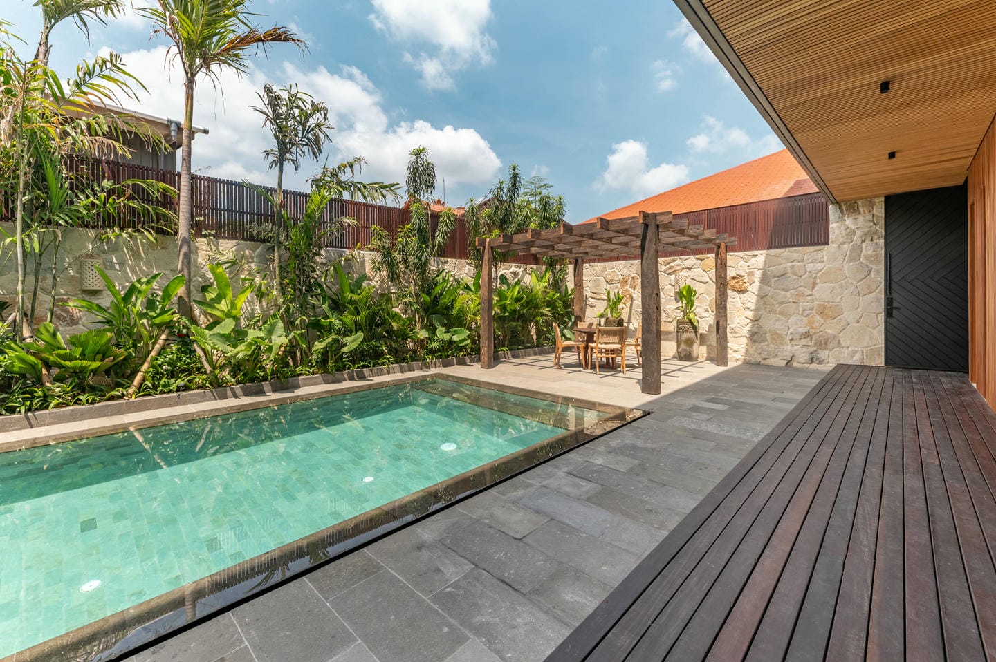 À l’extérieur, vous trouverez une piscine privée avec une table à manger extérieure, une terrasse en bois et des chaises longues entourées de plantes tropicales luxuriantes – un espace idéal pour se détendre, se relaxer et profiter du soleil.