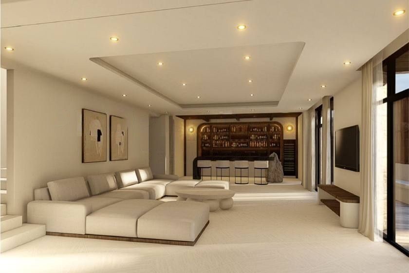 À l’arrière du premier étage de la villa se trouvent 2 chambres, une cuisine fermée et une salle à manger. Le deuxième étage comprend un bar, une table de billard, un sauna et un grand salon central. Le troisième étage est entièrement dédié à la suite parentale, avec dressing, une grande salle de bains dotée d’une baignoire encastrée, ainsi que son propre espace média et lounge. Cette villa possède également un accès indépendant à l’arrière, avec un vaste parking pour les motos.