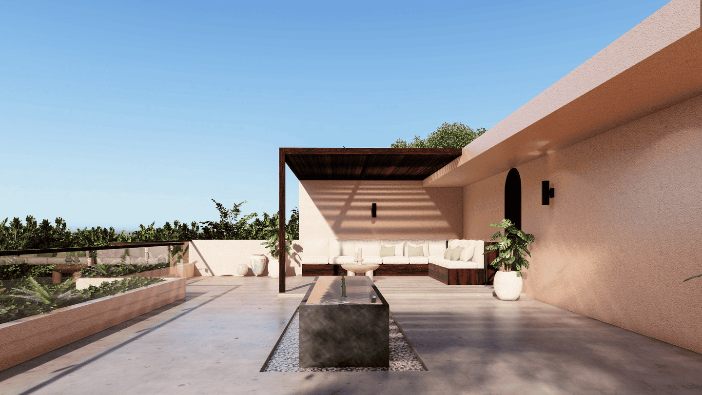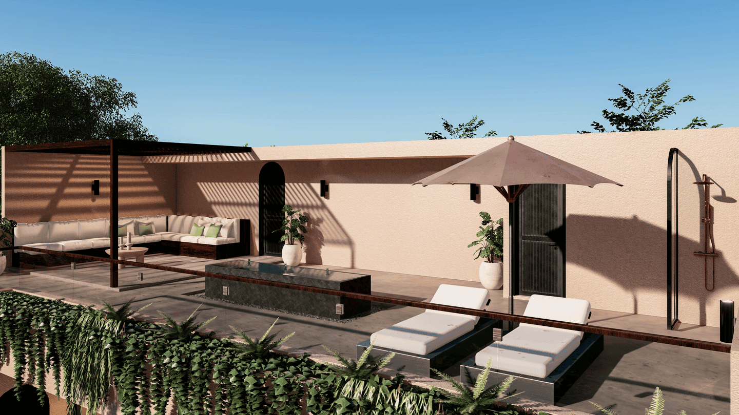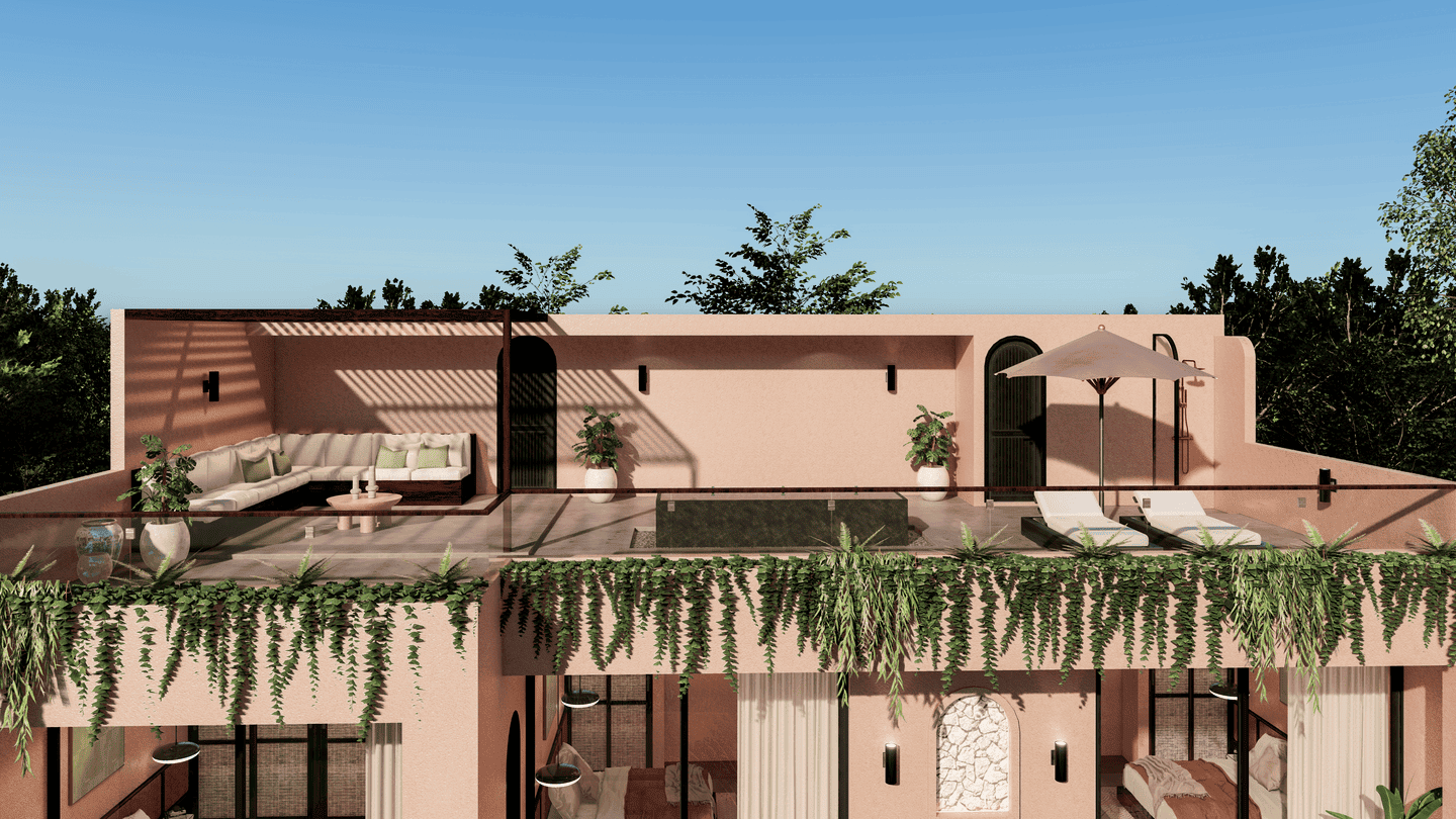 À l’étage, trois chambres disposent chacune de leur propre salle de bain, offrant confort et intimité. Le rooftop, situé au dernier étage, est un véritable havre de paix équipé d’une baignoire, de transats, de pergolas, d’une douche extérieure et d’un coin salon, idéal pour admirer le coucher du soleil ou organiser des moments conviviaux entre amis.