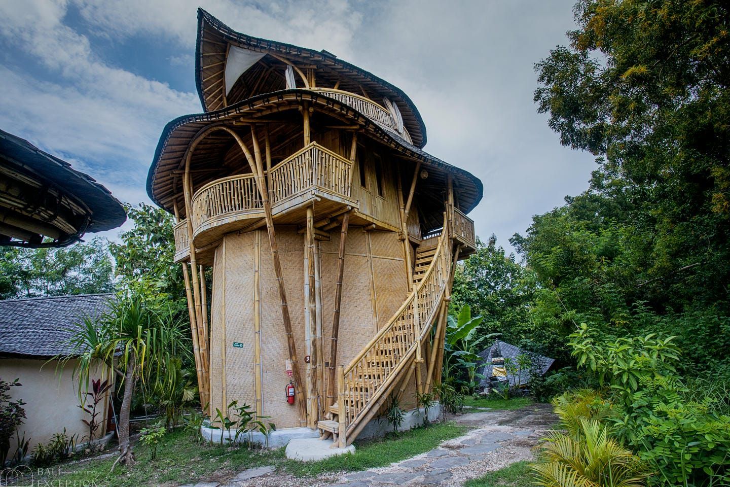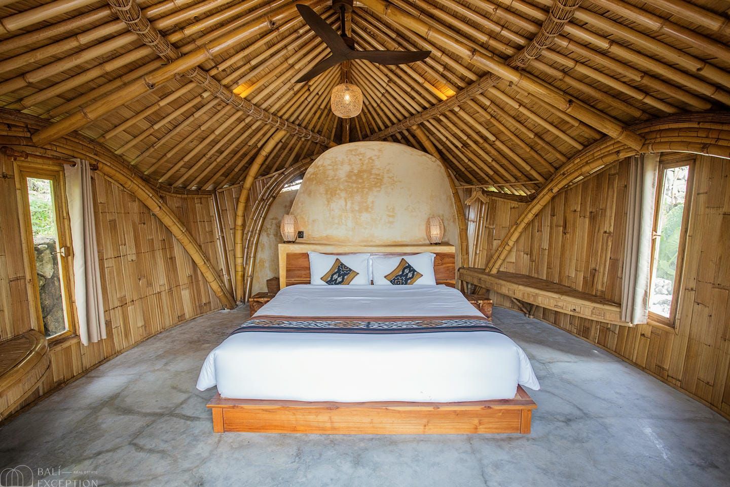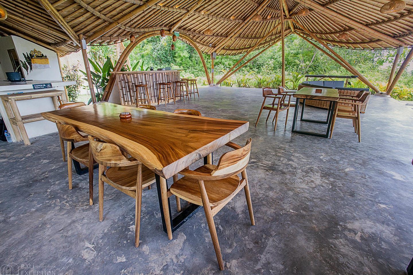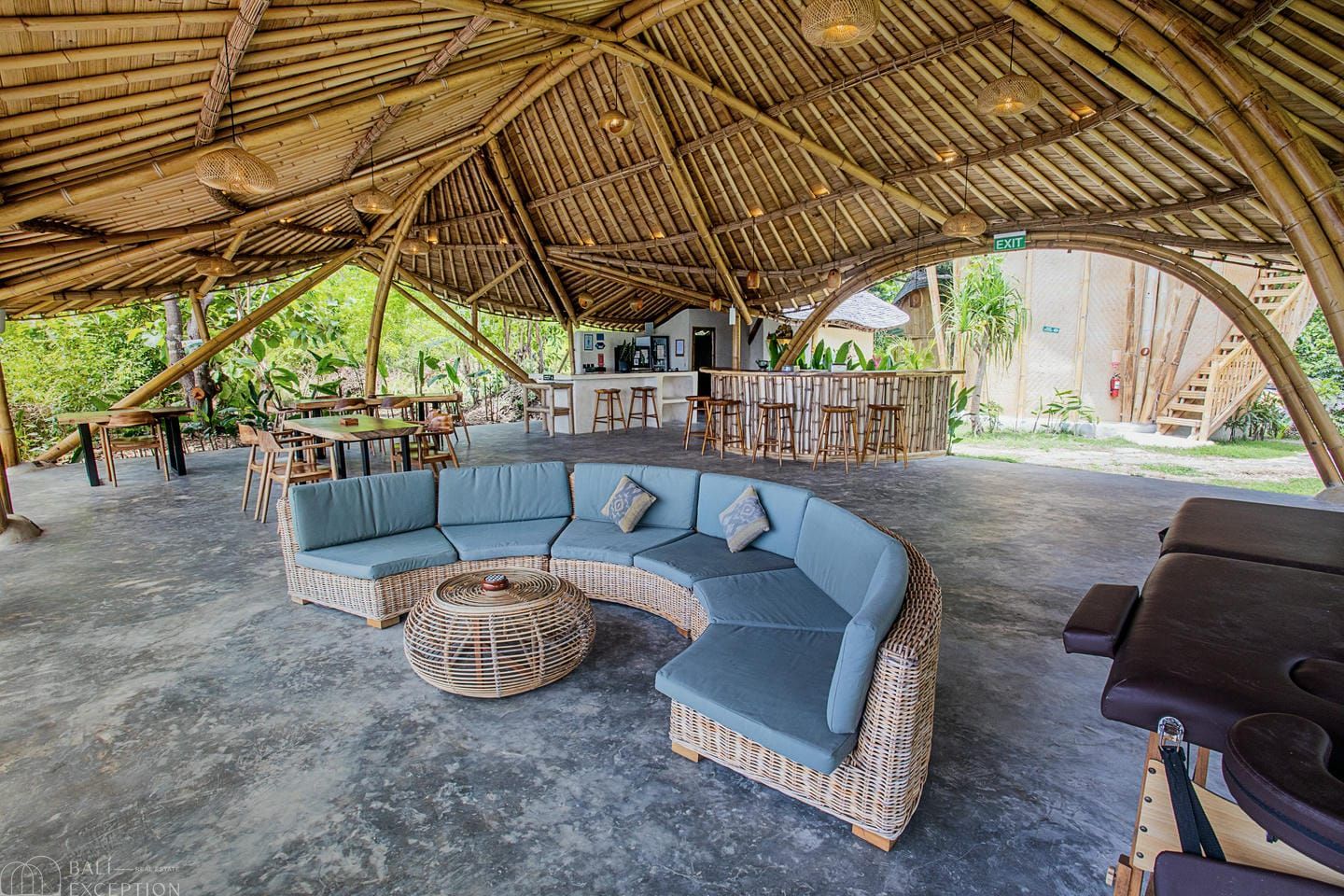 L’architecture est entièrement réalisée en bambou, avec de hauts plafonds voûtés, des formes organiques et des lignes structurelles fluides qui favorisent la circulation de l’air et de la lumière naturelle. Le design crée une atmosphère unique, à la fois immersive et fonctionnelle, alliant confort et forte identité architecturale.