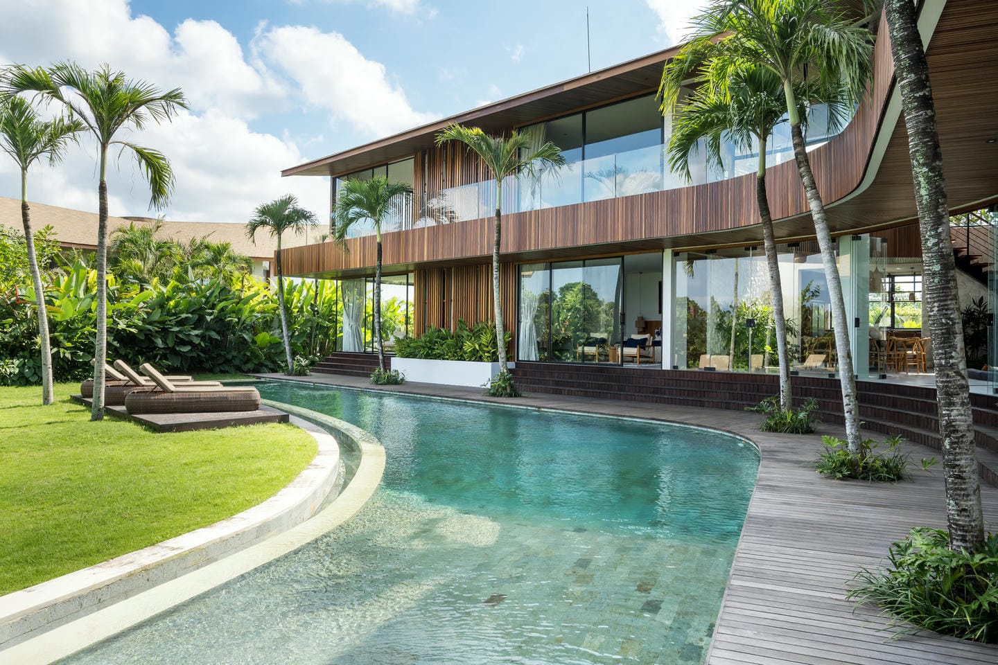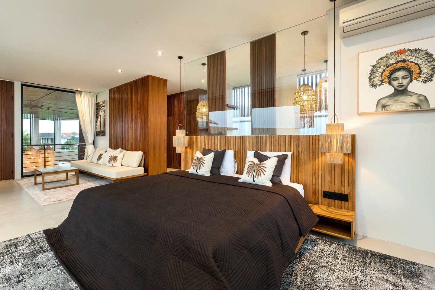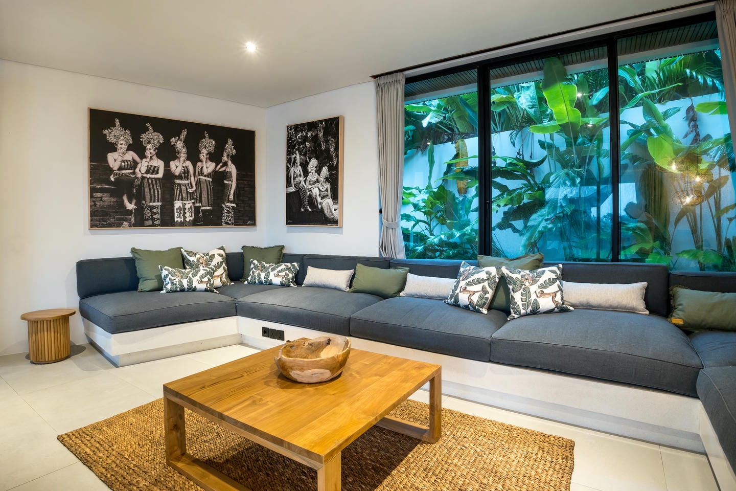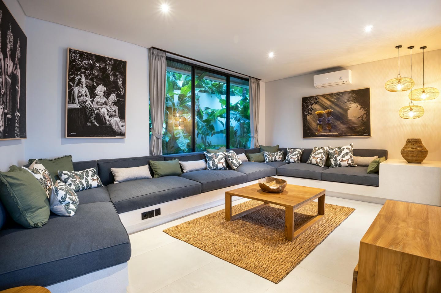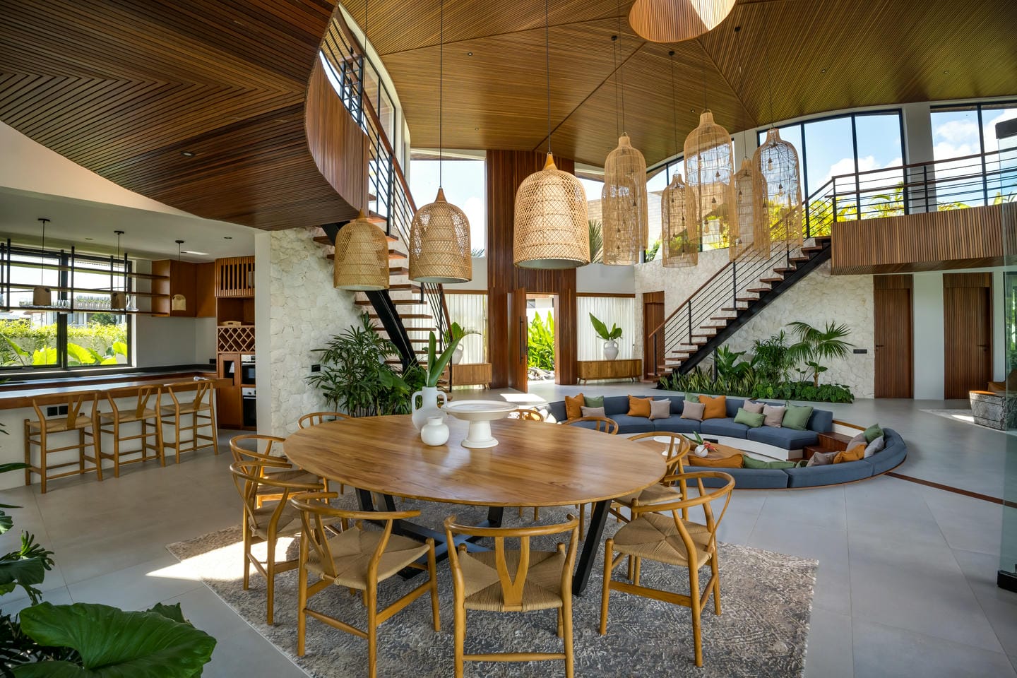 Les hauts plafonds, les luminaires suspendus design et les sélections de matériaux raffinés créent une atmosphère à la fois grandiose et accueillante. Les espaces de vie intérieurs et extérieurs se déroulent sans effort, embrassant le style de vie tropical de Bali.