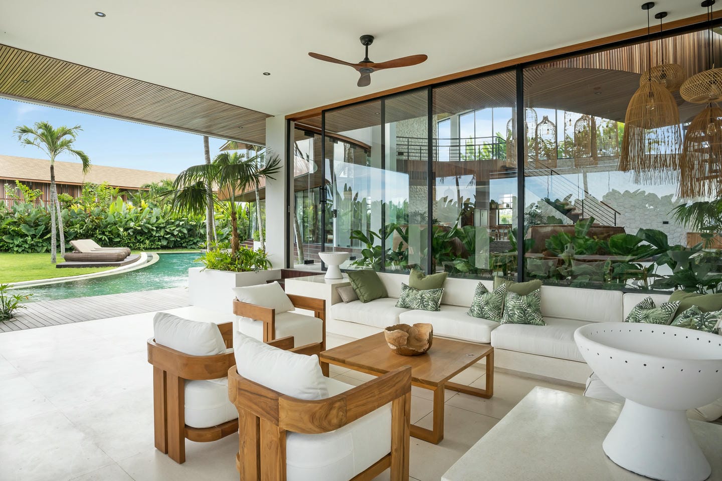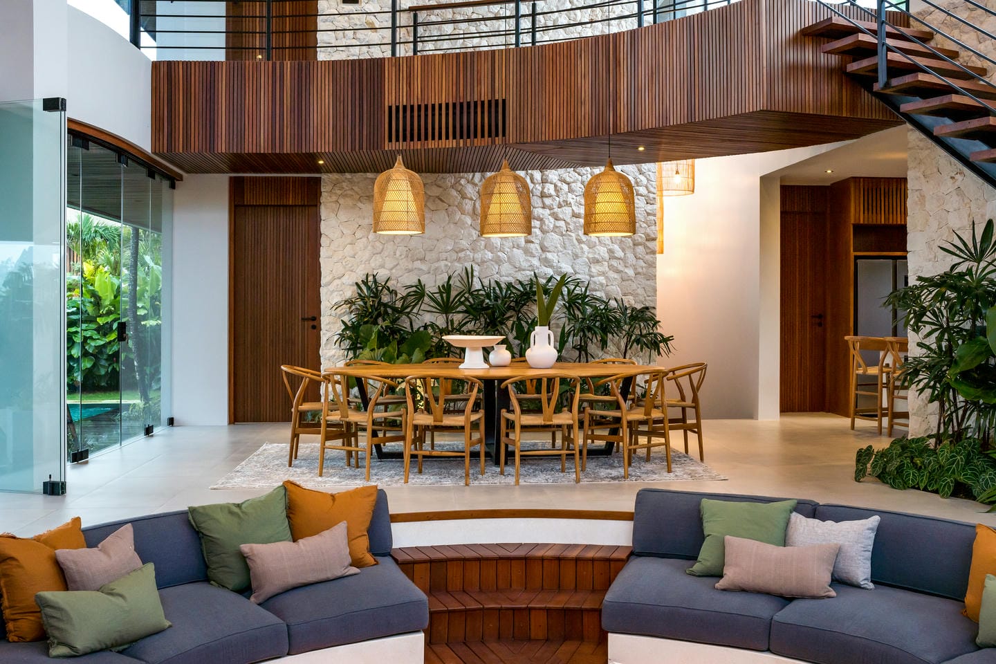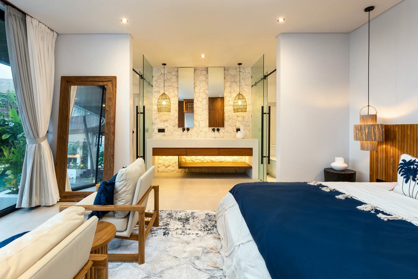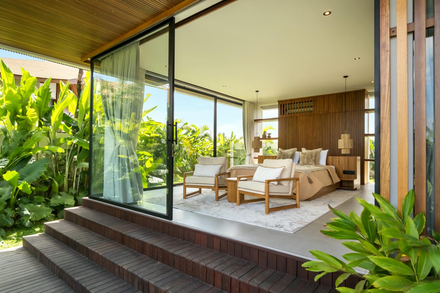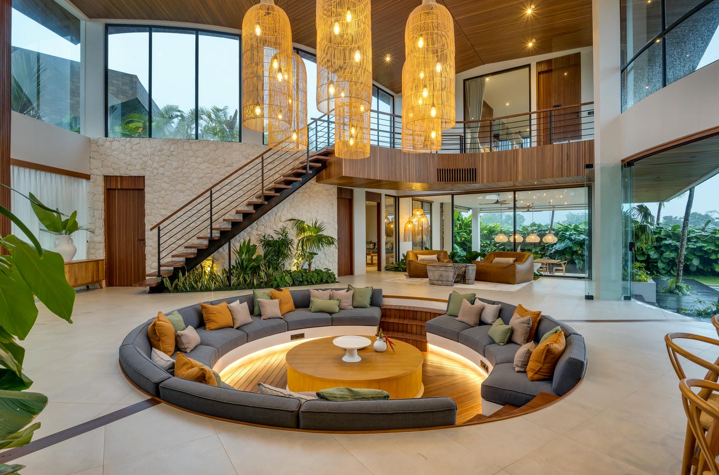 Conçue avec une esthétique moderne-tropicale raffinée, la villa mélange harmonieusement des bois naturels chaleureux, des textures de pierre élégantes et de grandes baies vitrées du sol au plafond. La lumière naturelle inonde les intérieurs, renforçant la sensation d’espace et de sophistication sans effort.