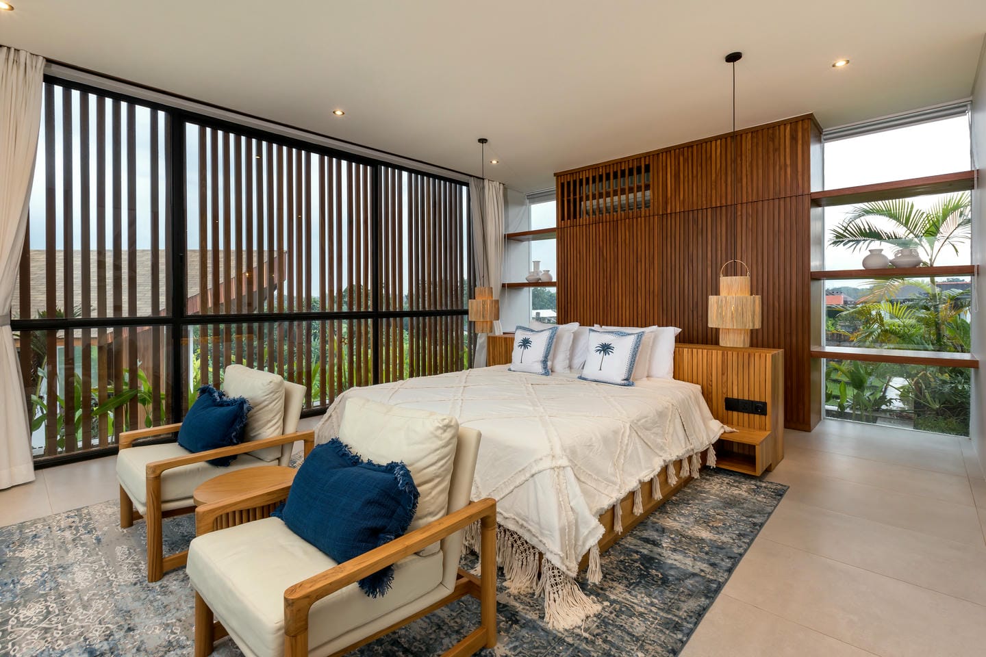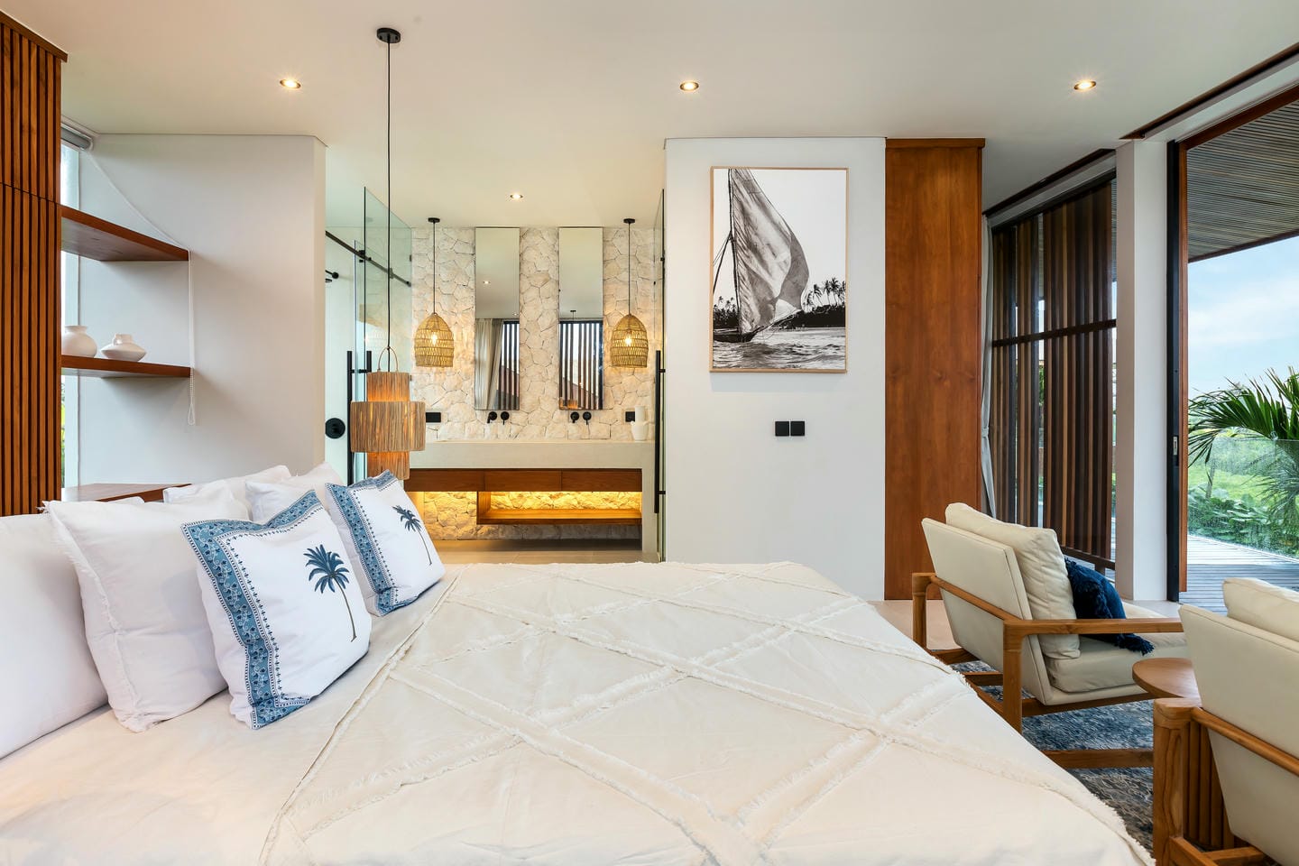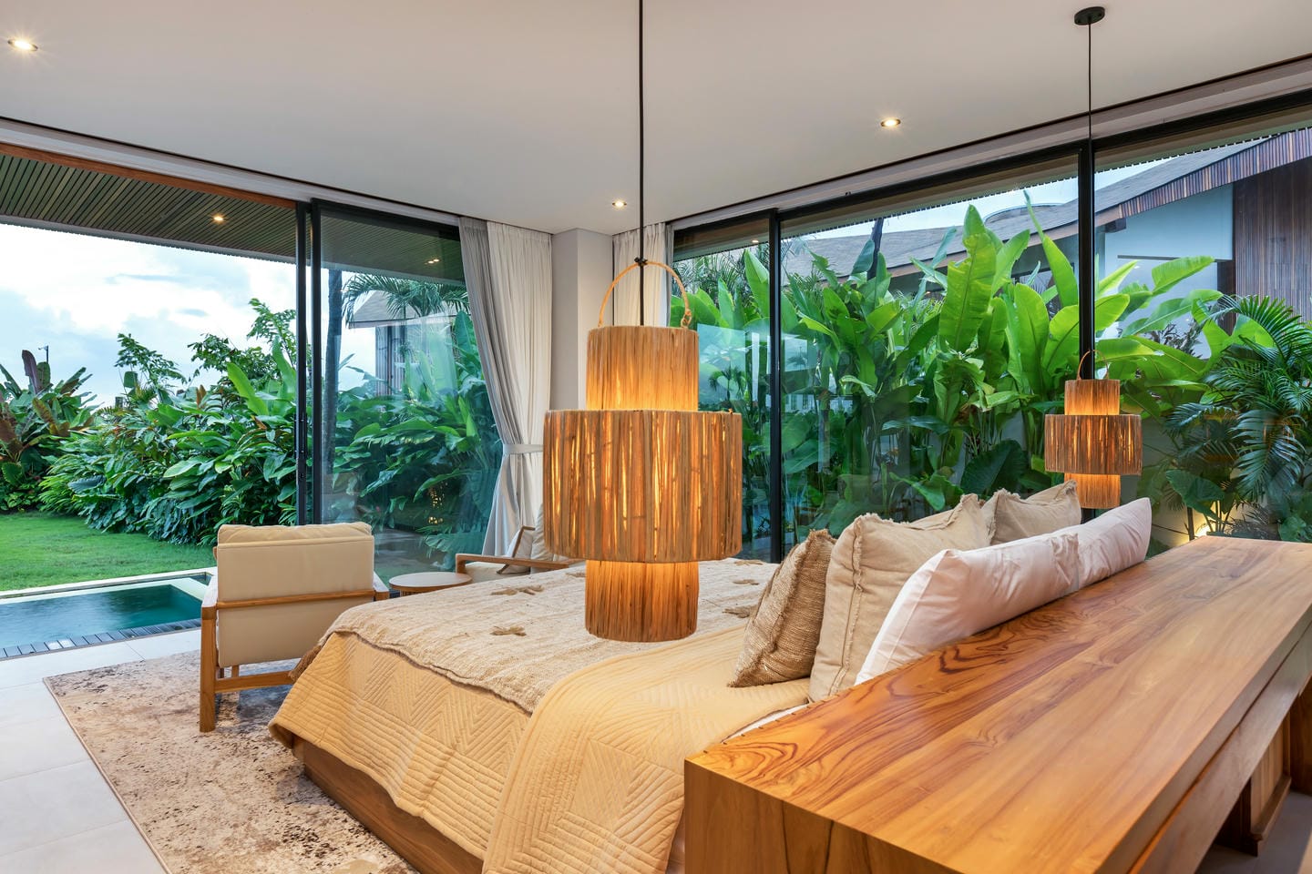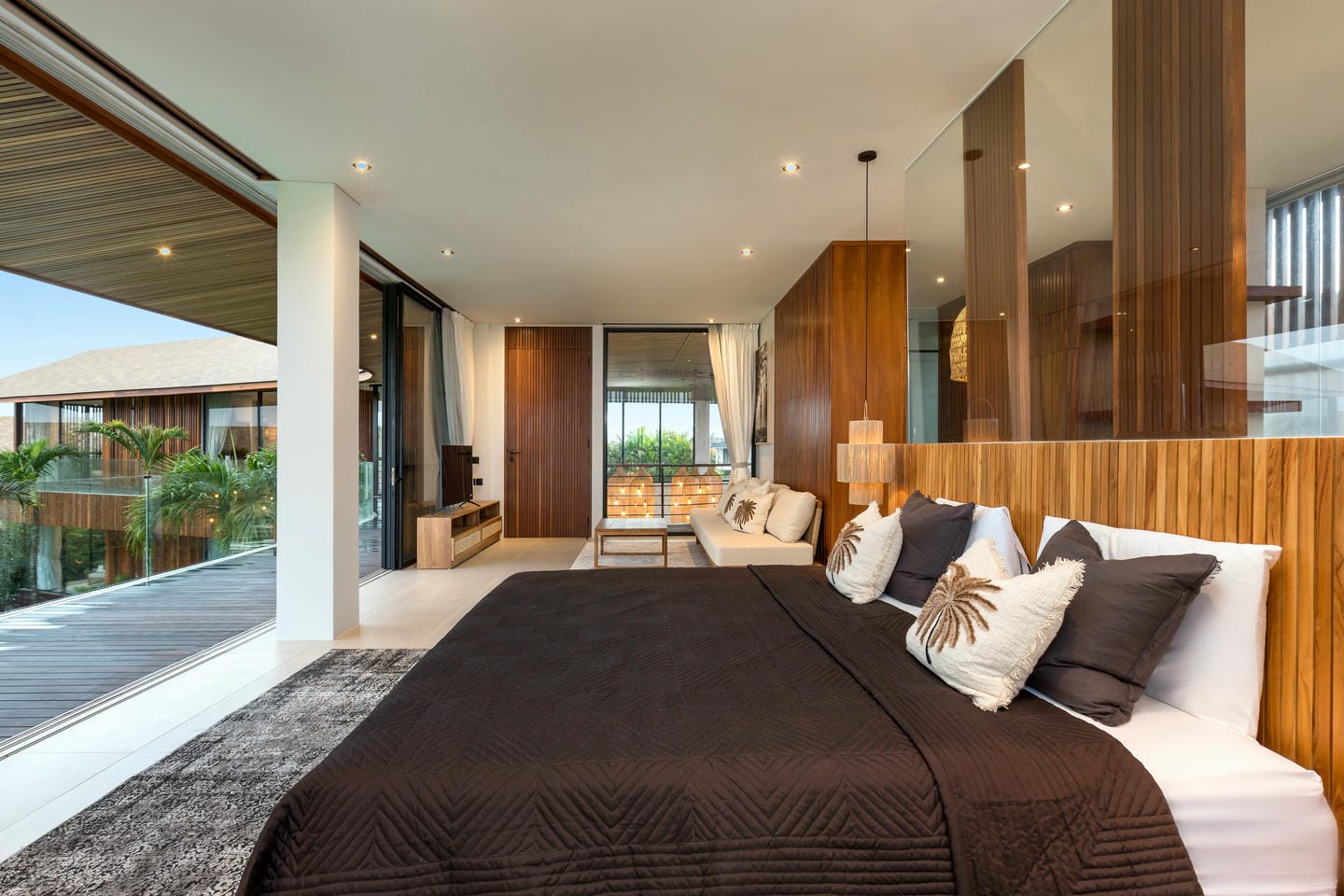 Conçue avec une esthétique moderne-tropicale raffinée, la villa mélange harmonieusement des bois naturels chaleureux, des textures de pierre élégantes et de grandes baies vitrées du sol au plafond. La lumière naturelle inonde les intérieurs, renforçant la sensation d’espace et de sophistication sans effort.