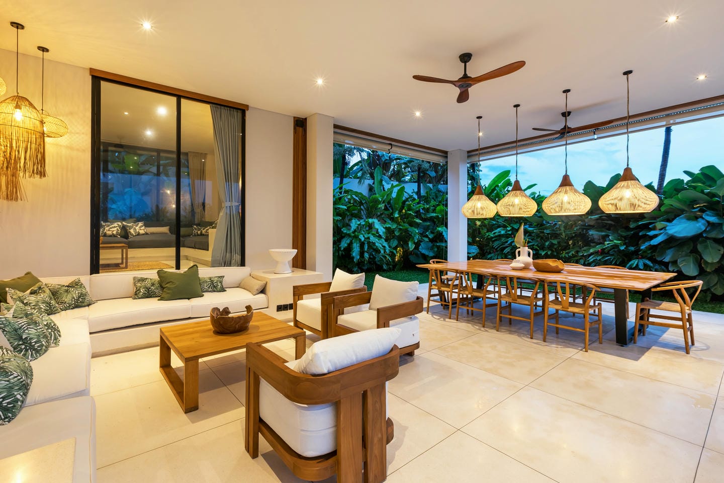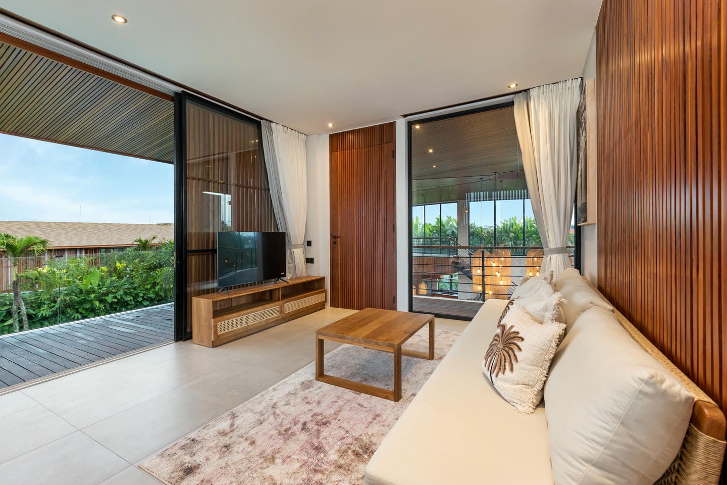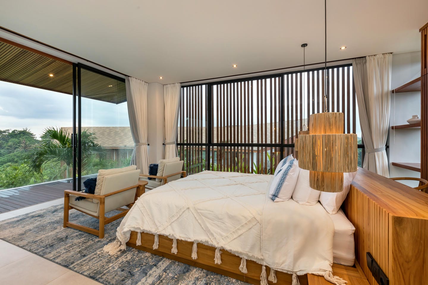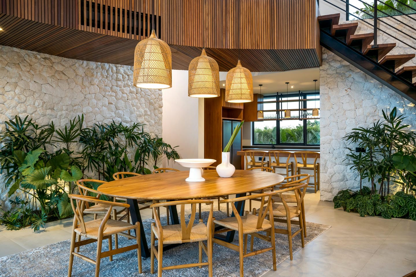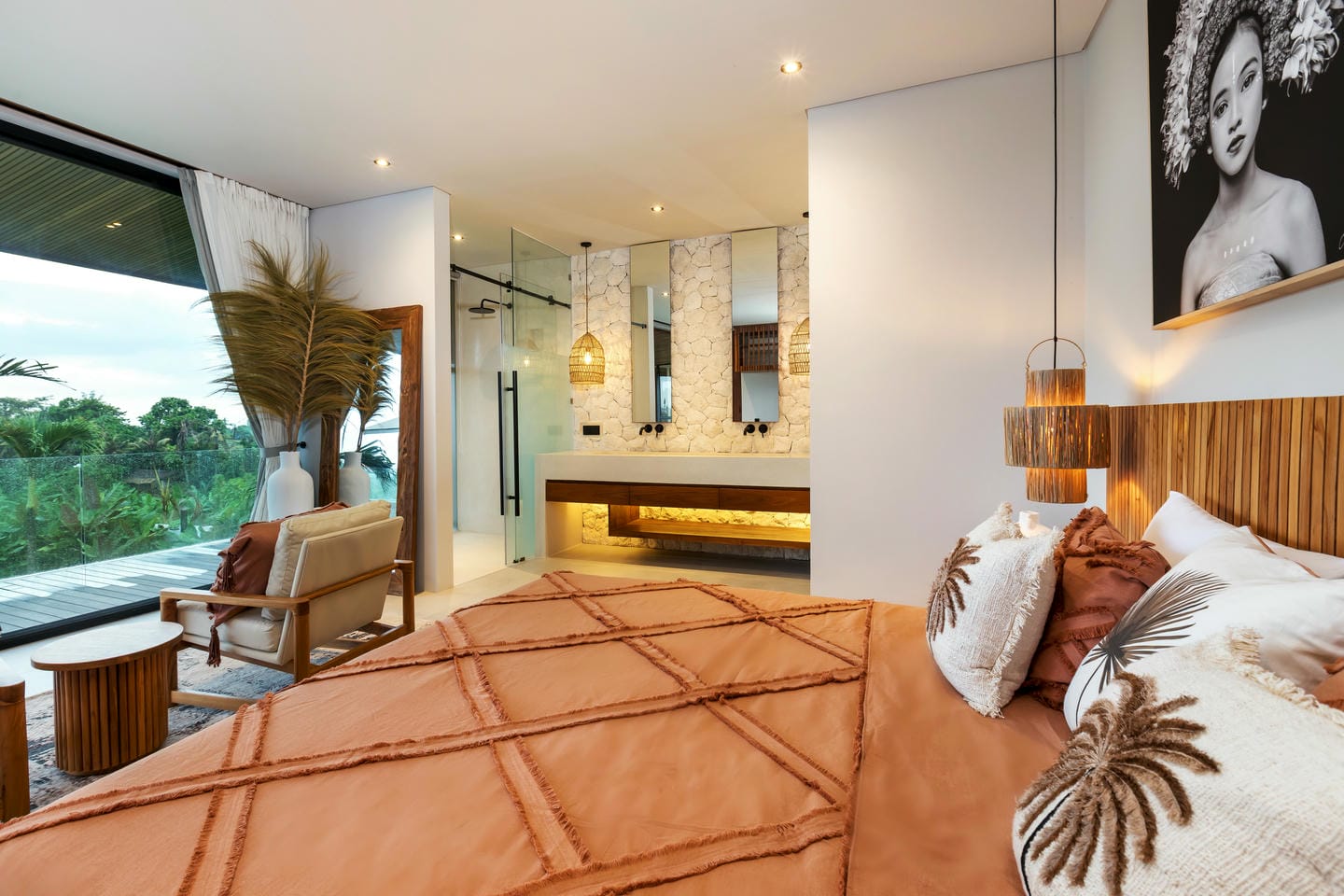Conçue avec une esthétique moderne-tropicale raffinée, la villa mélange harmonieusement des bois naturels chaleureux, des textures de pierre élégantes et de grandes baies vitrées du sol au plafond. La lumière naturelle inonde les intérieurs, renforçant la sensation d’espace et de sophistication sans effort.