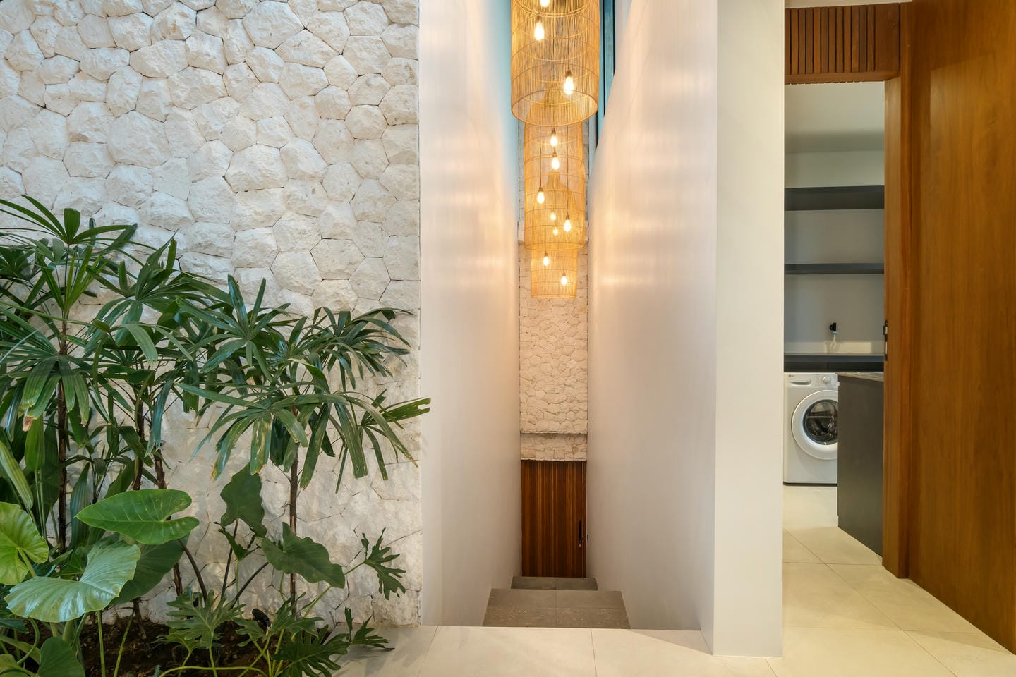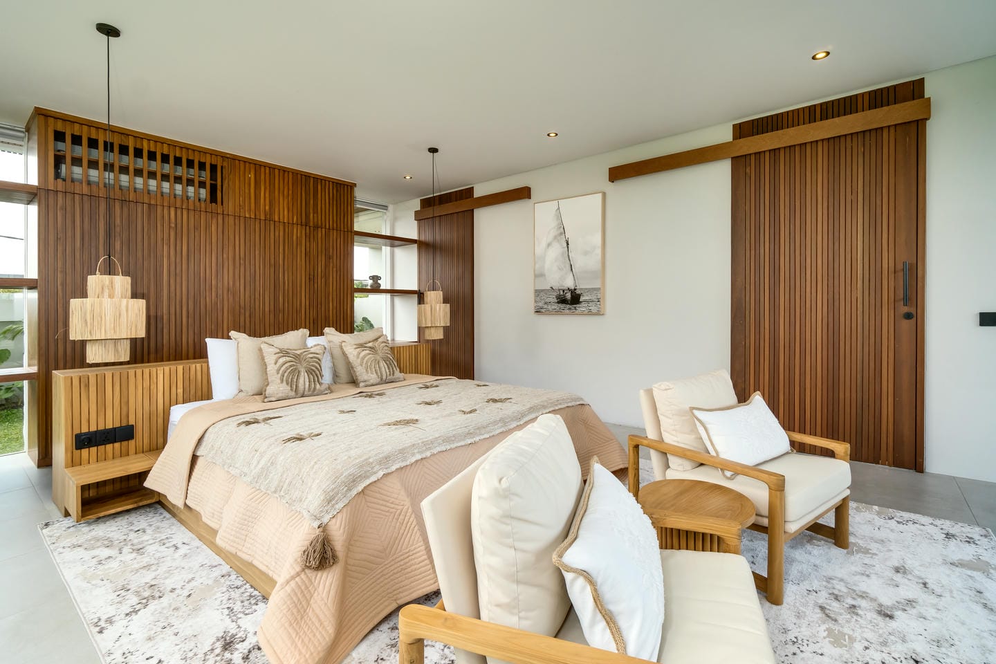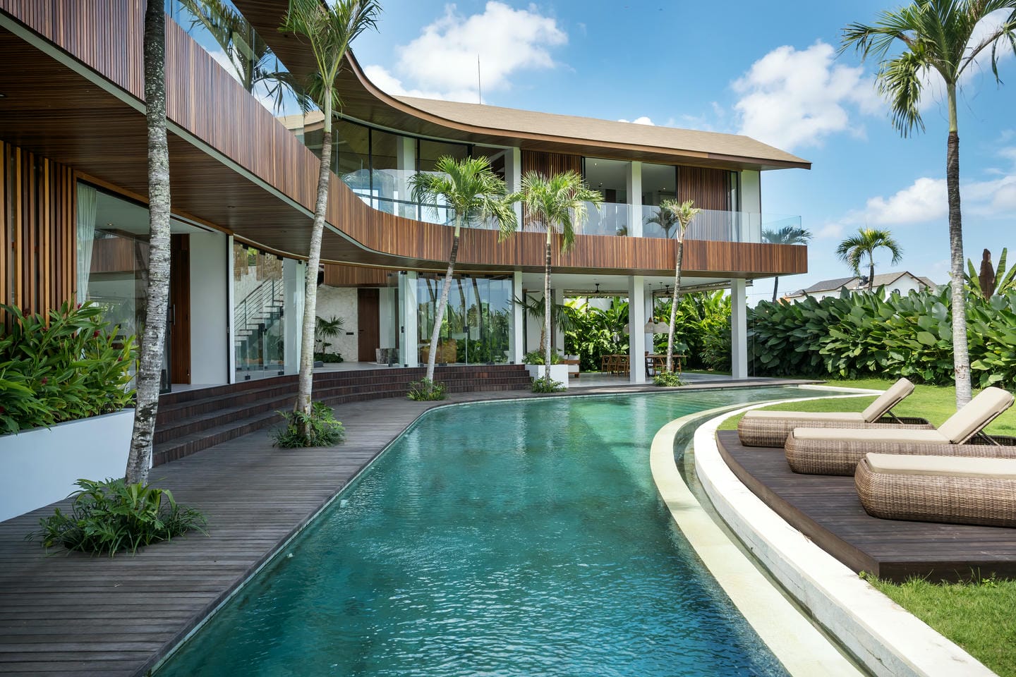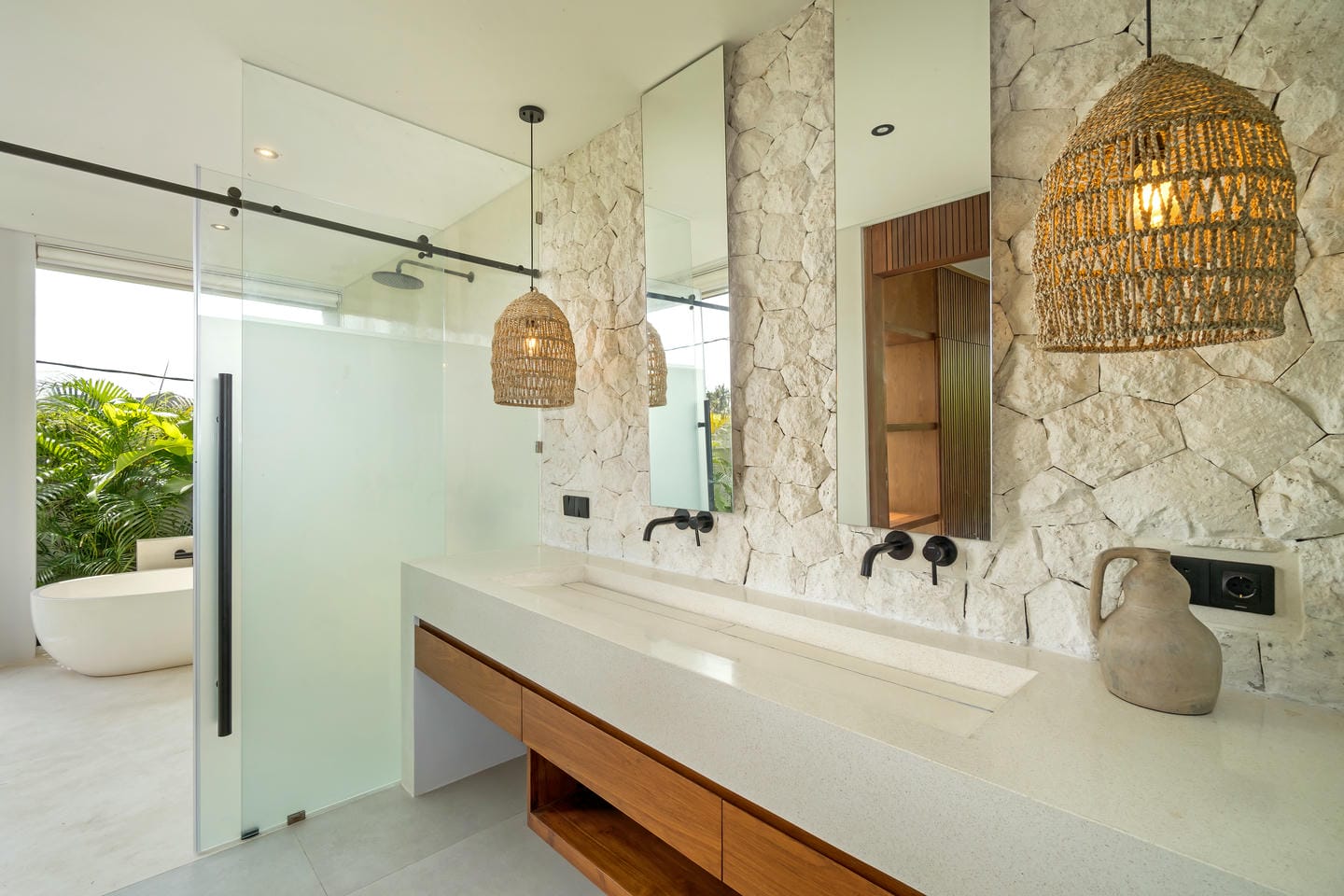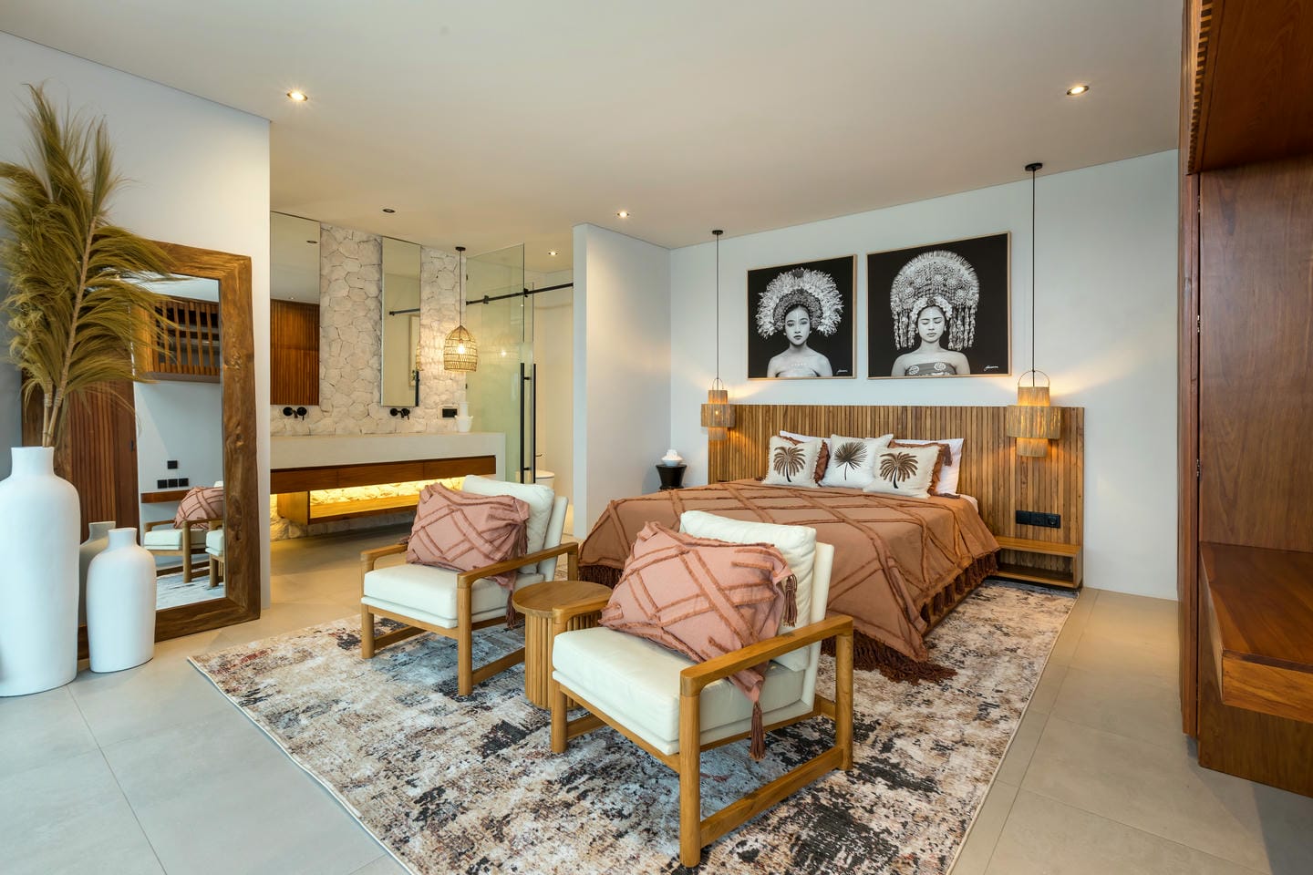 Conçue avec une esthétique moderne-tropicale raffinée, la villa mélange harmonieusement des bois naturels chaleureux, des textures de pierre élégantes et de grandes baies vitrées du sol au plafond. La lumière naturelle inonde les intérieurs, renforçant la sensation d’espace et de sophistication sans effort.