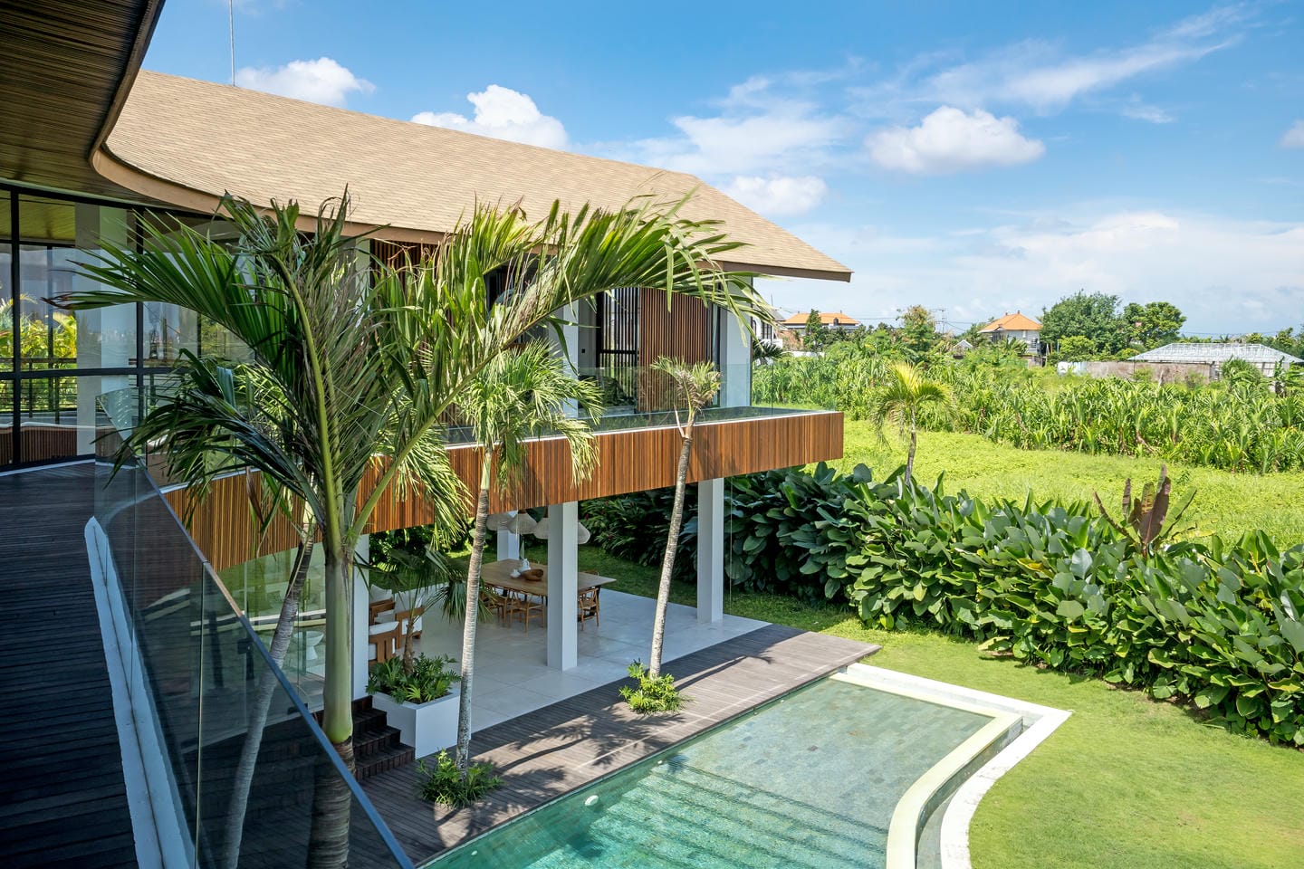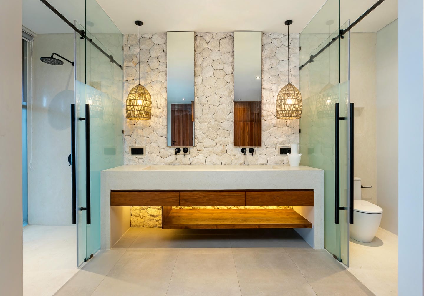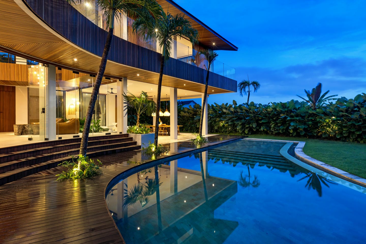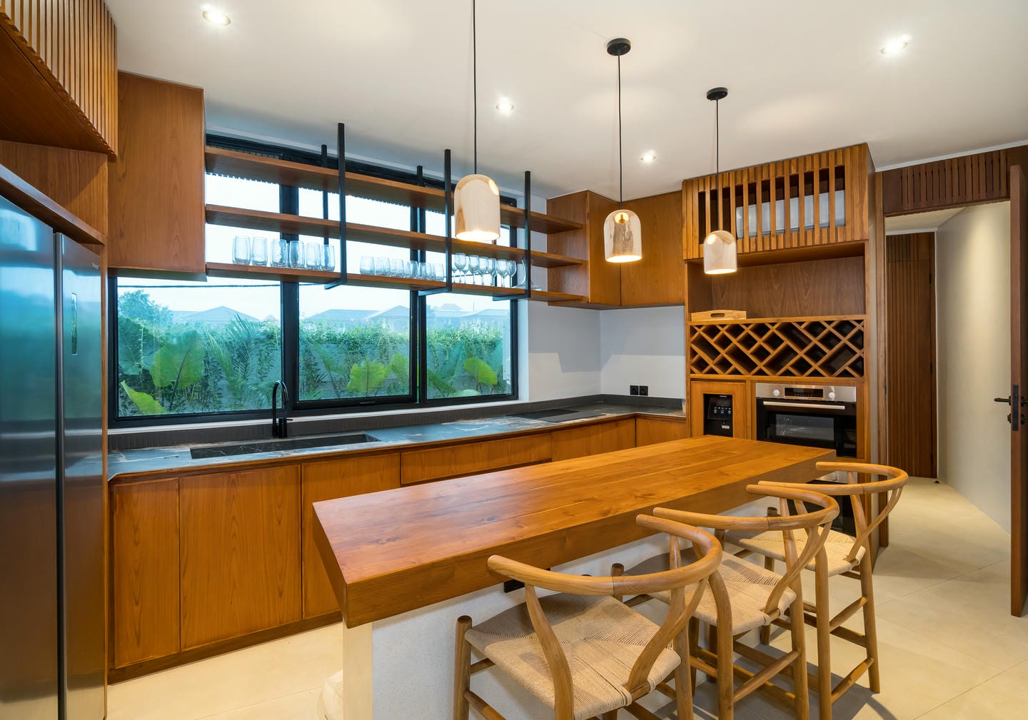 Conçue avec une esthétique moderne-tropicale raffinée, la villa mélange harmonieusement des bois naturels chaleureux, des textures de pierre élégantes et de grandes baies vitrées du sol au plafond. La lumière naturelle inonde les intérieurs, renforçant la sensation d’espace et de sophistication sans effort.