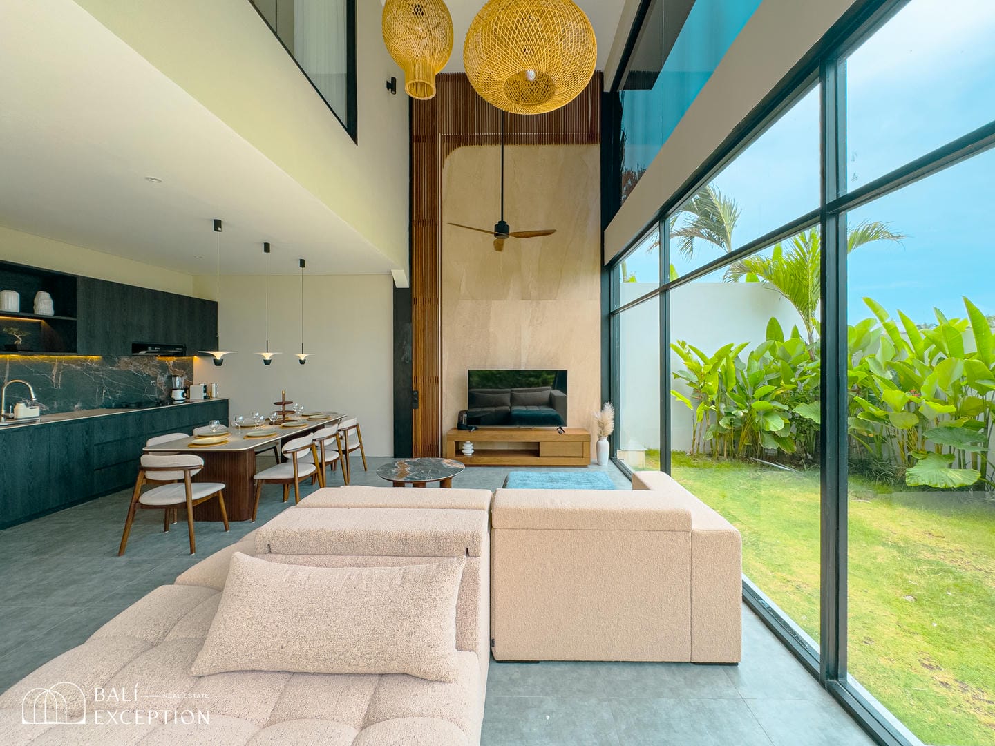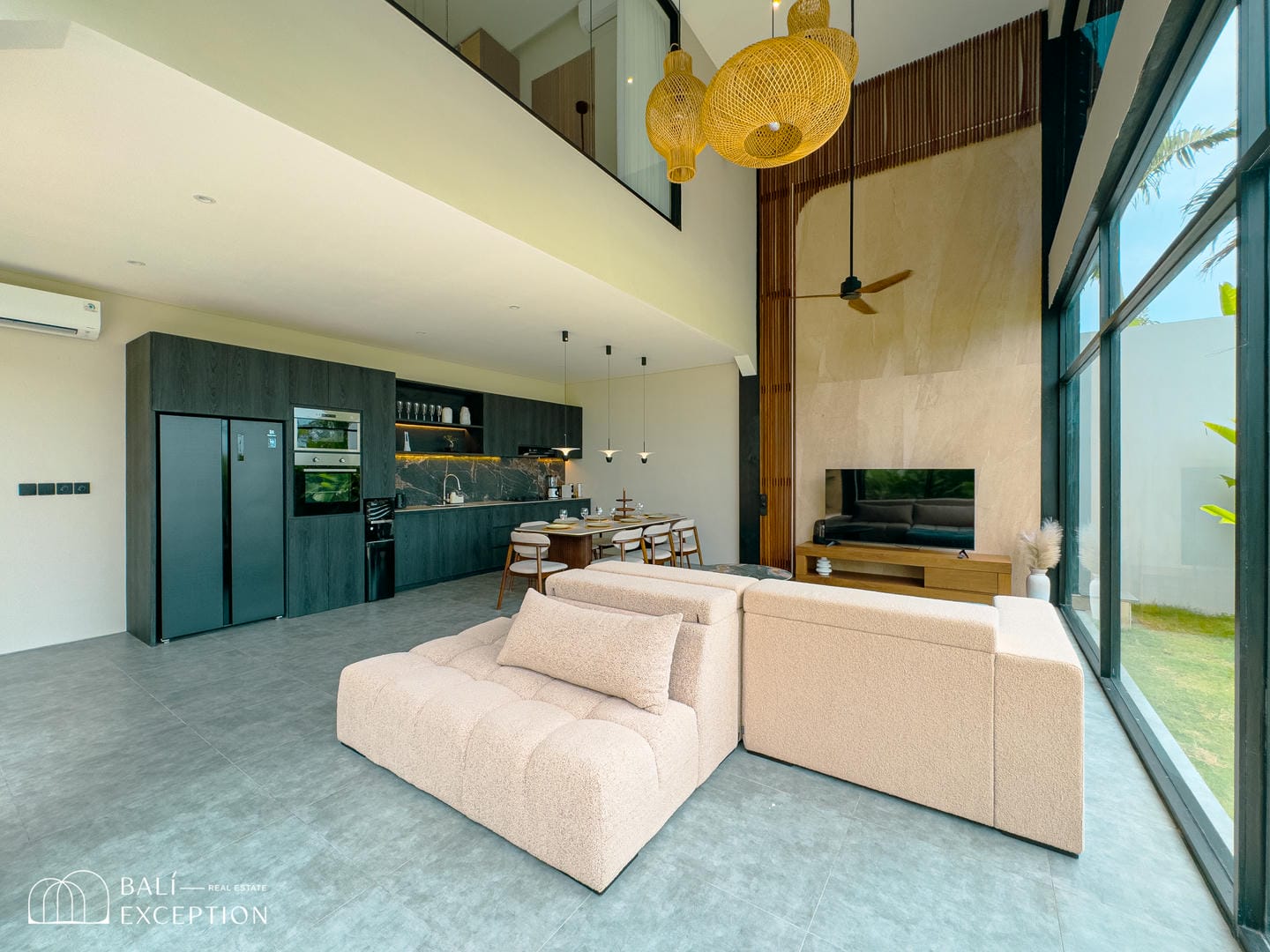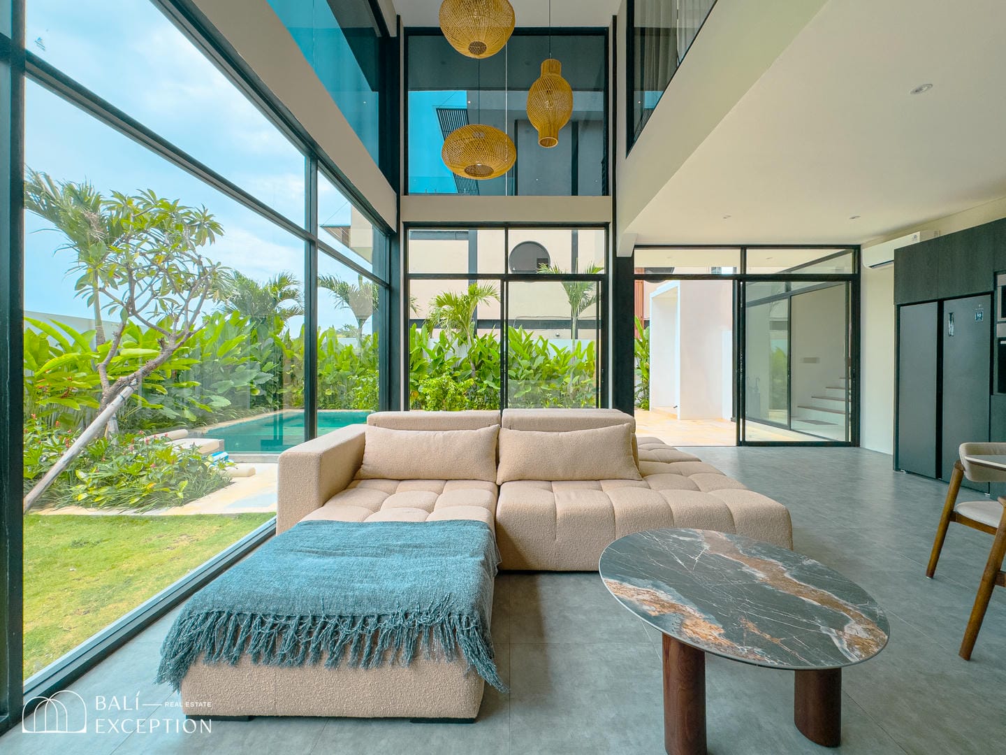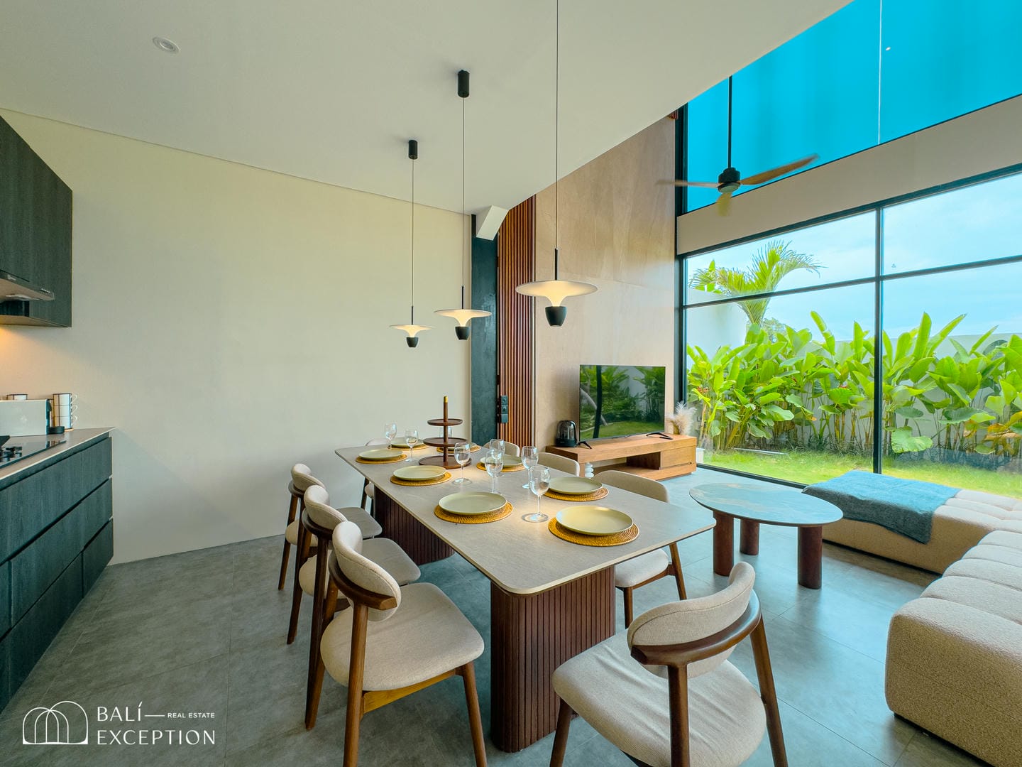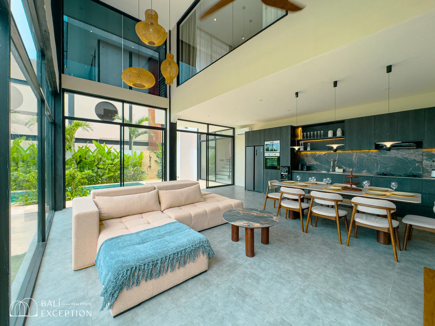 Cette villa entièrement meublée présente un design moderne et élégant sur trois étages spacieux. Conçue avec de grandes baies vitrées et de hauts plafonds, elle est lumineuse et aérée dans toutes les pièces. La cuisine est entièrement équipée et dispose d’une grande table à manger, idéale pour recevoir. Le salon confortable est aménagé avec un canapé et un ventilateur de plafond, offrant une vue relaxante sur l’espace extérieur. La villa comprend quatre chambres, chacune avec son propre balcon et salle de bain attenante, garantissant intimité et confort à tous les invités.