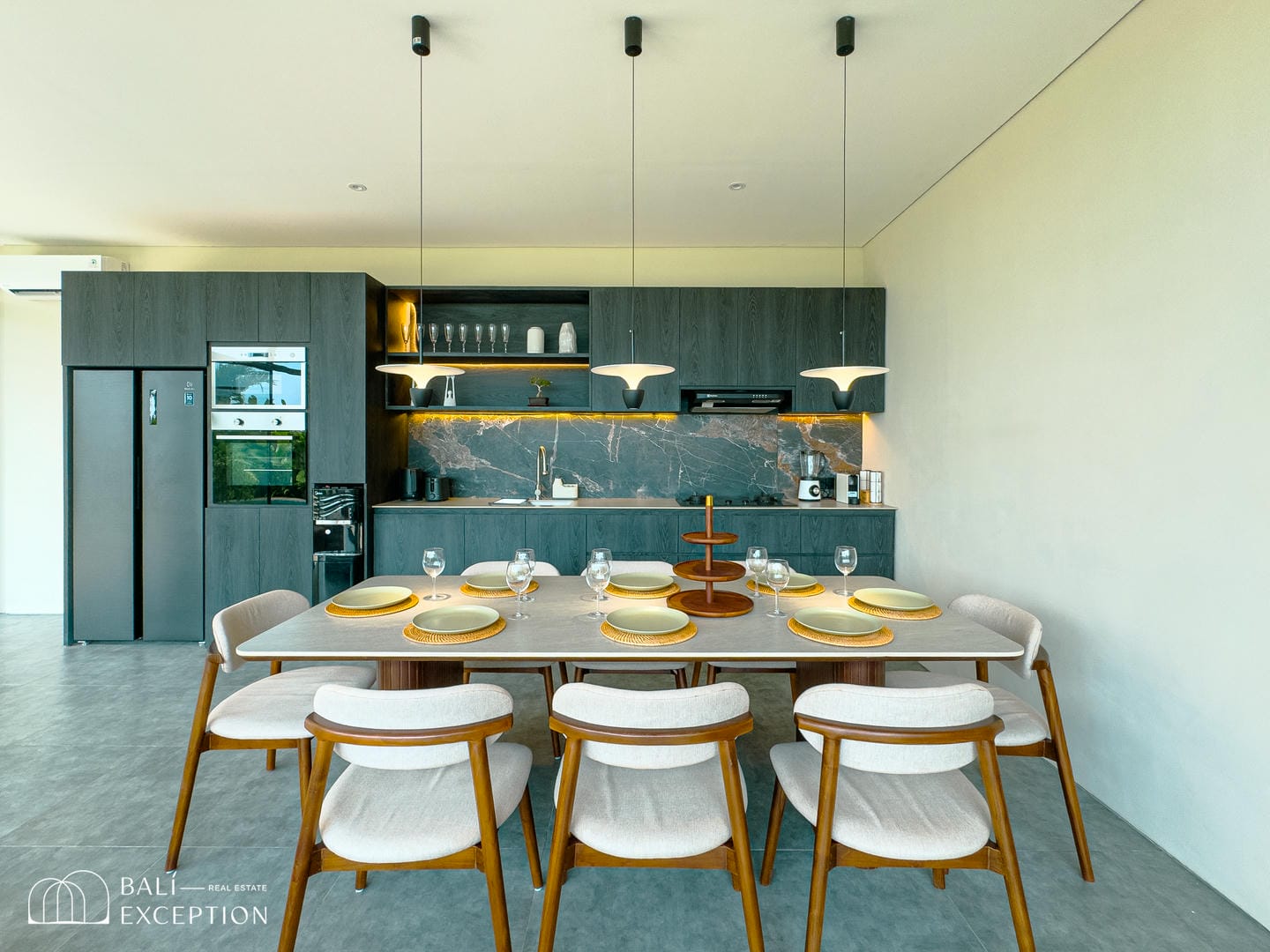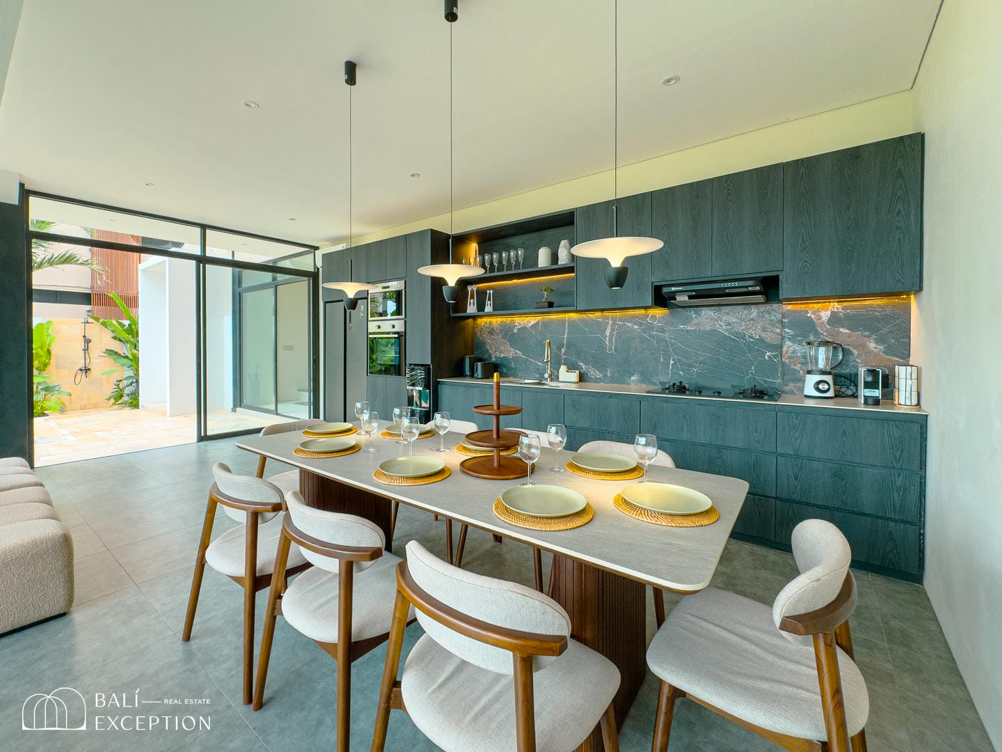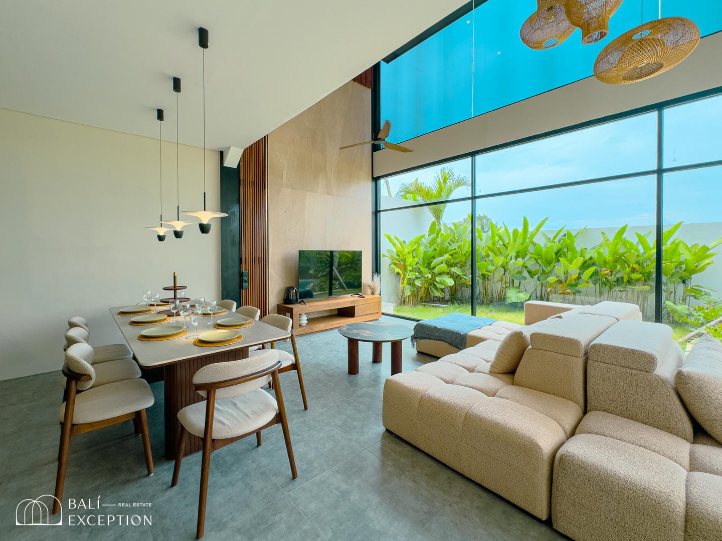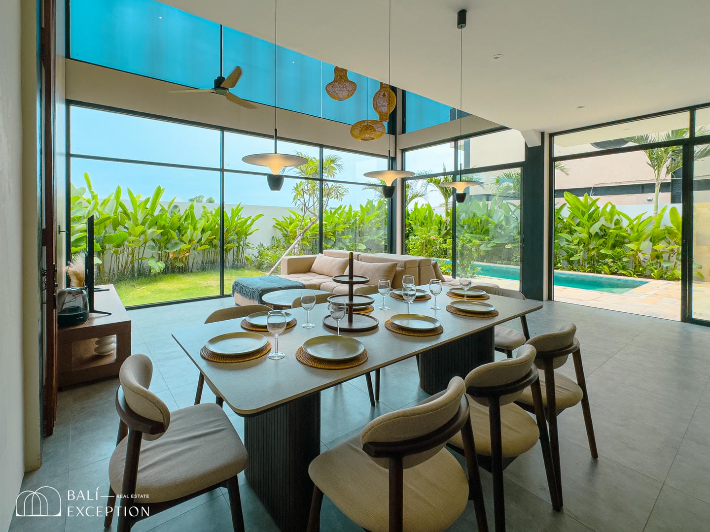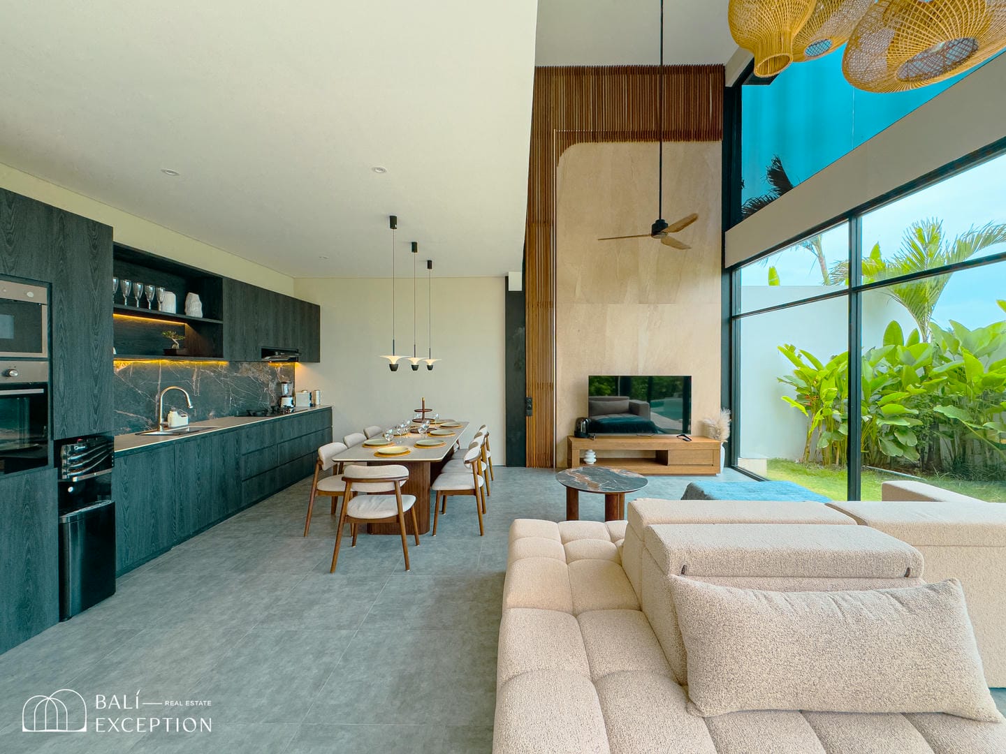 Cette villa entièrement meublée présente un design moderne et élégant sur trois étages spacieux. Conçue avec de grandes baies vitrées et de hauts plafonds, elle est lumineuse et aérée dans toutes les pièces. La cuisine est entièrement équipée et dispose d’une grande table à manger, idéale pour recevoir. Le salon confortable est aménagé avec un canapé et un ventilateur de plafond, offrant une vue relaxante sur l’espace extérieur. La villa comprend quatre chambres, chacune avec son propre balcon et salle de bain attenante, garantissant intimité et confort à tous les invités.