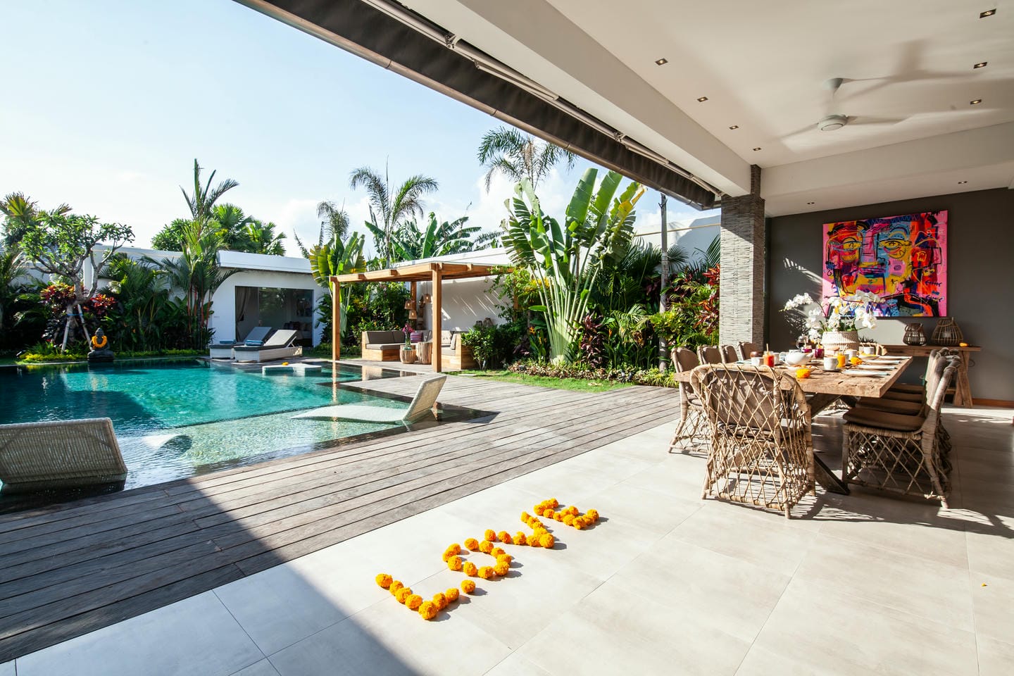 Entrez dans l’espace extérieur avec une grande piscine privée au centre, entourée d’une terrasse en bois, de transats et d’un cabanon. Cet espace est parfait pour se relaxer et profiter pleinement de la villa.