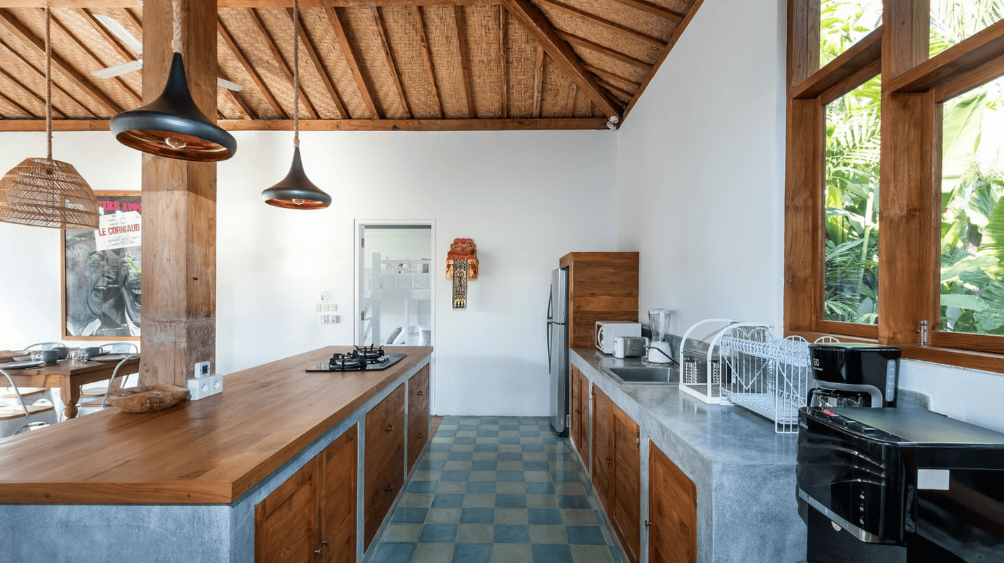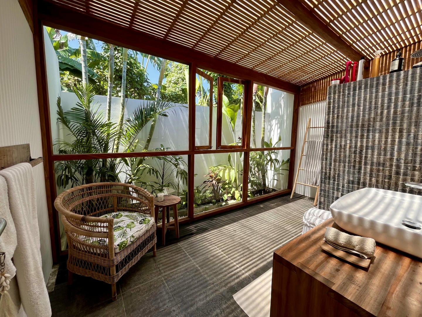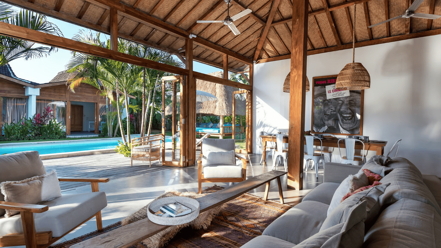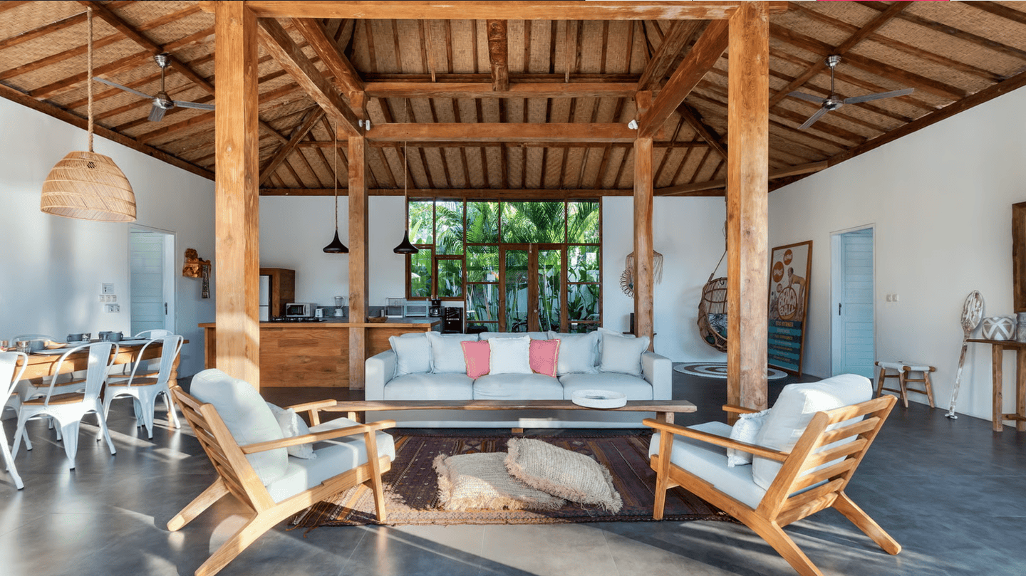 L’espace de vie est conçu comme un pavillon spacieux en open space avec une ambiance tropicale chaleureuse, comprenant de hauts plafonds en bois, des poutres apparentes et des textures naturelles qui créent une atmosphère à la fois détendue et raffinée. De larges ouvertures relient harmonieusement l’intérieur à l’extérieur, permettant à la lumière naturelle et à la brise tropicale de circuler librement, tandis que la connexion fluide avec la salle à manger et la cuisine améliore à la fois la fonctionnalité et le confort au quotidien. La villa comprend quatre chambres, chacune avec sa propre salle de bain attenante, offrant confort et intimité aux résidents comme aux invités.
