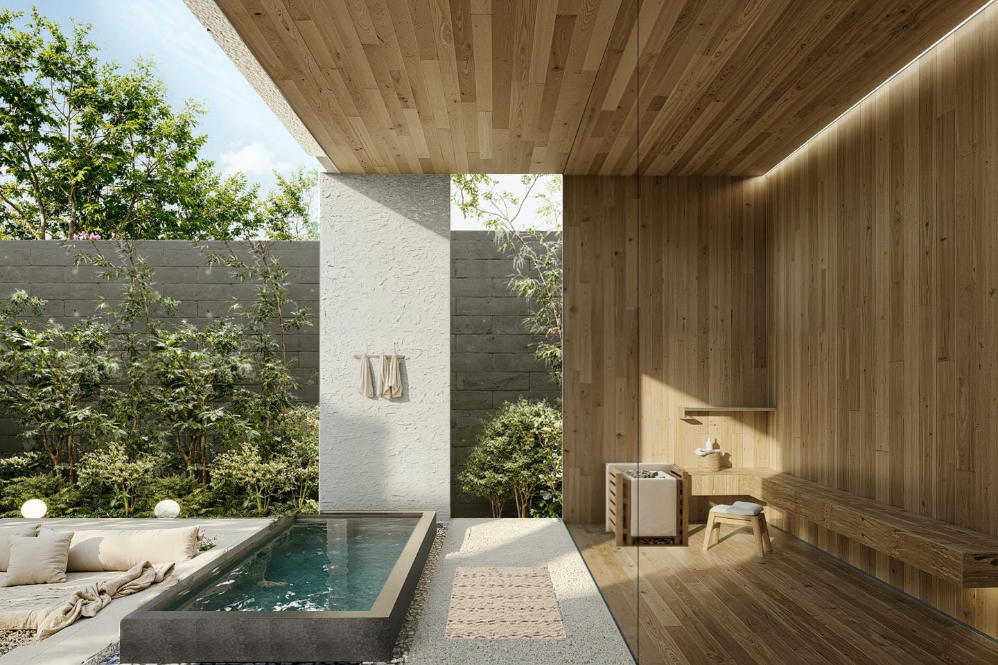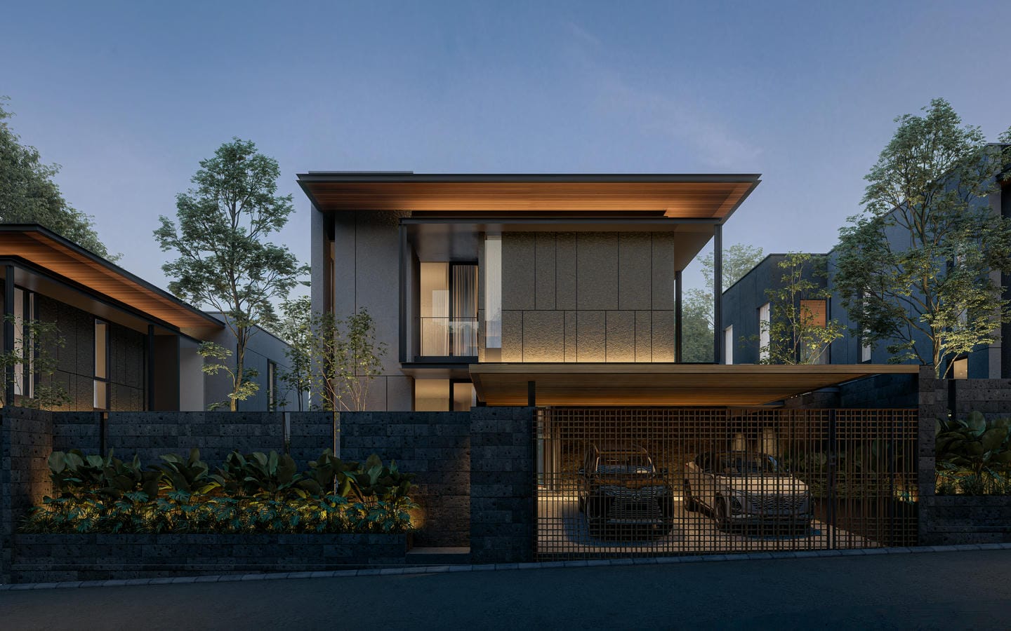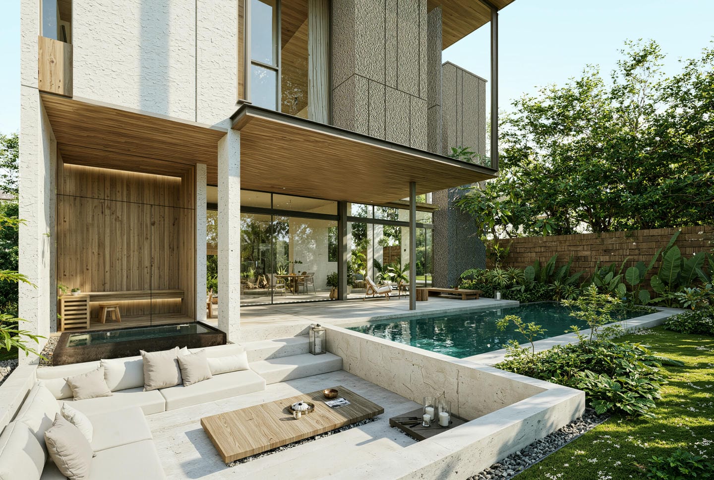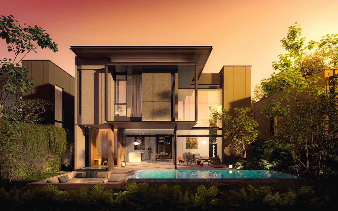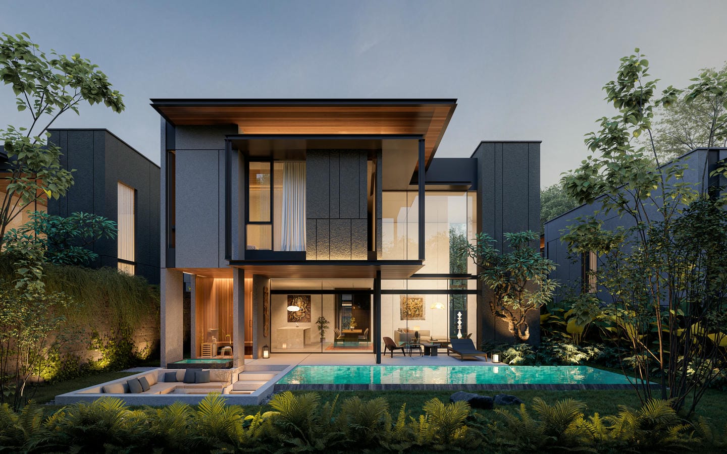 À l’extérieur, la villa offre un jardin paysager luxuriant complété par une piscine à débordement, un bassin froid revitalisant et un sauna. Un sunken lounge crée un espace serein pour se détendre ou socialiser au cœur de la nature, tandis que de généreuses terrasses et un parking privé renforcent le confort au quotidien.