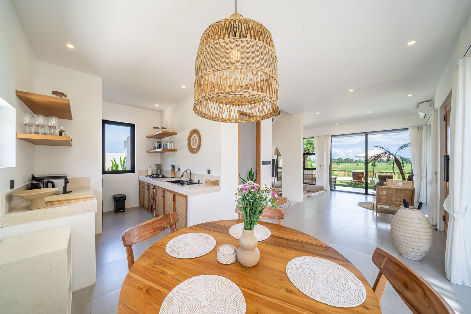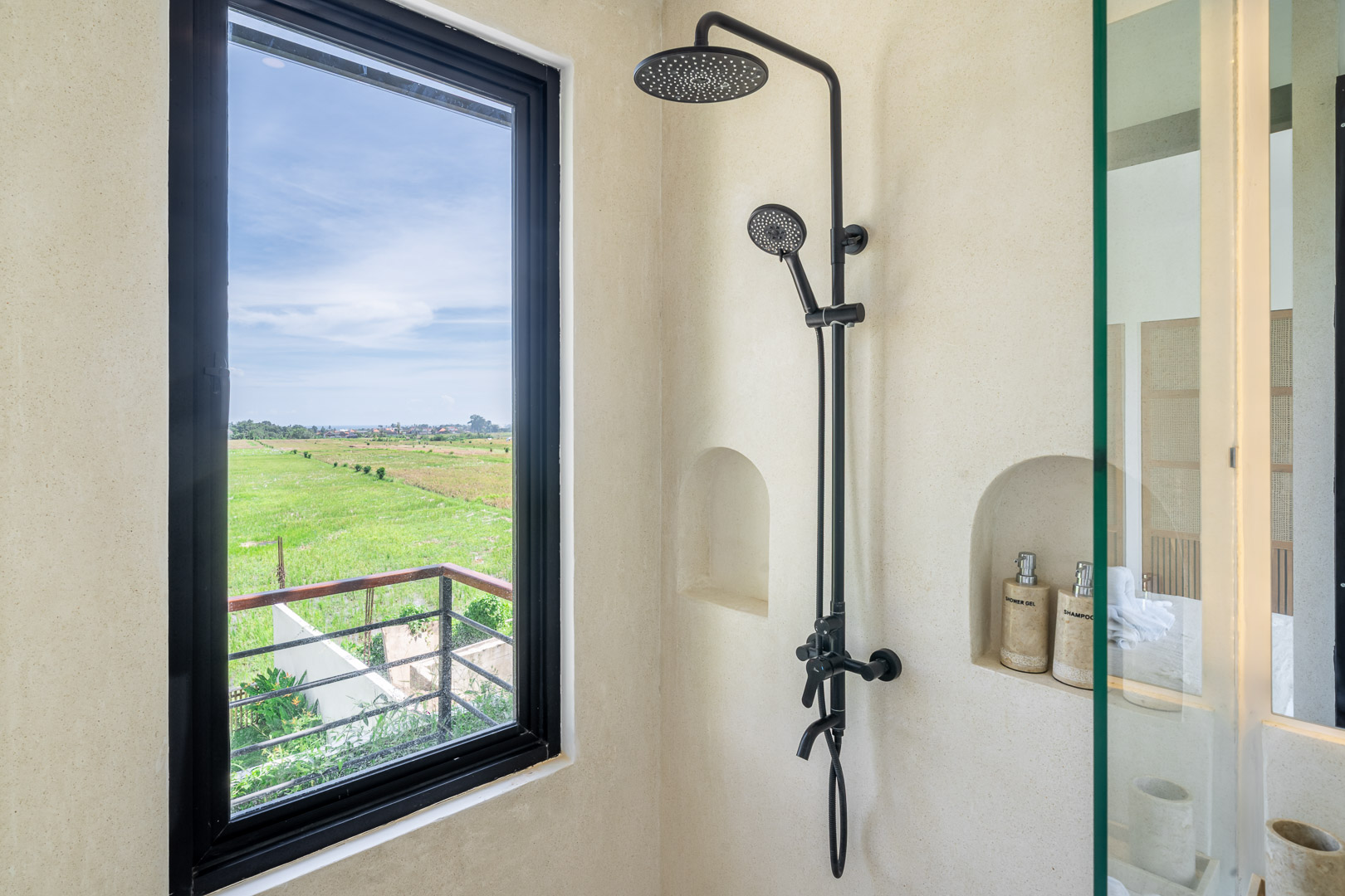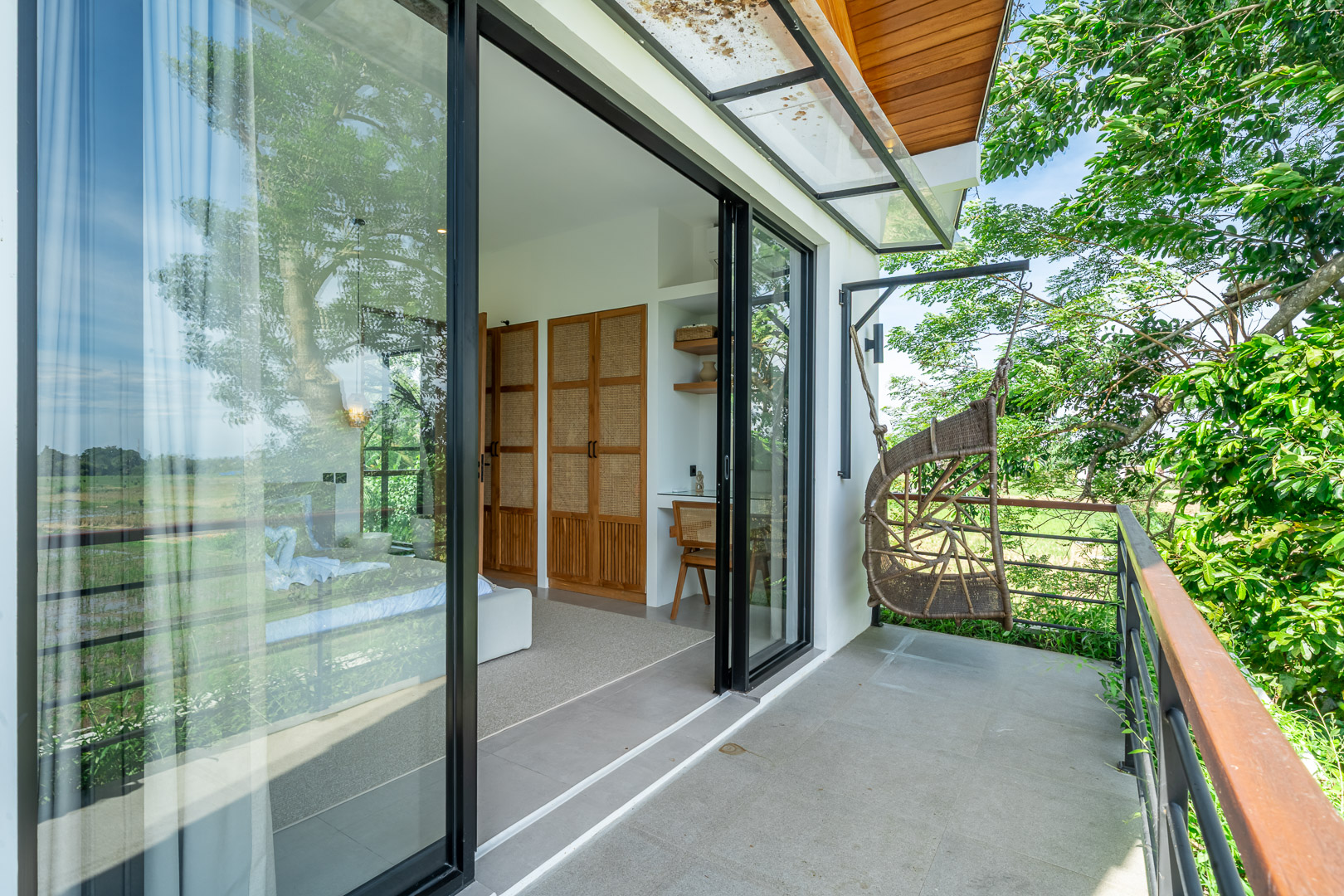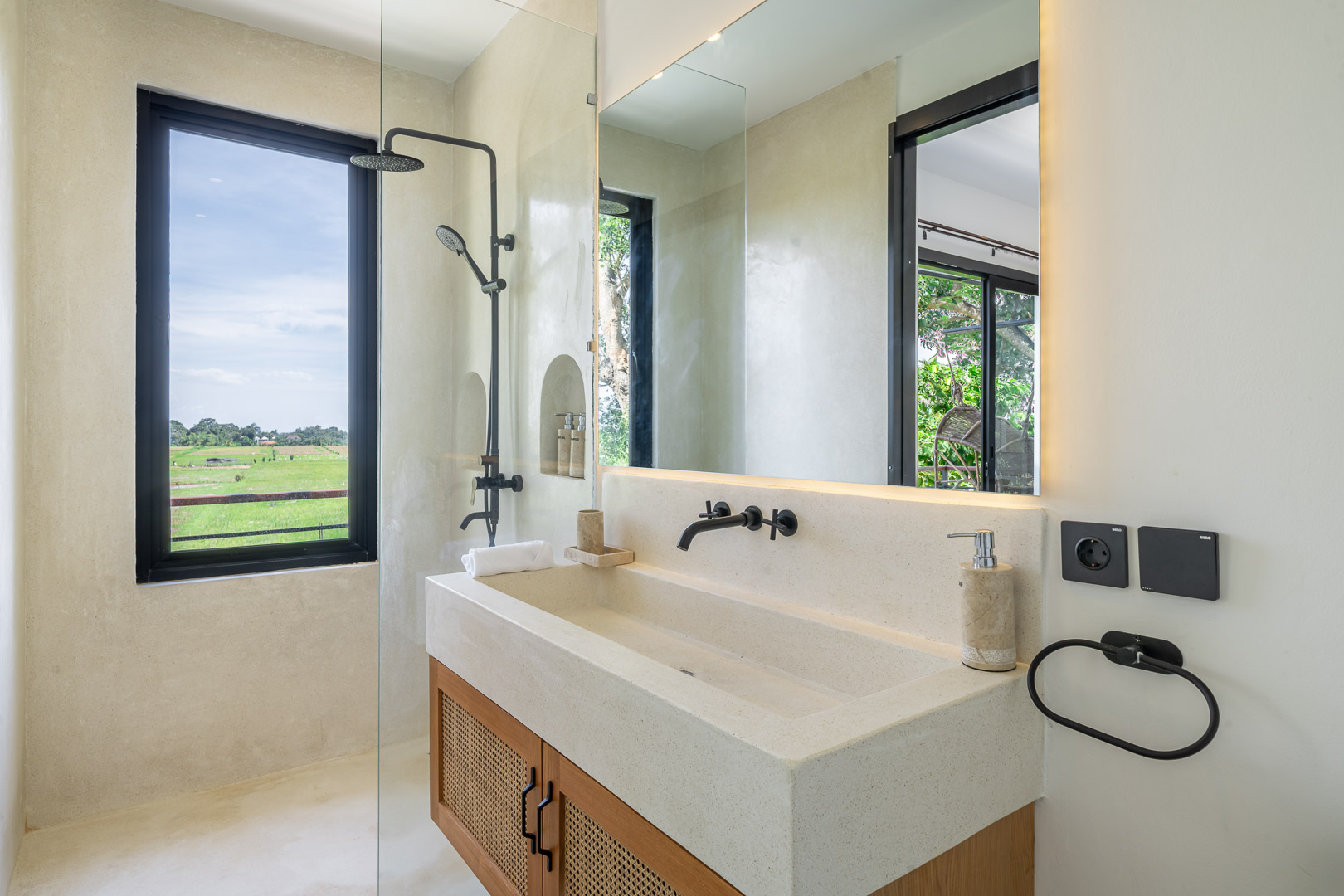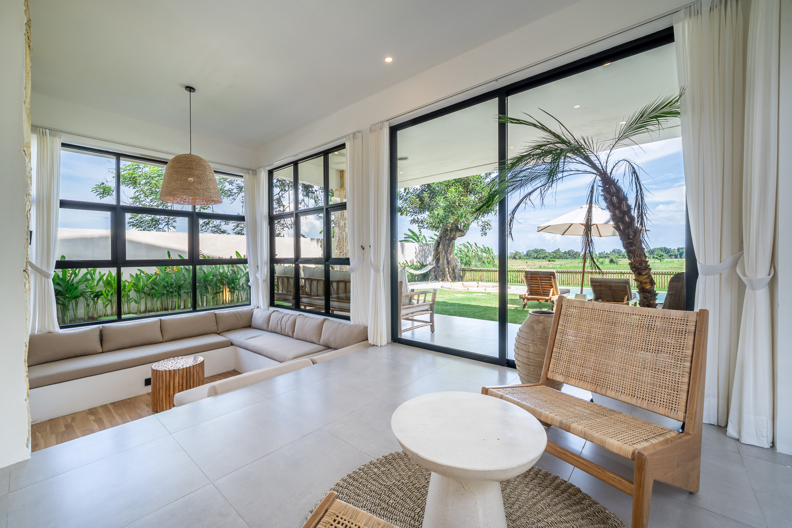 Cette villa propose un concept de vie tropical moderne avec un agencement lumineux et ouvert, utilisant des matériaux naturels tels que le bois et la pierre pour créer une atmosphère chaleureuse et confortable. De grandes fenêtres et des portes coulissantes laissent entrer une abondante lumière naturelle et relient l’espace de vie à la verdure et aux vues sur les rizières. L’espace salon en contrebas offre un coin cosy pour se détendre et profiter du cadre. La villa dispose de 3 chambres et 3 salles de bains, et la chambre principale possède un balcon privé avec vue sur les rizières.